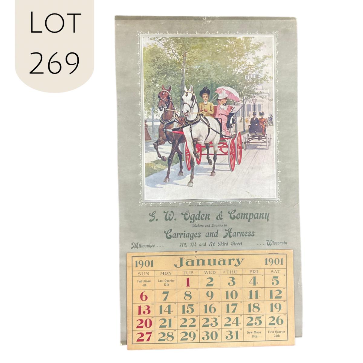 This calendar was compliments of the G W Ogden & Company, Makers and Dealers in Carriage and Harnesses, located In Milwaukee Wisconsin. This calendar features a picture of people riding along the street one in a carriage with horses, another with a car (boring), titled "A Spring Day". This calendar is complete, and shows January 1901. This calendar measures 11 1/2” x 20 7/8”. **|** Please see photos for details and condition. ::: Shipping is available on this lot. If you require shipping you must let us know at the close of the auction. We will coordinate with you after the item has been won. Shipping fees will include insurance up to or exceeding the value of all items being mailed. If you have any questions regarding this lot please contact the auctioneer either via this website, by direct email or by phone. PICK UP TIMES and other important information can be found in the TERMS and DESCRIPTION of the auction. Please take a look for pertinent information. Thanks!