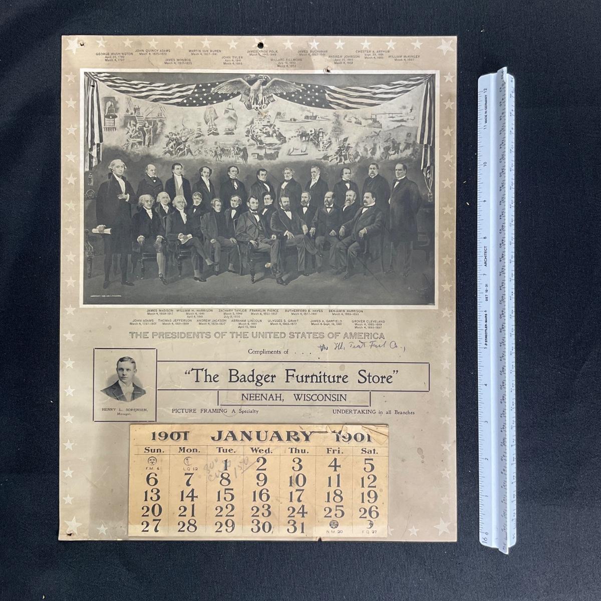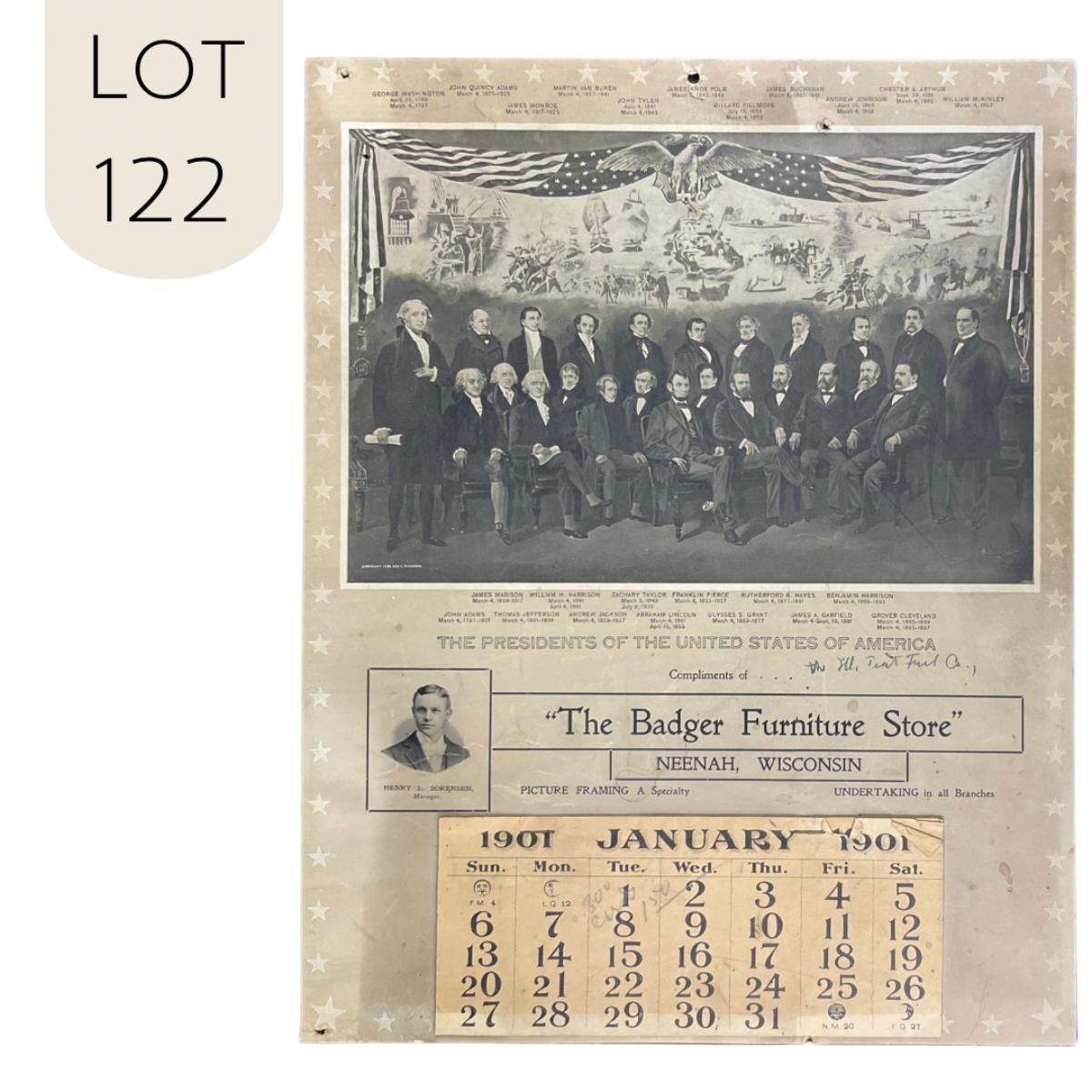 This calendar was courtesy of The Badger Furniture Store, located in Neenah Wisconsin. This furniture store also specialized in Picture Framing, and Undertaking was taken care of at all Branches. This calendar is complete, showing January 1901. This calendar features a picture of the Presidents of the United States (Washington - Cleveland), original accredited to George L Richards, copyright 1899. This calendar measures 10 3/4" x 13 3/4". **|** Please see photos for details and condition. ::: Shipping is available on this lot. If you require shipping you must let us know at the close of the auction. We will coordinate with you after the item has been won. Shipping fees will include insurance up to or exceeding the value of all items being mailed. If you have any questions regarding this lot please contact the auctioneer either via this website, by direct email or by phone. PICK UP TIMES and other important information can be found in the TERMS and DESCRIPTION of the auction. Please take a look for pertinent information. Thanks!