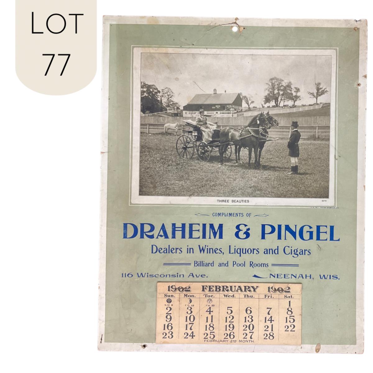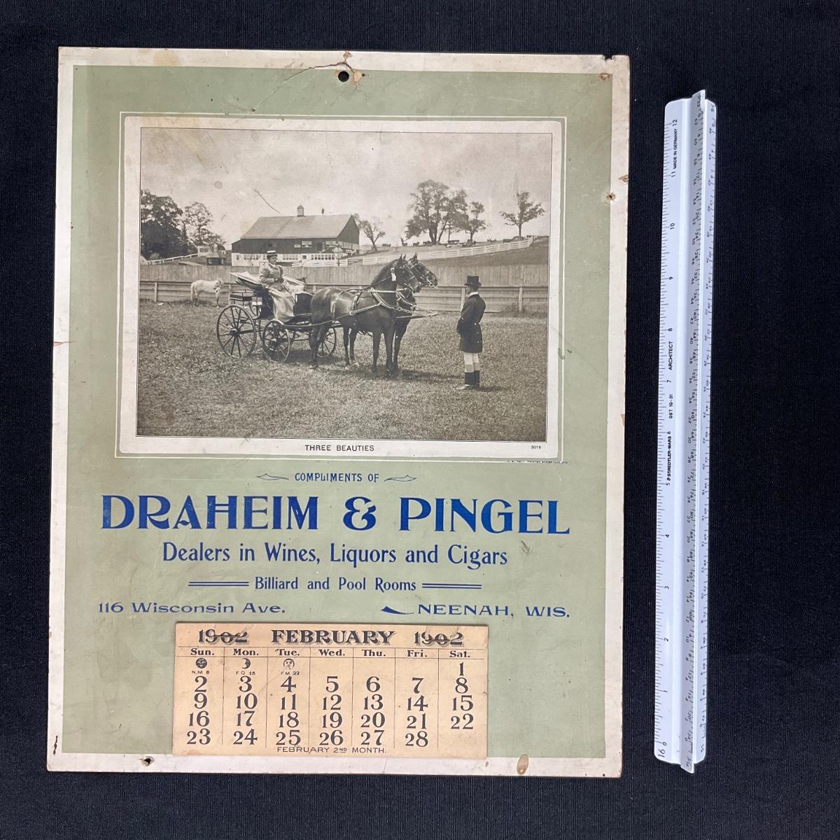 This calendar was compliments of Draheim & Pingel, dealers in Wines, Liquors and Cigars. They also had Billiard and Pool Rooms. This calendar features a photo titled Three Beauties, depicting a farm scene with women in a horse-drawn buggy. The calendar is incomplete, showing February 1902. The calendar was printed by A W Pott in Sheboygan, WI. This calendar measures 11" x 13 7/8". **|** Please see photos for details and condition. ::: Shipping is available on this lot. If you require shipping you must let us know at the close of the auction. We will coordinate with you after the item has been won. Shipping fees will include insurance up to or exceeding the value of all items being mailed. If you have any questions regarding this lot please contact the auctioneer either via this website, by direct email or by phone. PICK UP TIMES and other important information can be found in the TERMS and DESCRIPTION of the auction. Please take a look for pertinent information. Thanks!