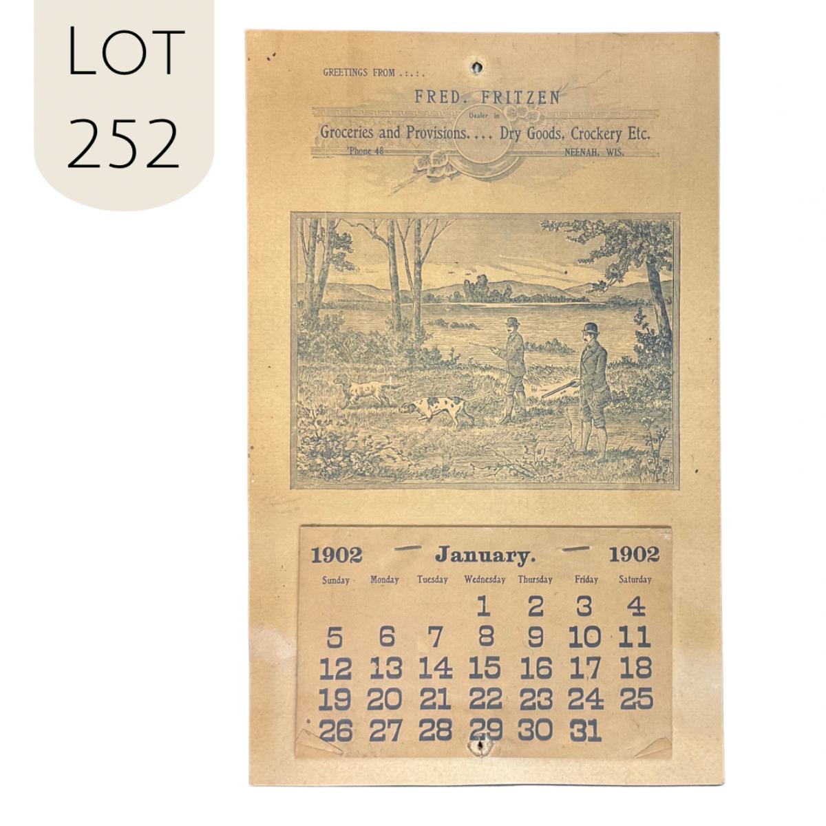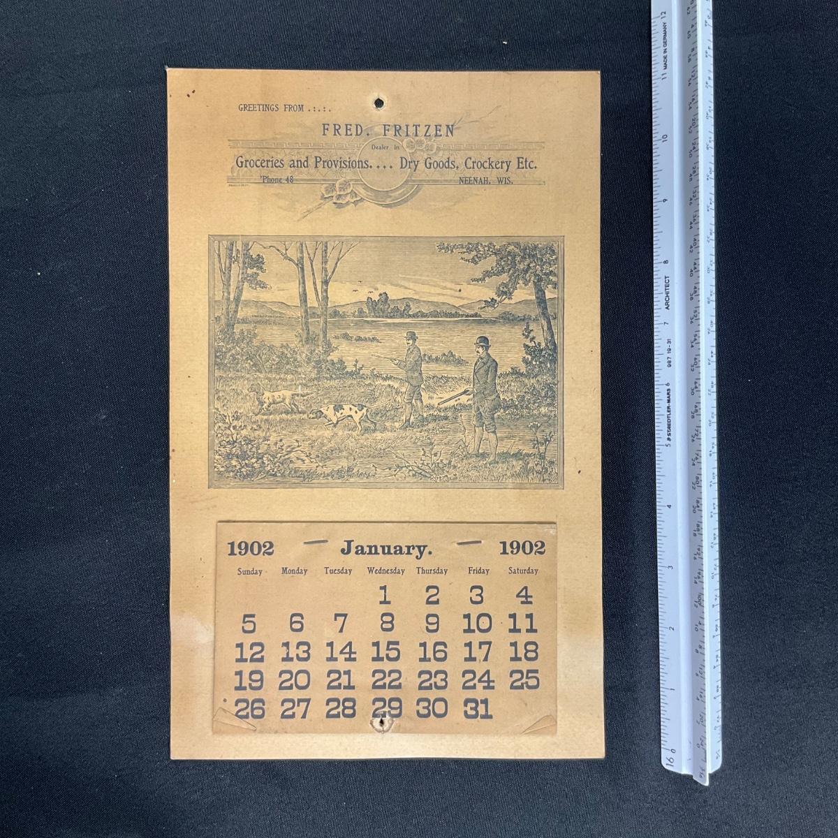 This calendar was compliments of Fred Fritzen, dealer in Groceris and Provisions, Dry goods, Crockery Etc - Located in Neenah, Wisconsin. This calendar features a hunting scene with men and their dogs, no artist is noted. This calendar is complete, showing January 1902. This calendar measures 7 1/8" x 11 1/4". **|** Please see photos for details and condition. ::: Shipping is available on this lot. If you require shipping you must let us know at the close of the auction. We will coordinate with you after the item has been won. Shipping fees will include insurance up to or exceeding the value of all items being mailed. If you have any questions regarding this lot please contact the auctioneer either via this website, by direct email or by phone. PICK UP TIMES and other important information can be found in the TERMS and DESCRIPTION of the auction. Please take a look for pertinent information. Thanks!