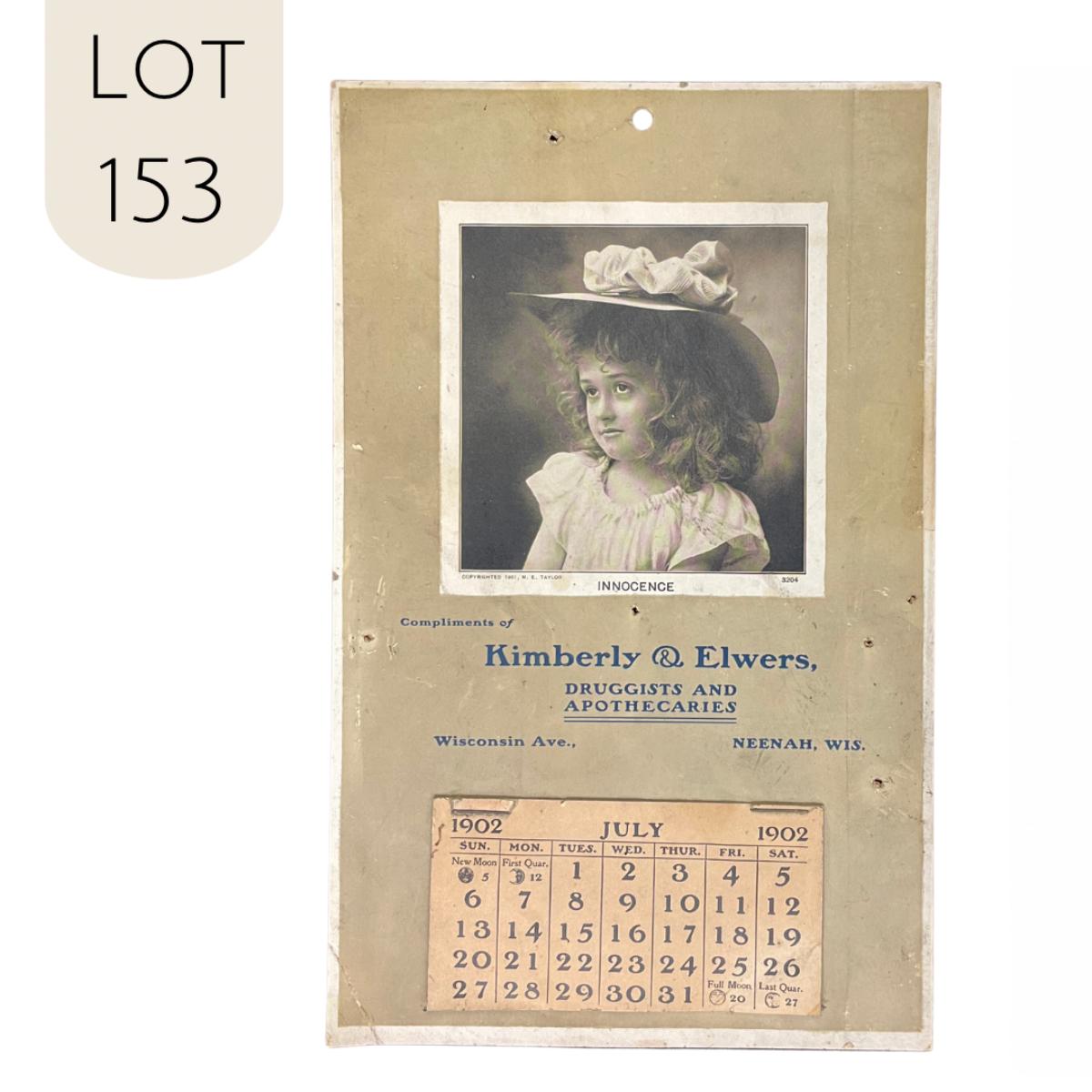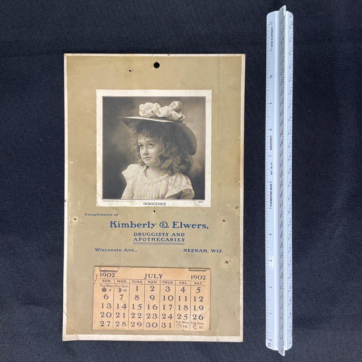 This calendar was compliments of Kimberly & Elwers, Druggists and Apothecaries, located on Wisconsin Avenue in Neenah, Wisconsin. The calendar features a picture titled "Innocence", which depicts a little girl wearing a large hat, copyright 1901, M E Taylor. This calendar is incomplete, showing July 1902. This calendar measures 7" x 11". **|** Please see photos for details and condition. ::: Shipping is available on this lot. If you require shipping you must let us know at the close of the auction. We will coordinate with you after the item has been won. Shipping fees will include insurance up to or exceeding the value of all items being mailed. If you have any questions regarding this lot please contact the auctioneer either via this website, by direct email or by phone. PICK UP TIMES and other important information can be found in the TERMS and DESCRIPTION of the auction. Please take a look for pertinent information. Thanks!