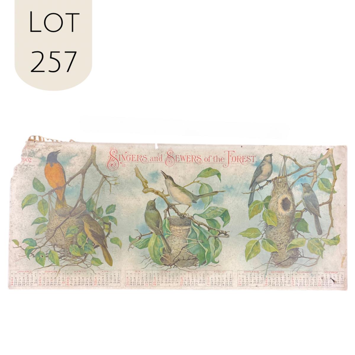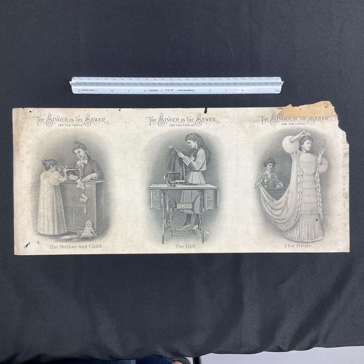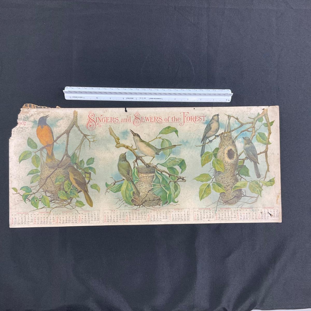 This two-sided calendar by Singer Sewing Machines was made to promote their 51st year in business. The calendar features pictures of three "Singers of the Forest with their ornate nests. The reverse shows three women, each working on their own project with a Singer Sewing Machine. This calendar is a one-sheet and is complete. This calendar measures 20 5/8”x 9”. **|** Please see photos for details and condition. ::: Shipping is available on this lot. If you require shipping you must let us know at the close of the auction. We will coordinate with you after the item has been won. Shipping fees will include insurance up to or exceeding the value of all items being mailed. If you have any questions regarding this lot please contact the auctioneer either via this website, by direct email or by phone. PICK UP TIMES and other important information can be found in the TERMS and DESCRIPTION of the auction. Please take a look for pertinent information. Thanks!
