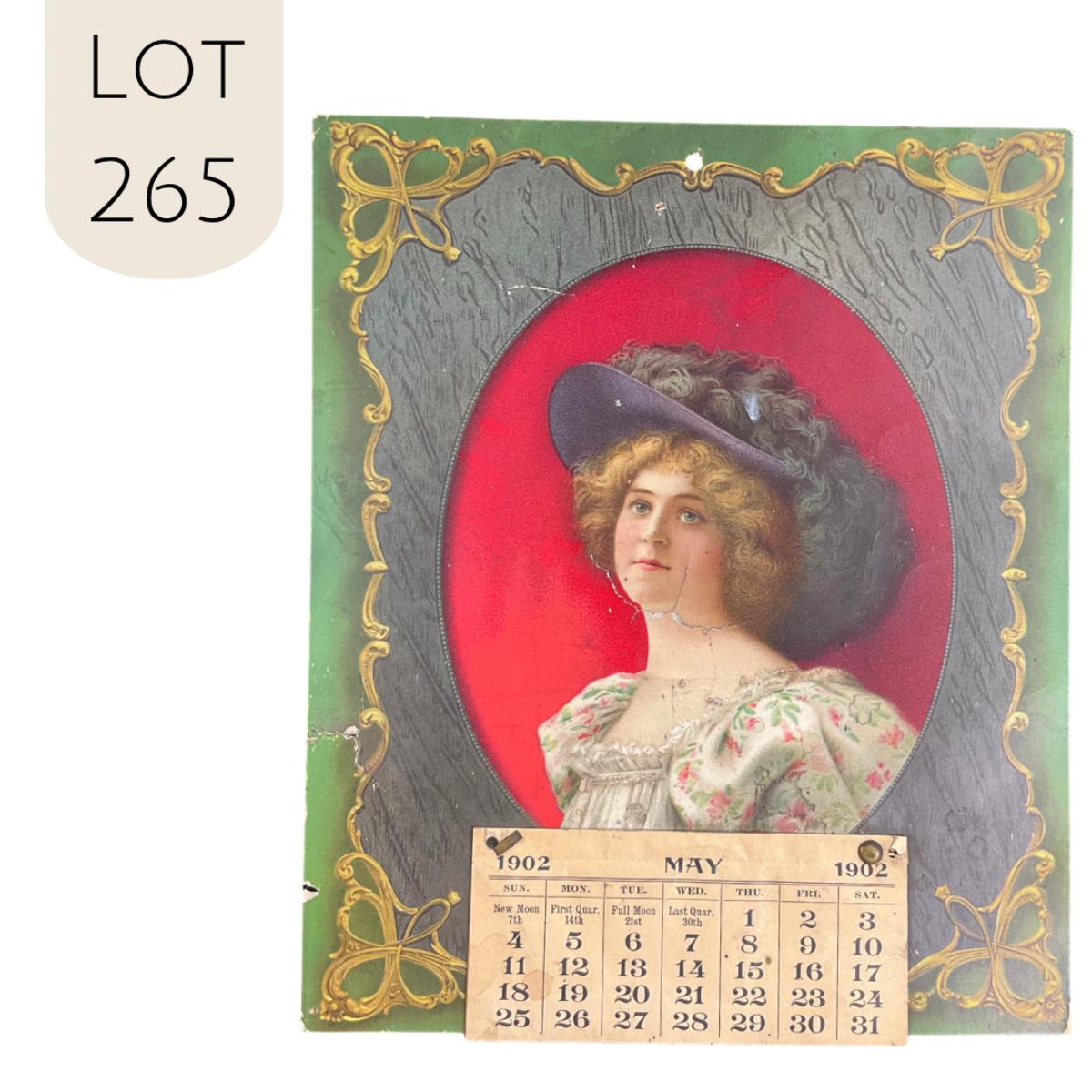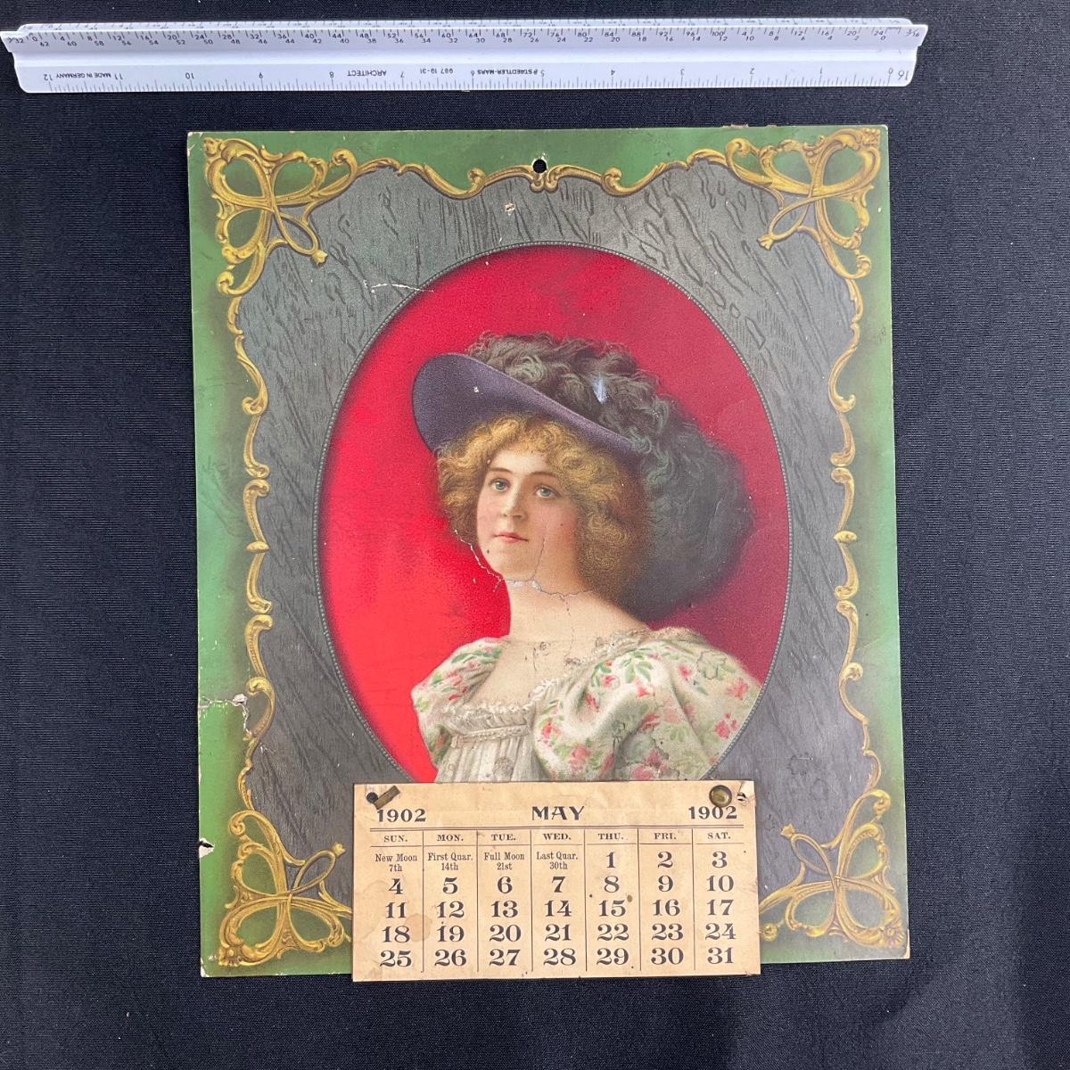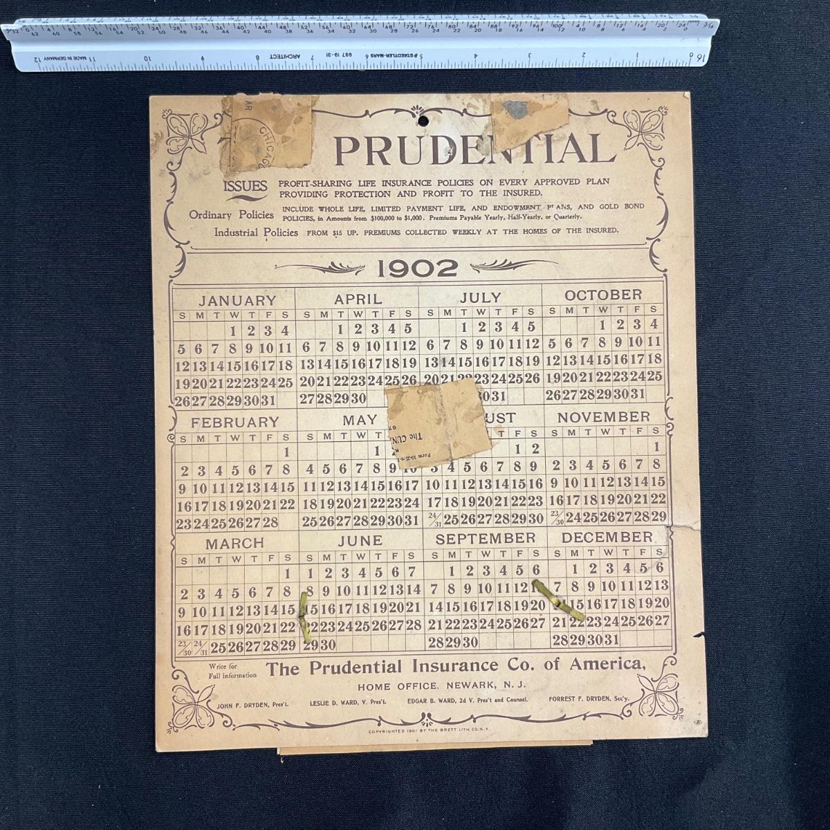 This calendar was made to promote the Prudential Insurance Company of America, based in Newark New Jersey. This calendar features a portrait of a young woman wearing a hat - I think this one kind of looks like my mom. This calendar is incomplete, on the front, showing May 1902. There is a complete calendar on the reverse, with some additional insurance information. This calendar measures 10" x 11 7/8". **|** Please see photos for details and condition. ::: Shipping is available on this lot. If you require shipping you must let us know at the close of the auction. We will coordinate with you after the item has been won. Shipping fees will include insurance up to or exceeding the value of all items being mailed. If you have any questions regarding this lot please contact the auctioneer either via this website, by direct email or by phone. PICK UP TIMES and other important information can be found in the TERMS and DESCRIPTION of the auction. Please take a look for pertinent information. Thanks!