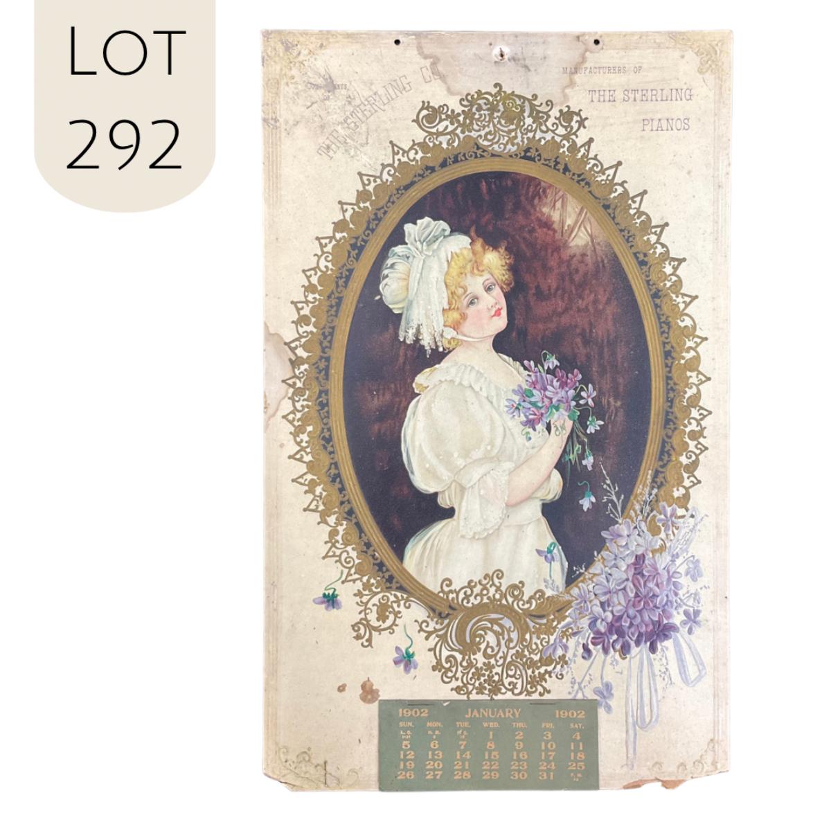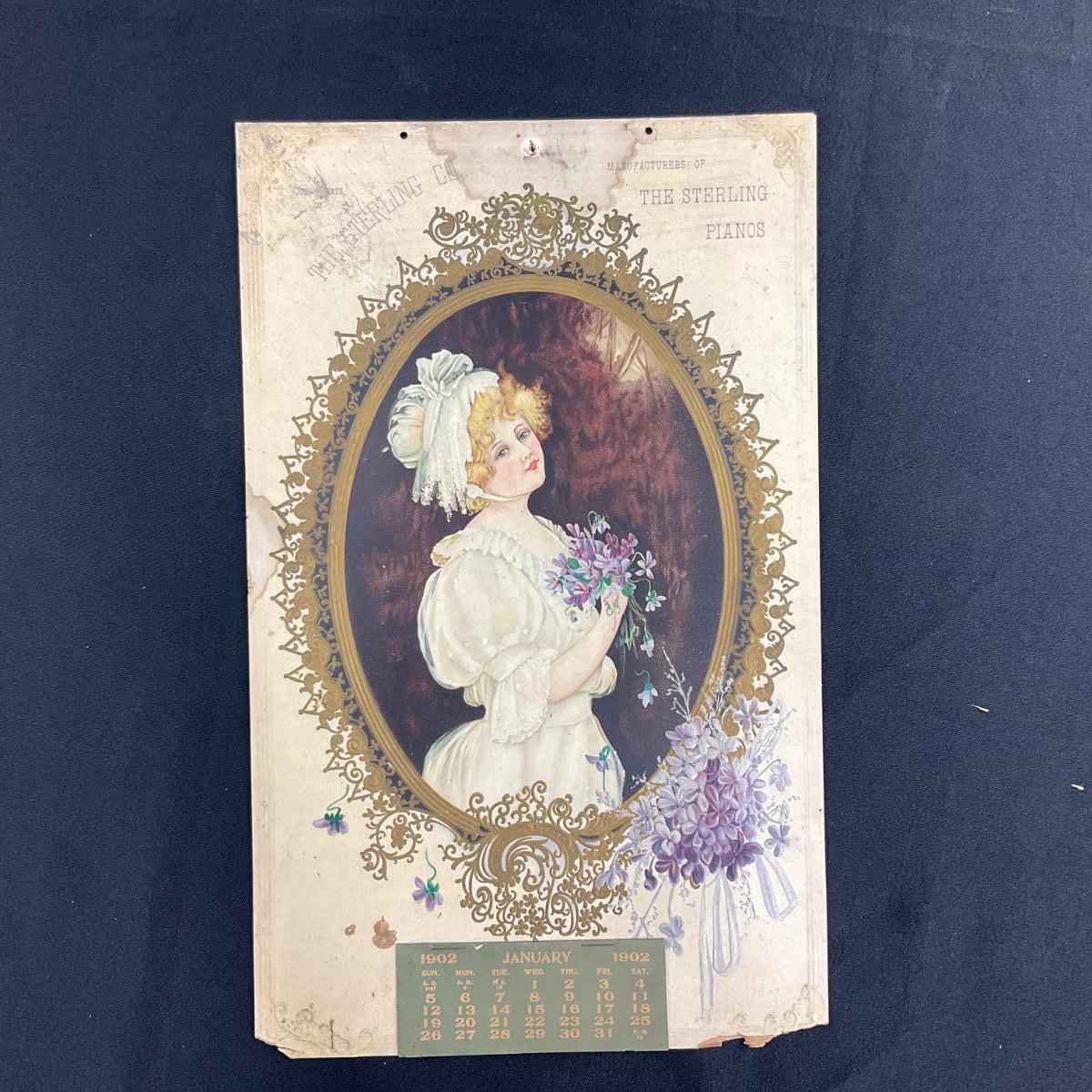 This calendar was compliments of The Sterling Company, Manufactureres of The Sterling Pianos. This calendar features a picture of a young girl in a white outfit holding violets. This calendar is complete, showing January 1902. This calendar measures 10 1/2" x 17". **|** Please see photos for details and condition. ::: Shipping is available on this lot. If you require shipping you must let us know at the close of the auction. We will coordinate with you after the item has been won. Shipping fees will include insurance up to or exceeding the value of all items being mailed. If you have any questions regarding this lot please contact the auctioneer either via this website, by direct email or by phone. PICK UP TIMES and other important information can be found in the TERMS and DESCRIPTION of the auction. Please take a look for pertinent information. Thanks!