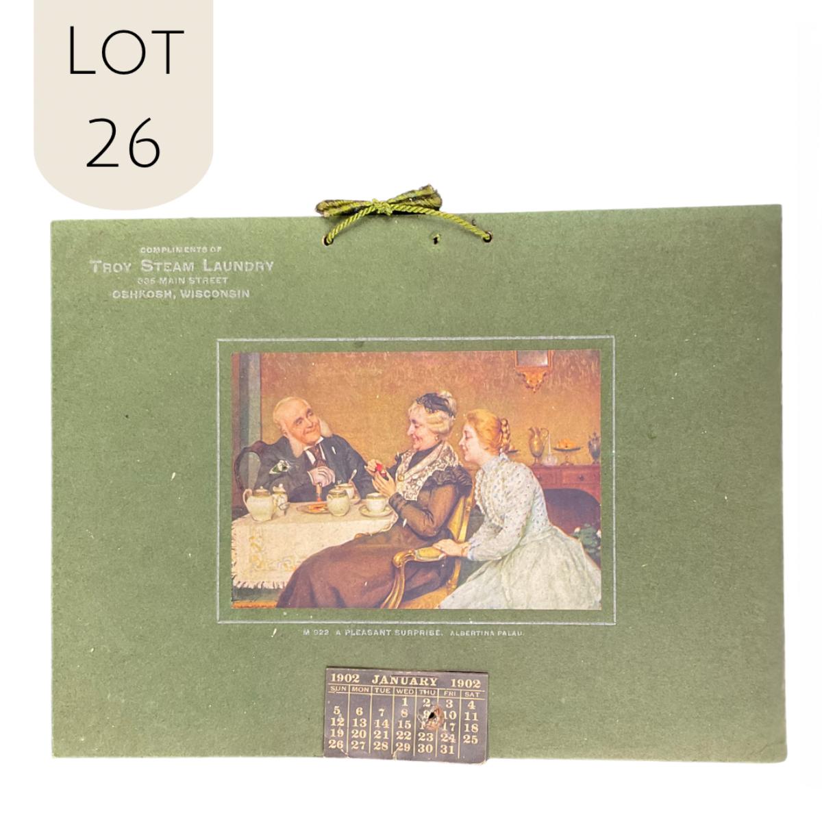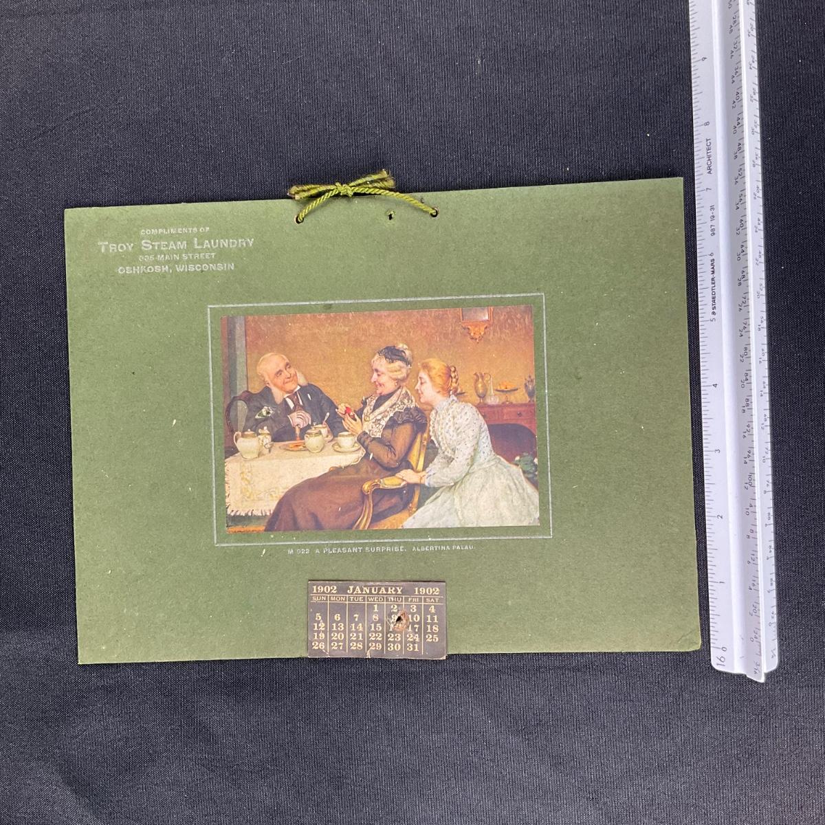 This calendar, promoting Troy Steam Laundry in Oshkosh Wisconsin features a picture titled "A Pleasant Surprise" Original by Albertina Palau. The painting shows an older couple at a table, her opening up a rex box holding a ring (we assume) and a younger person, perhaps their daughter, admiring over her mother's shoulder. Finally, he did something nice for her. Calendar is in exceptional condition and is complete, showing January 1902. Calendar Measures 9 3/4" x 7 1/4". **|** Please see photos for details and condition. ::: Shipping is available on this lot. If you require shipping you must let us know at the close of the auction. We will coordinate with you after the item has been won. Shipping fees will include insurance up to or exceeding the value of all items being mailed. If you have any questions regarding this lot please contact the auctioneer either via this website, by direct email or by phone. PICK UP TIMES and other important information can be found in the TERMS and DESCRIPTION of the auction. Please take a look for pertinent information. Thanks!