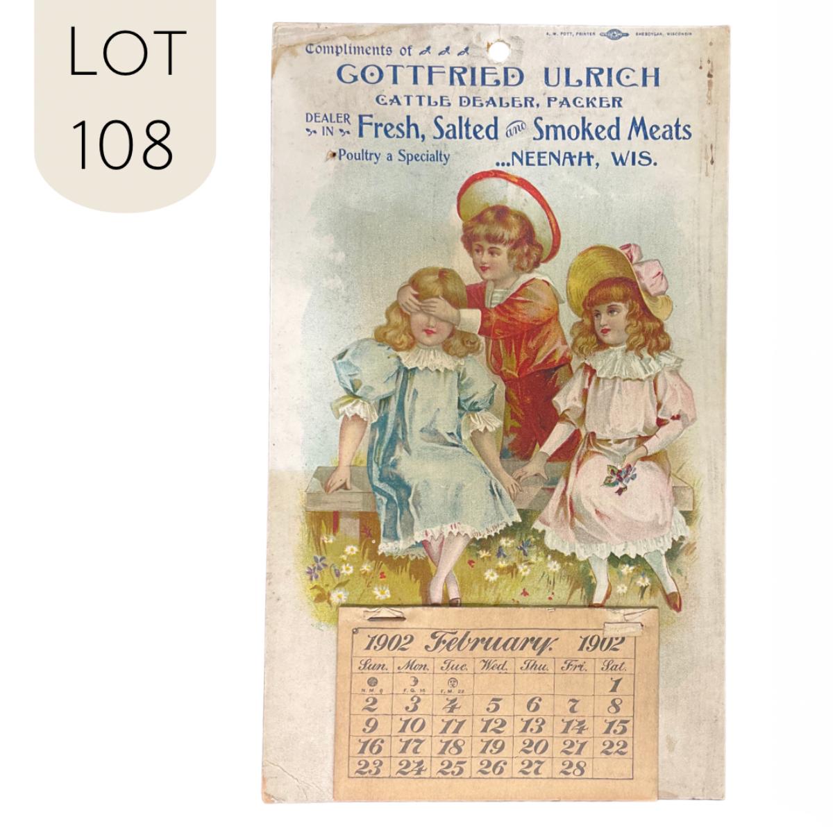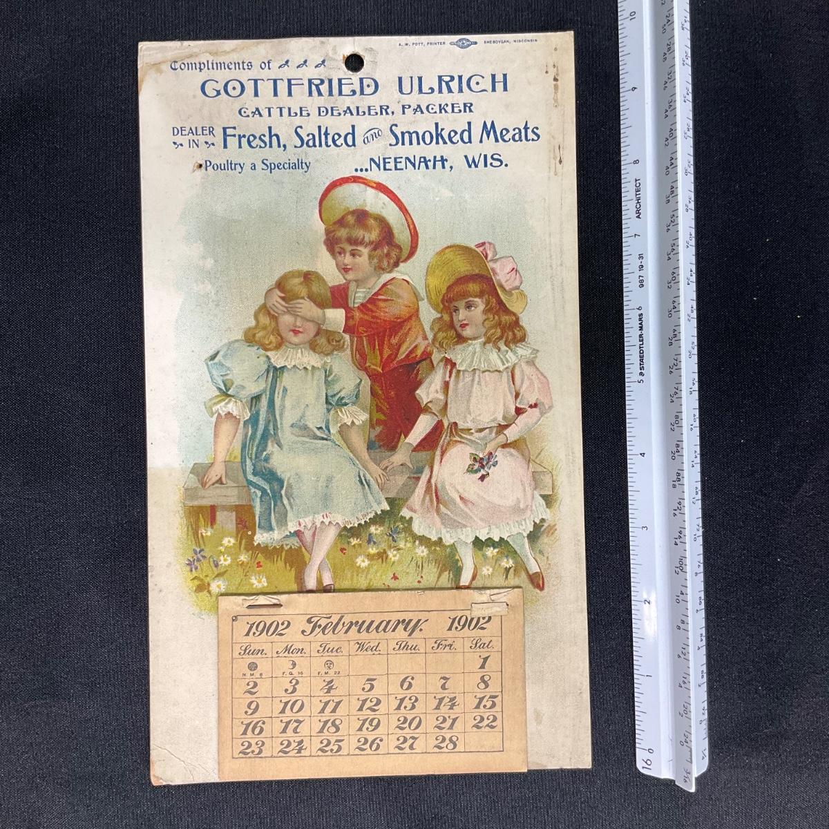 This calendar was compliments of Gottfried Ulrich, Cattle Dealer and Packer. Dealer in Fresh, Salted AND Smoked Meats. He specialized in Poultry, and was located in Neenah WI. The calendar features a picture of three victorian children, two girls on a bench, with a boy covering the eyes of one girl. This calendar was produced by A W Pott of Sheboygan WI. This calendar is incomplete, showing February 1902. This calendar measures 6" x 10". **|** Please see photos for details and condition. ::: Shipping is available on this lot. If you require shipping you must let us know at the close of the auction. We will coordinate with you after the item has been won. Shipping fees will include insurance up to or exceeding the value of all items being mailed. If you have any questions regarding this lot please contact the auctioneer either via this website, by direct email or by phone. PICK UP TIMES and other important information can be found in the TERMS and DESCRIPTION of the auction. Please take a look for pertinent information. Thanks!