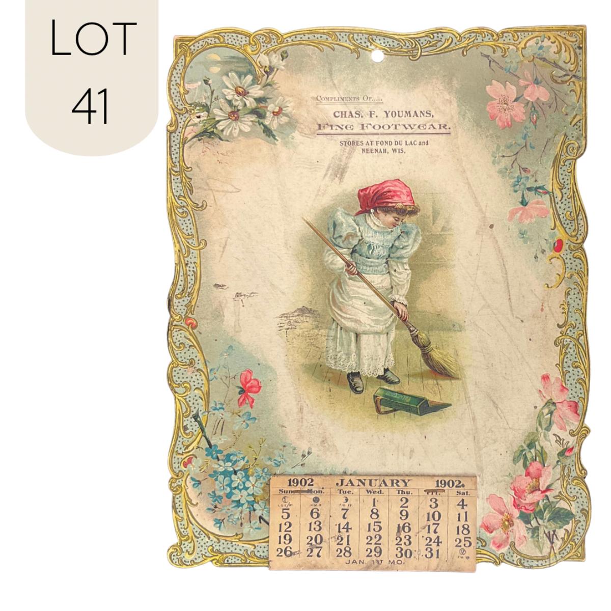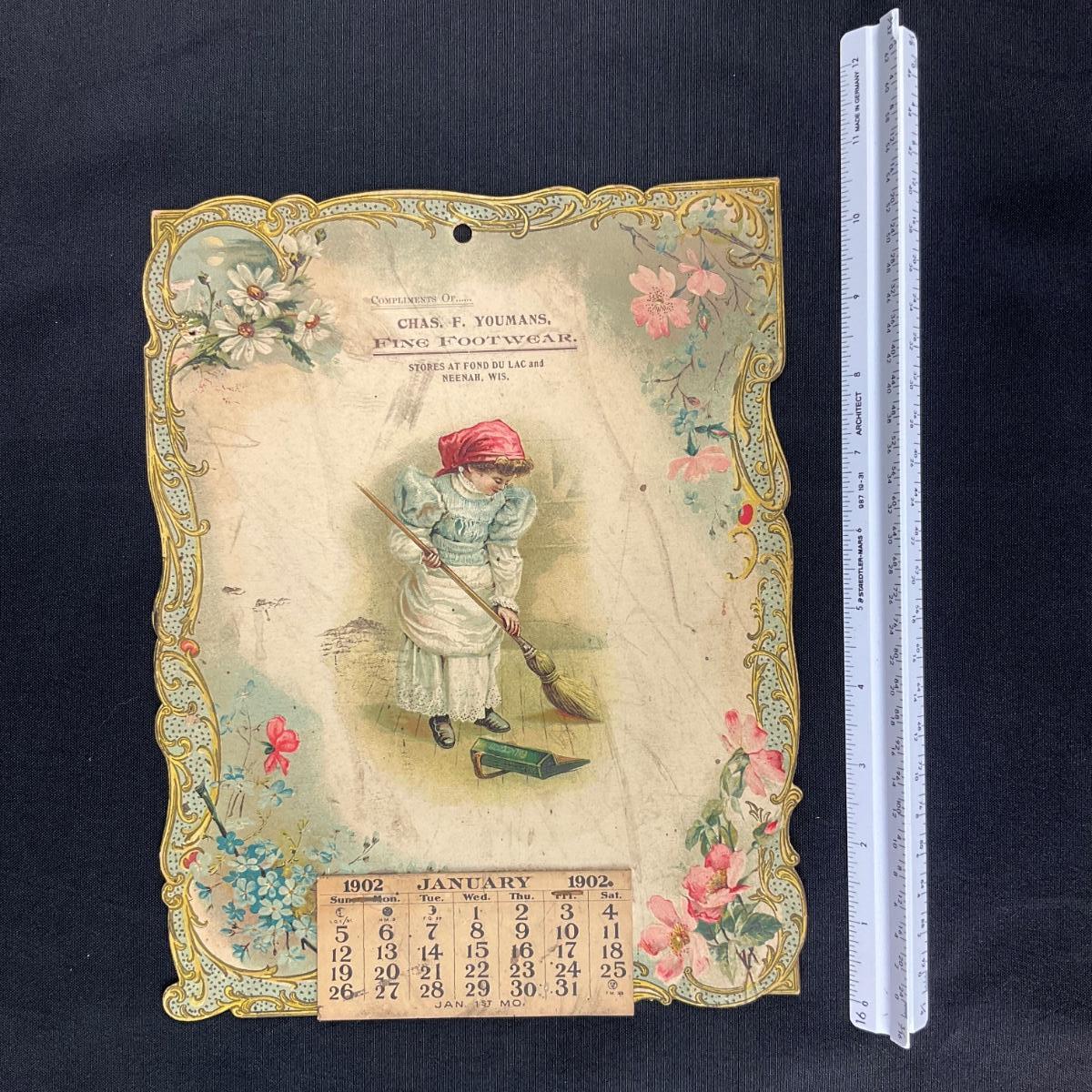 This Die Cut Calendar features a young girl with her hair tied up in a kerchief and an apron on, sweeping up dirt into a pan. Which makes me think of... Can F Youmans Fine Footwear, located in both Fond du Lac and Neenah Wisconsin. This calendar is complete, Showing January 1902. This calendar measures 8 1/4" x 10 1/2". **|** Please see photos for details and condition. ::: Shipping is available on this lot. If you require shipping you must let us know at the close of the auction. We will coordinate with you after the item has been won. Shipping fees will include insurance up to or exceeding the value of all items being mailed. If you have any questions regarding this lot please contact the auctioneer either via this website, by direct email or by phone. PICK UP TIMES and other important information can be found in the TERMS and DESCRIPTION of the auction. Please take a look for pertinent information. Thanks!