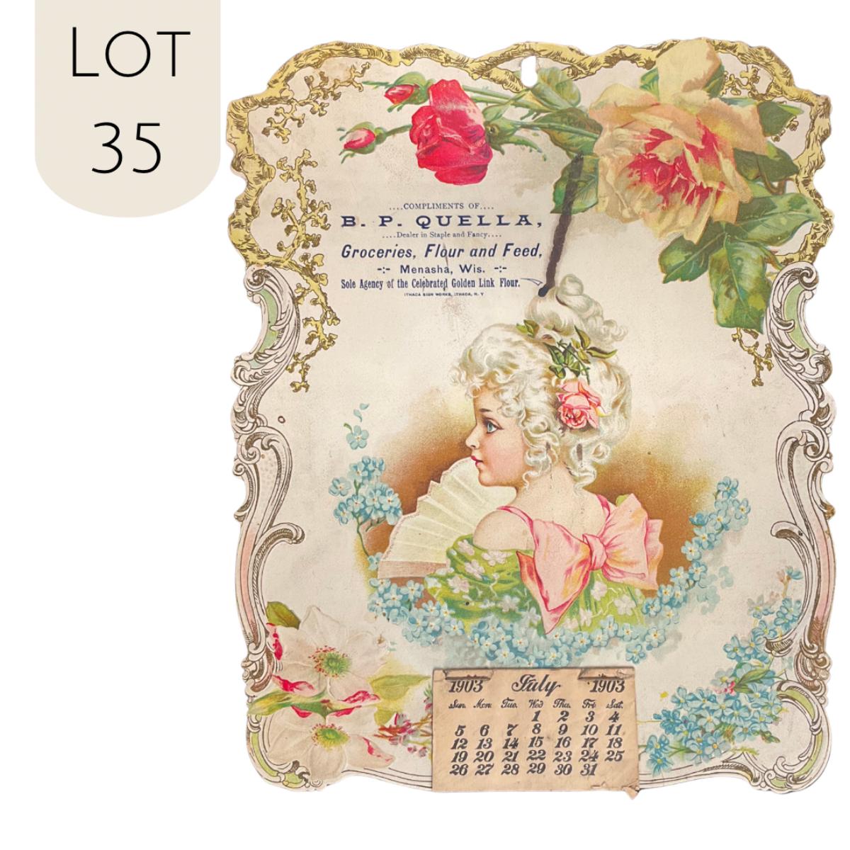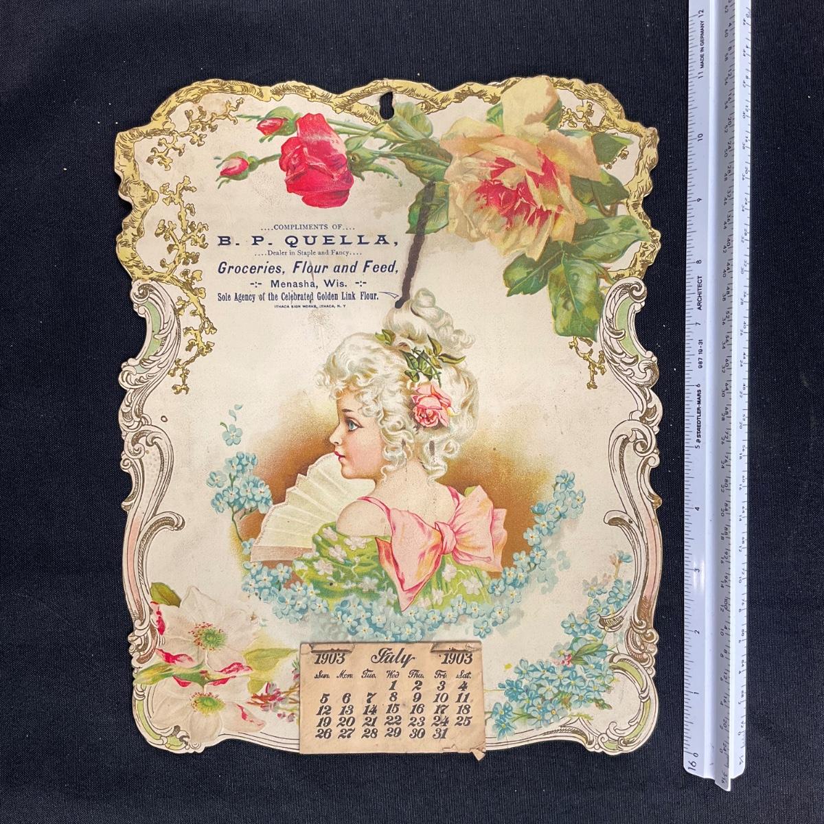 This Die Cut Calendar is Compliments of B P Quella, a Dealer in Staple and Fancy Groceries, Flour and Feed in Menasha Wisconsin. the SOLE Agency of the Celebrated Golden Link Flour. This calendar was printed by Ithaca Sign works in New York. The calendar depicts a woman that is way too overdressed to go to the grocery store, in victorian clothing, with a bow on her back and a flower in her hair. She is going places, for certain. Calendar measures 8 1/2" x 11". **|** Please see photos for details and condition. ::: Shipping is available on this lot. If you require shipping you must let us know at the close of the auction. We will coordinate with you after the item has been won. Shipping fees will include insurance up to or exceeding the value of all items being mailed. If you have any questions regarding this lot please contact the auctioneer either via this website, by direct email or by phone. PICK UP TIMES and other important information can be found in the TERMS and DESCRIPTION of the auction. Please take a look for pertinent information. Thanks!