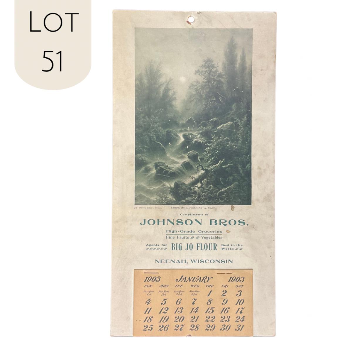 This calendar was Compliments of Johnson Bros Groceries. They carried high-grade groceries, fine fruits and vegetables. They were also Agents for Big Jo Flour, Best in the world. Located in Neenah, Wisconsin. This calendar features a picture titled "Brook by Moonshine" original by A Rieger. The picture depicts a rocky stream surrounded by trees. The calendar was published by Brown and Bigelow of St Paul, MN. This Calendar is complete, showing January 1903. This calendar measures 7" x 13 3/4". **|** Please see photos for details and condition. ::: Shipping is available on this lot. If you require shipping you must let us know at the close of the auction. We will coordinate with you after the item has been won. Shipping fees will include insurance up to or exceeding the value of all items being mailed. If you have any questions regarding this lot please contact the auctioneer either via this website, by direct email or by phone. PICK UP TIMES and other important information can be found in the TERMS and DESCRIPTION of the auction. Please take a look for pertinent information. Thanks!