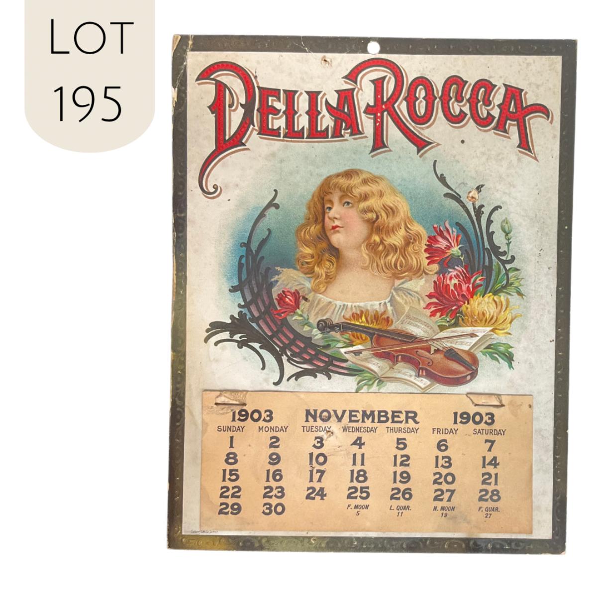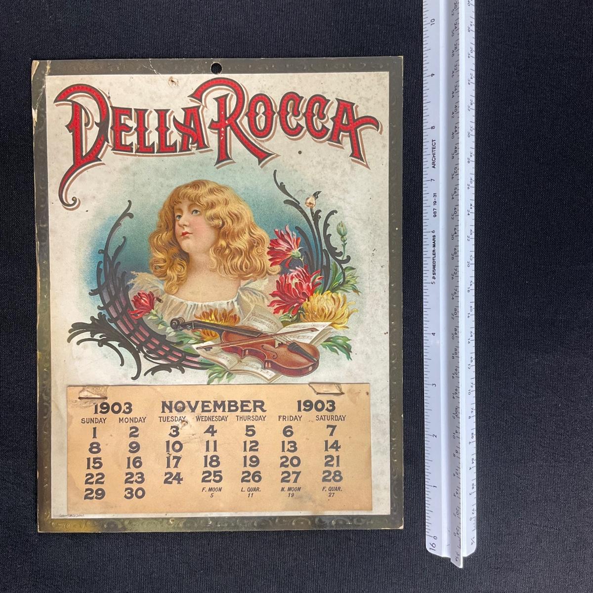 This calendar was published in 1903 to promote Della Rocca Cigars. The calendar is incomplete, showing November 1903. The calendar features a bust of a blonde woman with a violin and sheet music amidst floral and filigree. This calendar measures 7 1/4" x 9 1/4". **|** Please see photos for details and condition. ::: Shipping is available on this lot. If you require shipping you must let us know at the close of the auction. We will coordinate with you after the item has been won. Shipping fees will include insurance up to or exceeding the value of all items being mailed. If you have any questions regarding this lot please contact the auctioneer either via this website, by direct email or by phone. PICK UP TIMES and other important information can be found in the TERMS and DESCRIPTION of the auction. Please take a look for pertinent information. Thanks!