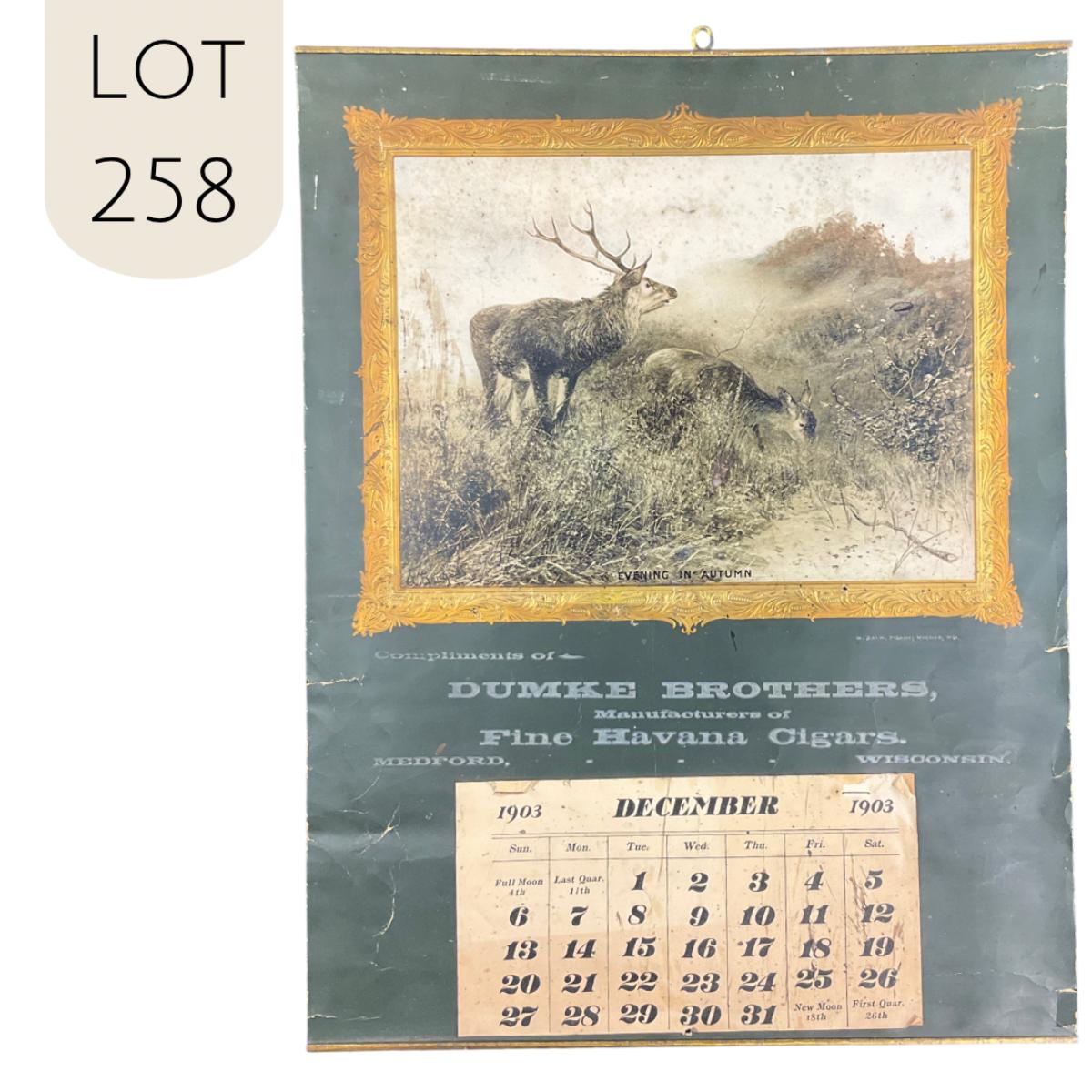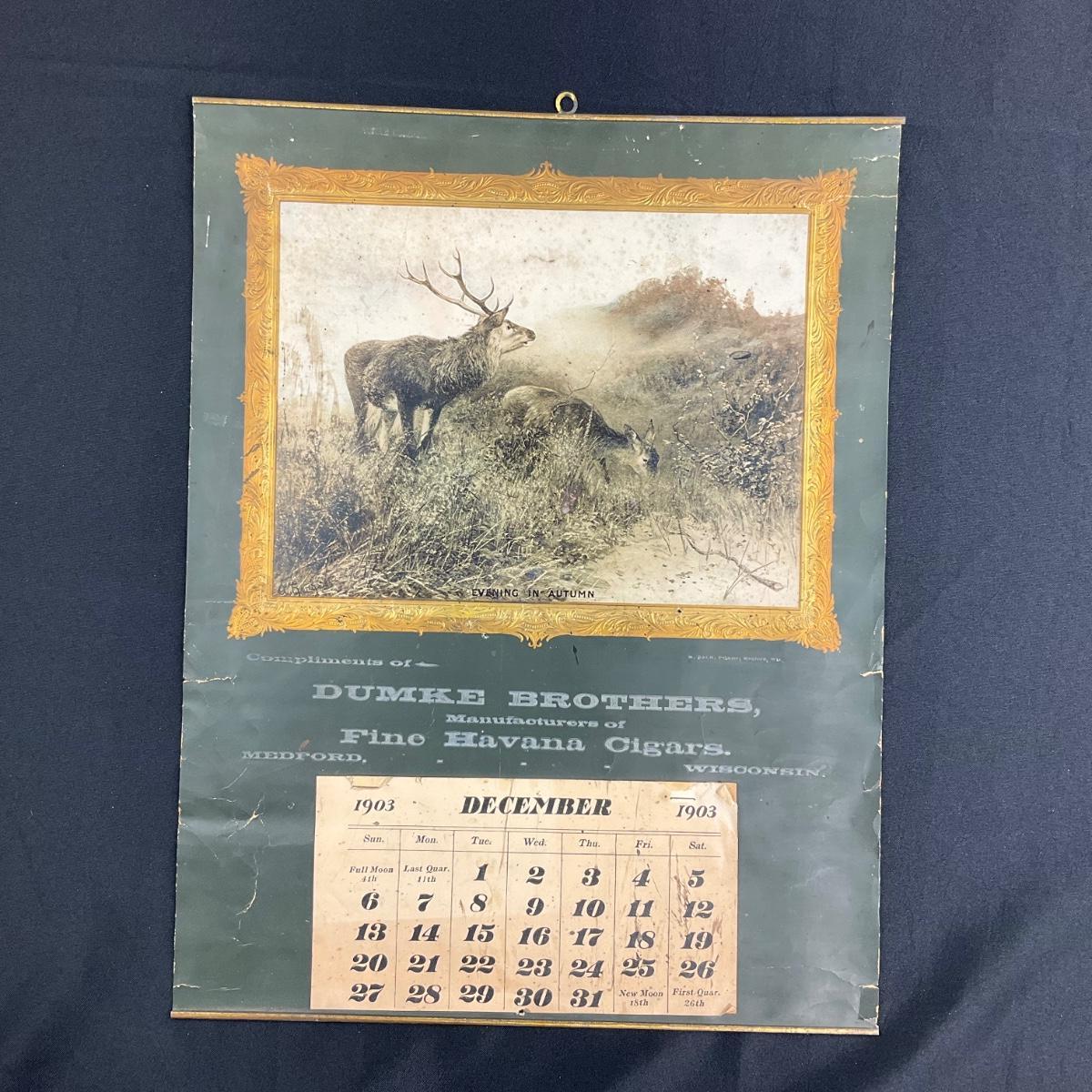 This calendar was compliments of the Dumke Brothers, manufacturers Fine Havana Cigars, located in Medford Wisconsin. This calendar features a picture of two deer titled "Evening in Autumn" original by A Henke, copyright 1901. This calendar is incomplete, showing December 1903. This calendar measures 15" x 19 1/2". **|** Please see photos for details and condition. ::: Shipping is available on this lot. If you require shipping you must let us know at the close of the auction. We will coordinate with you after the item has been won. Shipping fees will include insurance up to or exceeding the value of all items being mailed. If you have any questions regarding this lot please contact the auctioneer either via this website, by direct email or by phone. PICK UP TIMES and other important information can be found in the TERMS and DESCRIPTION of the auction. Please take a look for pertinent information. Thanks!