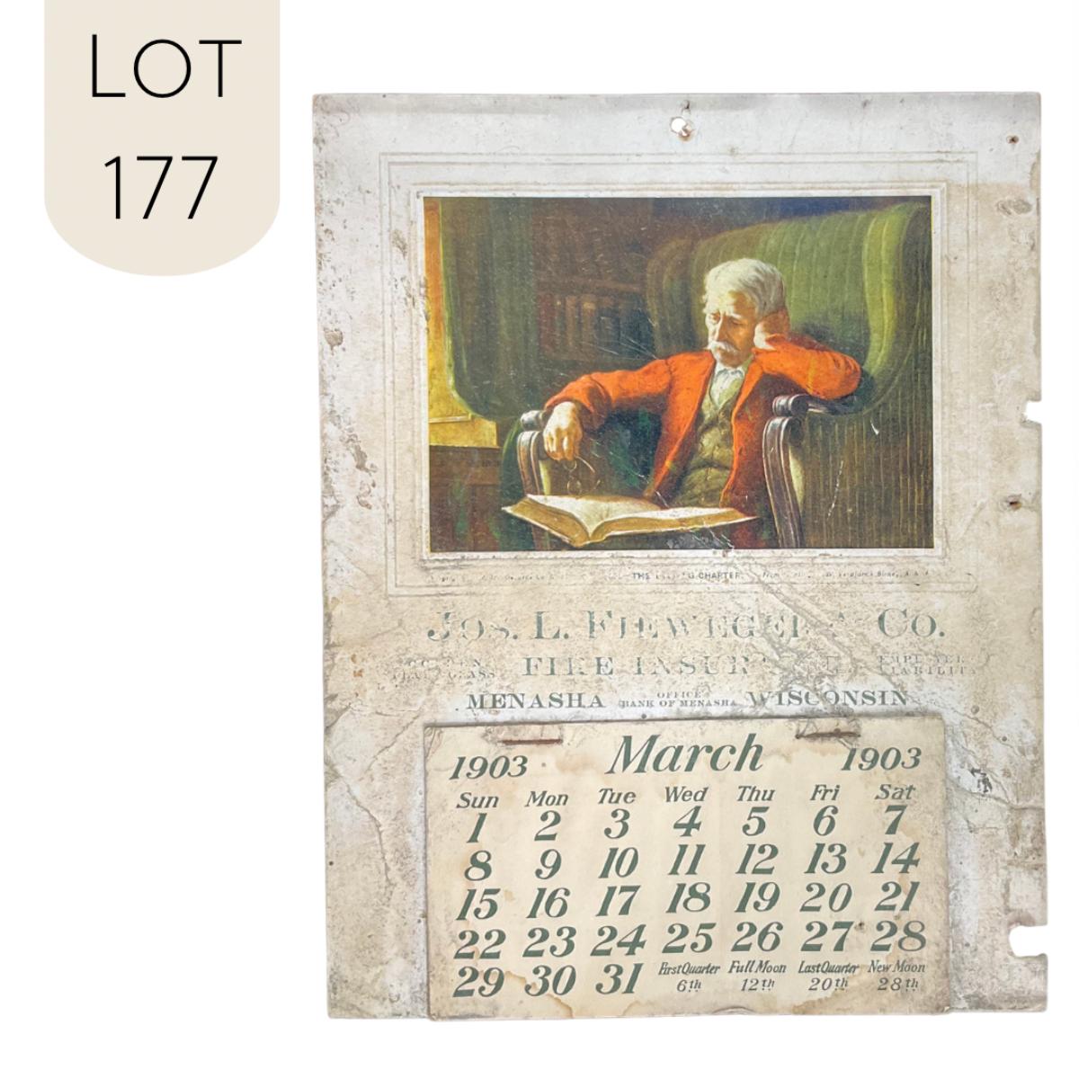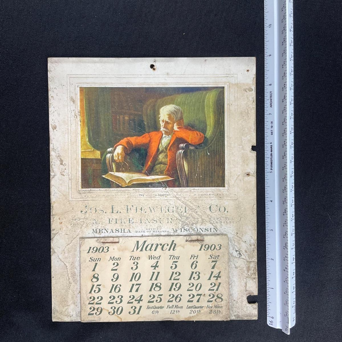 This calendar was produced by the Osbourne Company of New York for Jos L Fieweger, specialist in Fire Insurance in Menasha Wisconsin. This calendar features a picture titled "The Evening Chapter", original by W. Verplanck Birney. The picture depicts and older man reading a book in a wing-back chair. This calendar is incomplete, showing March 1903. This calendar measures 7” x 9” . **|** Please see photos for details and condition. ::: Shipping is available on this lot. If you require shipping you must let us know at the close of the auction. We will coordinate with you after the item has been won. Shipping fees will include insurance up to or exceeding the value of all items being mailed. If you have any questions regarding this lot please contact the auctioneer either via this website, by direct email or by phone. PICK UP TIMES and other important information can be found in the TERMS and DESCRIPTION of the auction. Please take a look for pertinent information. Thanks!