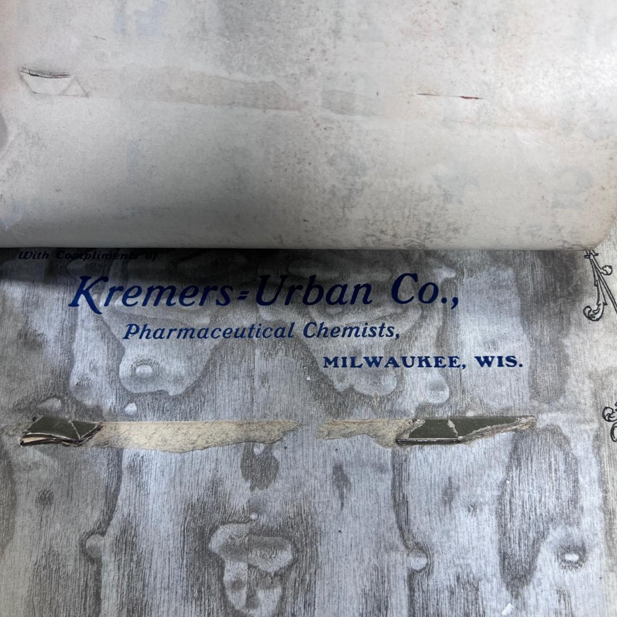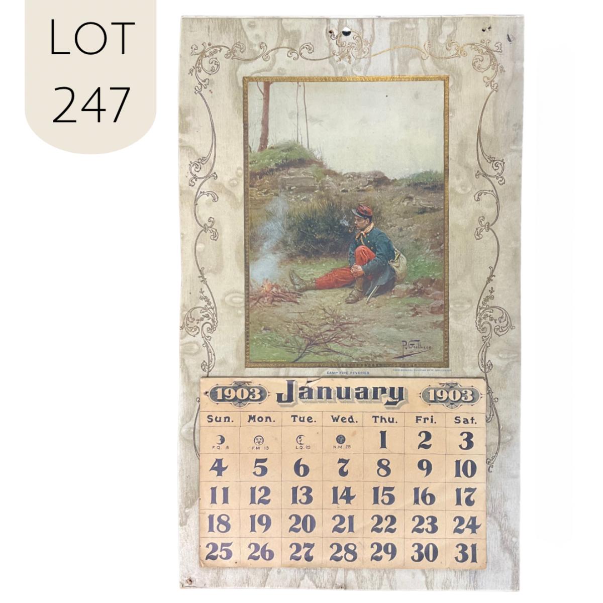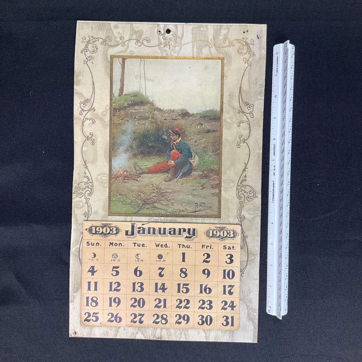 This calendar features a picture of a soldier sitting in front of a campfire titled "Came Fire Reveries". The original painting was by Paul Grolleron. This calendar is copyright 1901, Peter Schemm. Kremers Urban Co in Milwaukee were Pharmaceutical chemists. This calendar is complete, showing January 1903. The calendar measures 9" x 15". **|** Please see photos for details and condition. ::: Shipping is available on this lot. If you require shipping you must let us know at the close of the auction. We will coordinate with you after the item has been won. Shipping fees will include insurance up to or exceeding the value of all items being mailed. If you have any questions regarding this lot please contact the auctioneer either via this website, by direct email or by phone. PICK UP TIMES and other important information can be found in the TERMS and DESCRIPTION of the auction. Please take a look for pertinent information. Thanks!
