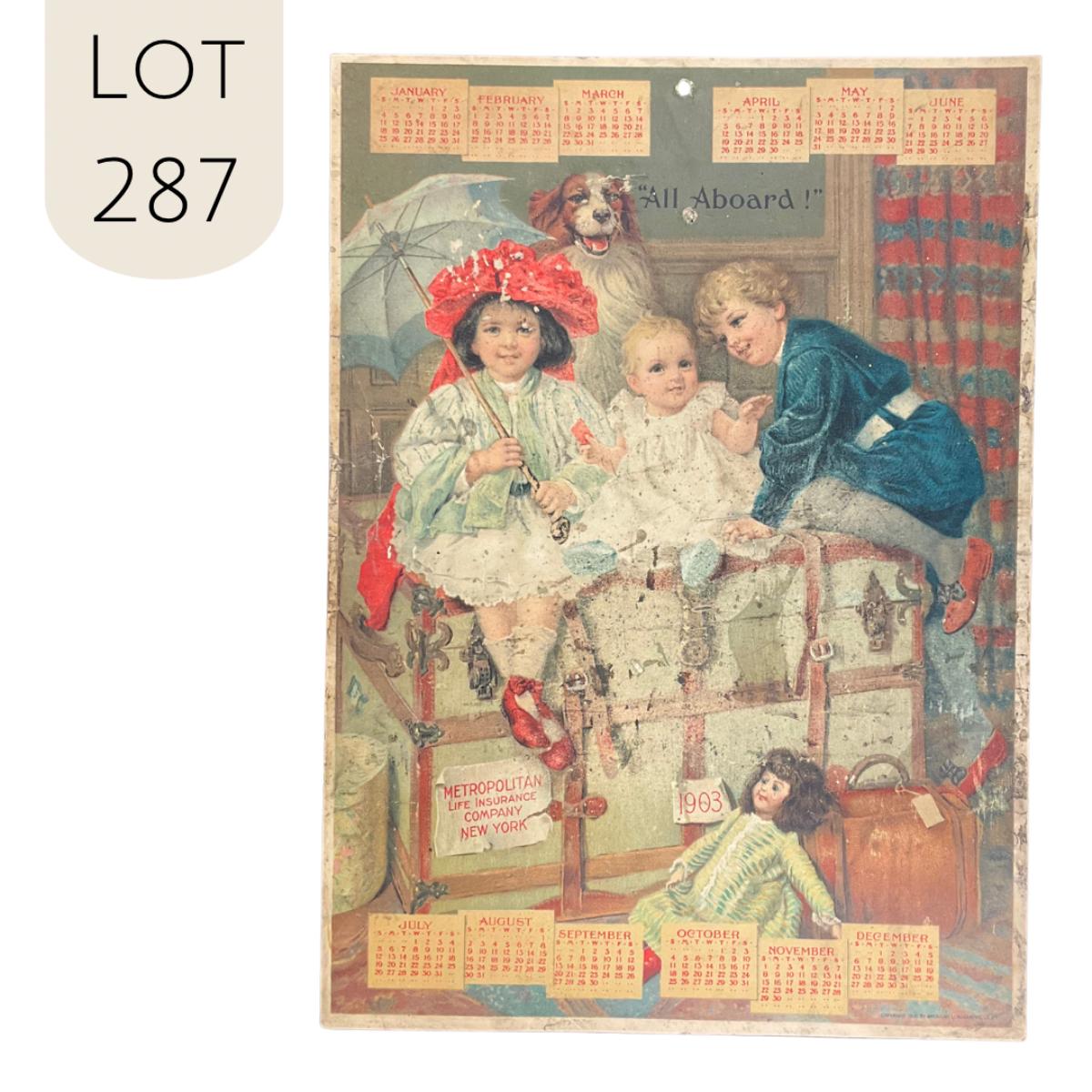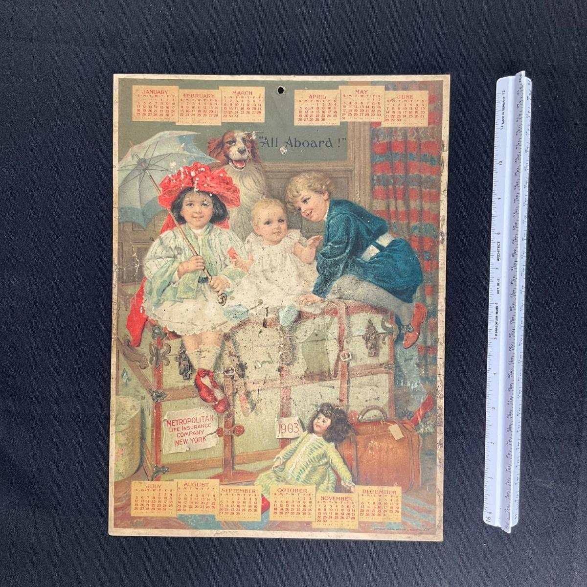This calendar was compliments of the Metropolitan Life Insurance Company of New York. This calendar features a picture of Three children sitting on a steam trunk with a dog and a doll titled "All Aboard", copyright 1902, American Lithographic Company, New York. This one sheet calendar is complete. This calendar measures 9 3/4" x 13 1/4". **|** Please see photos for details and condition. ::: Shipping is available on this lot. If you require shipping you must let us know at the close of the auction. We will coordinate with you after the item has been won. Shipping fees will include insurance up to or exceeding the value of all items being mailed. If you have any questions regarding this lot please contact the auctioneer either via this website, by direct email or by phone. PICK UP TIMES and other important information can be found in the TERMS and DESCRIPTION of the auction. Please take a look for pertinent information. Thanks!