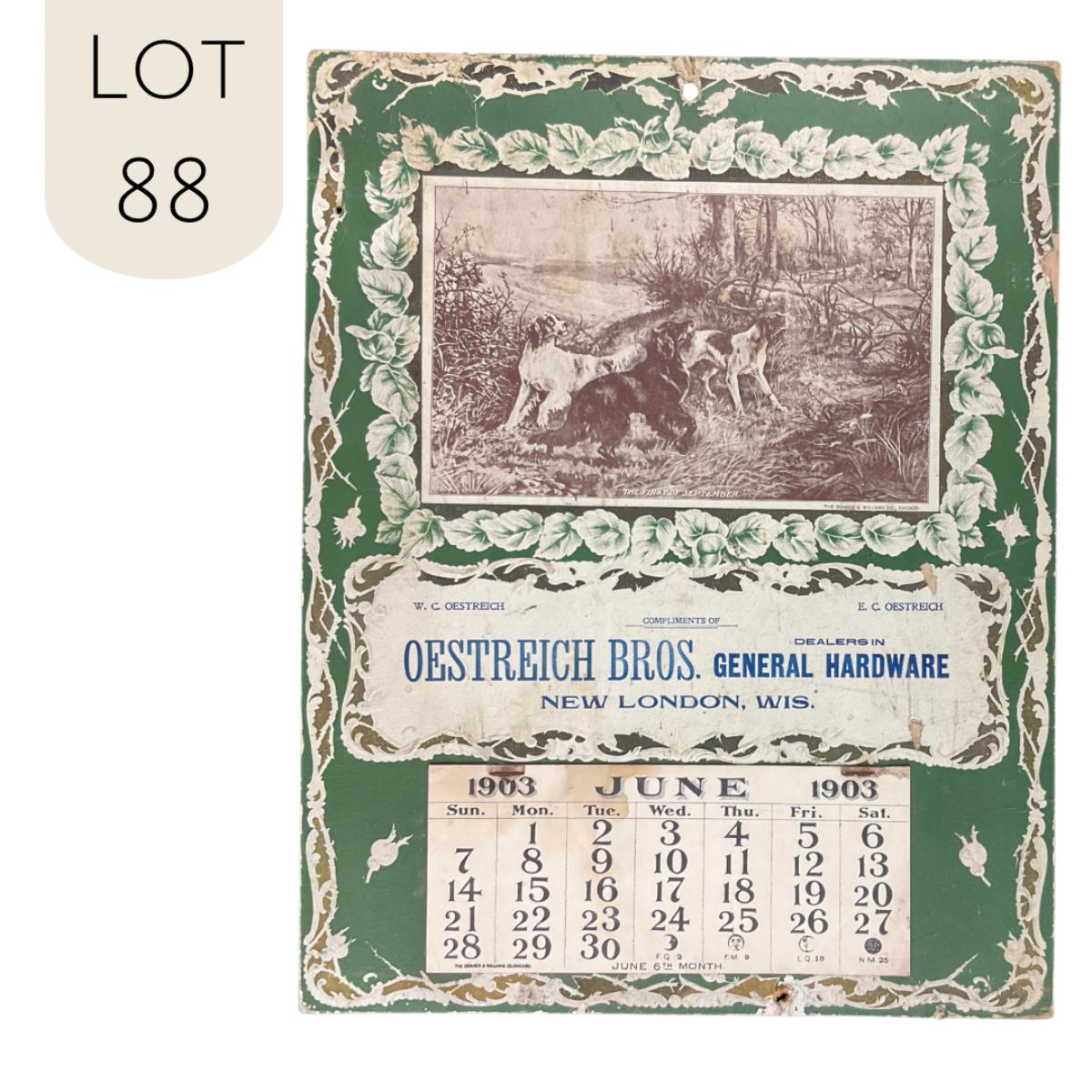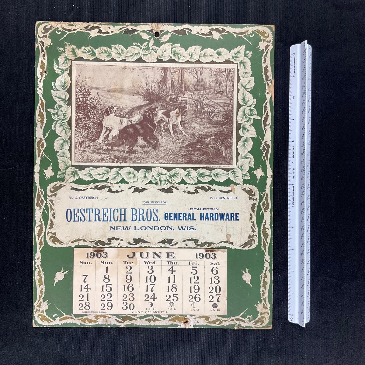 This calendar was compliments of the Oestreich Brothers, Dealers in General Hardware in New London, Wisconsin. The calendar features a picture titled "The First of September" which depicts a group of hunting dogs scaring up some birds. The calendar was printed by the Donkers and Williams Company, Chicago. This calendar is incomplete, showing June 1903. This calendar measures 10 7/8" x 14". **|** Please see photos for details and condition. ::: Shipping is available on this lot. If you require shipping you must let us know at the close of the auction. We will coordinate with you after the item has been won. Shipping fees will include insurance up to or exceeding the value of all items being mailed. If you have any questions regarding this lot please contact the auctioneer either via this website, by direct email or by phone. PICK UP TIMES and other important information can be found in the TERMS and DESCRIPTION of the auction. Please take a look for pertinent information. Thanks!