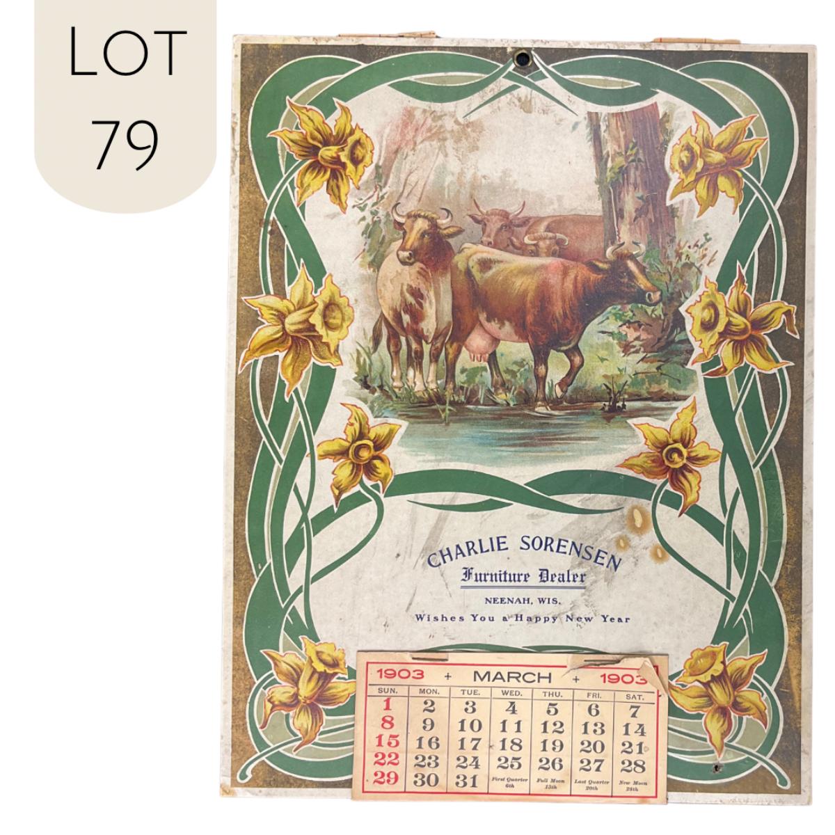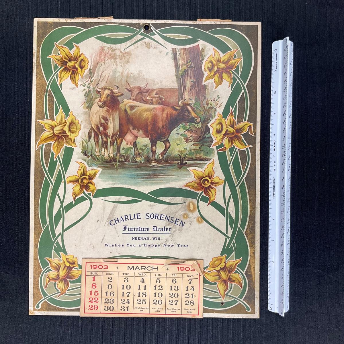 This calendar is Compliments of Charlie Sorensen, a Furniture Dealer wishing you a Happy New Year! This calendar has a floral border with cows heading into a stream as the main feature. This calendar is incomplete, showing March 1903. The calendar measures 10 3/4" x 14". **|** Please see photos for details and condition. ::: Shipping is available on this lot. If you require shipping you must let us know at the close of the auction. We will coordinate with you after the item has been won. Shipping fees will include insurance up to or exceeding the value of all items being mailed. If you have any questions regarding this lot please contact the auctioneer either via this website, by direct email or by phone. PICK UP TIMES and other important information can be found in the TERMS and DESCRIPTION of the auction. Please take a look for pertinent information. Thanks!