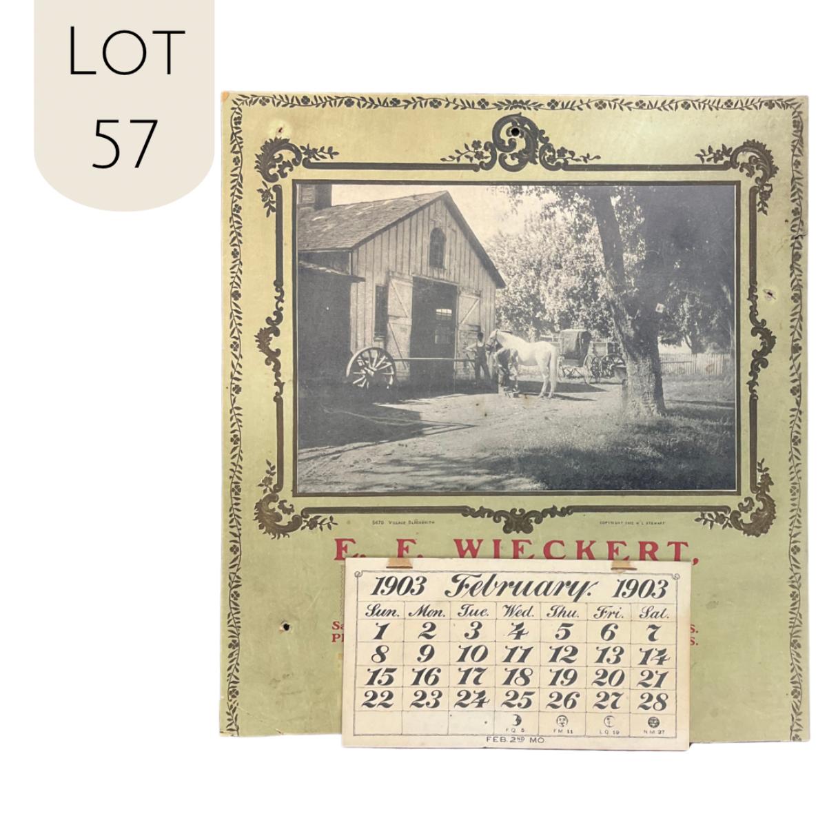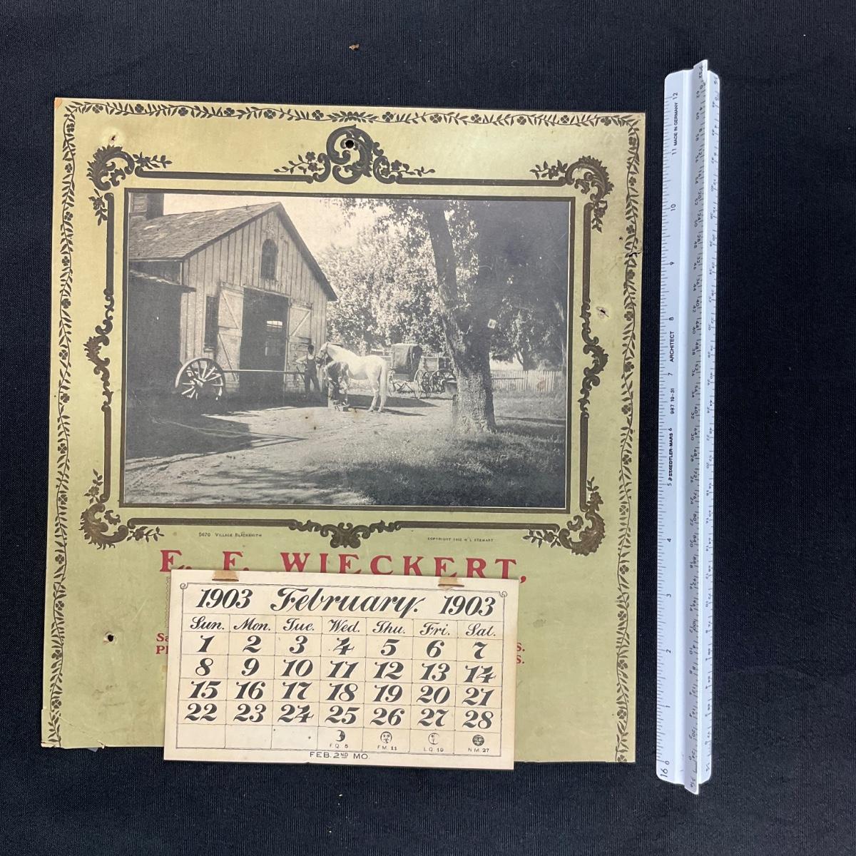 This calendar was courtesy of E F Wieckert (Underhill, WI), Neenah Wisconsin. This calendar has been altered, and the bottom cut off, it measures 10 5/8" x 11 5/8". The calendar features a photo titled the Village Blacksmith, accredited to W L Stewart. It depicts a blacksmith's business with a horse and carriage out front. The calendar is incomplete, showing February 1903. Calendar is copyright 1902, W L Stewart. **|** Please see photos for details and condition. ::: Shipping is available on this lot. If you require shipping you must let us know at the close of the auction. We will coordinate with you after the item has been won. Shipping fees will include insurance up to or exceeding the value of all items being mailed. If you have any questions regarding this lot please contact the auctioneer either via this website, by direct email or by phone. PICK UP TIMES and other important information can be found in the TERMS and DESCRIPTION of the auction. Please take a look for pertinent information. Thanks!