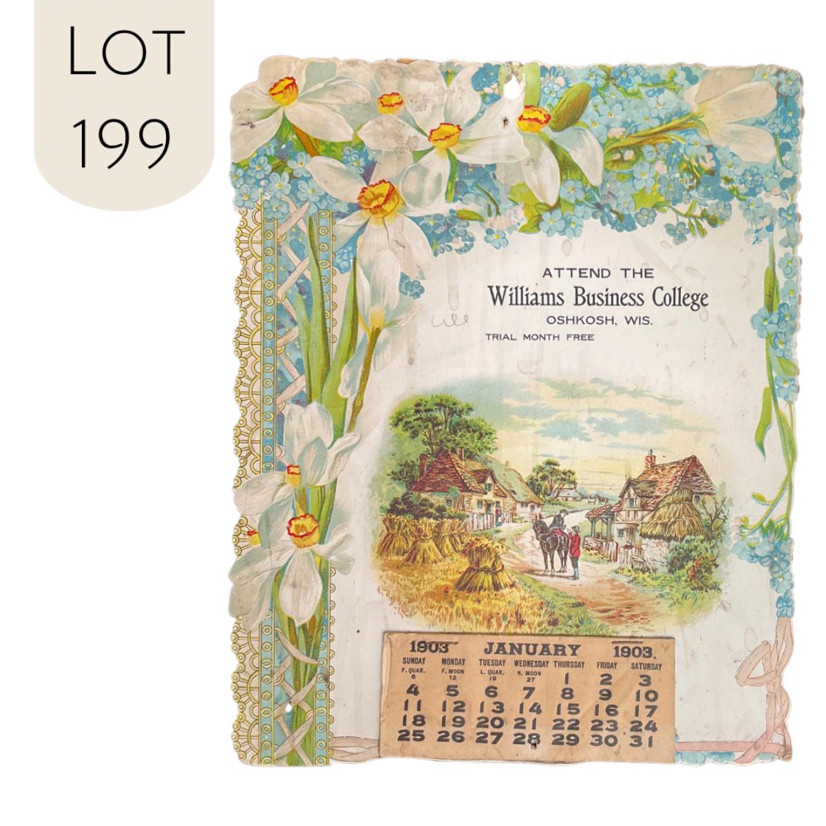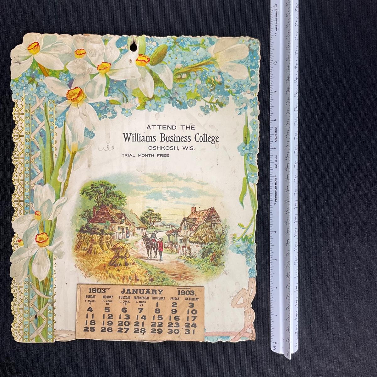 This calendar was produced to promote the Williams Business College in Oshkosh, Wisconsin. The calendar features a countryside landscape with a floral border. The calendar indicates that you can get a trial month free at the school! This calendar is complete, showing January 1903. The calendar measures 8 7/8" x 11". **|** Please see photos for details and condition. ::: Shipping is available on this lot. If you require shipping you must let us know at the close of the auction. We will coordinate with you after the item has been won. Shipping fees will include insurance up to or exceeding the value of all items being mailed. If you have any questions regarding this lot please contact the auctioneer either via this website, by direct email or by phone. PICK UP TIMES and other important information can be found in the TERMS and DESCRIPTION of the auction. Please take a look for pertinent information. Thanks!