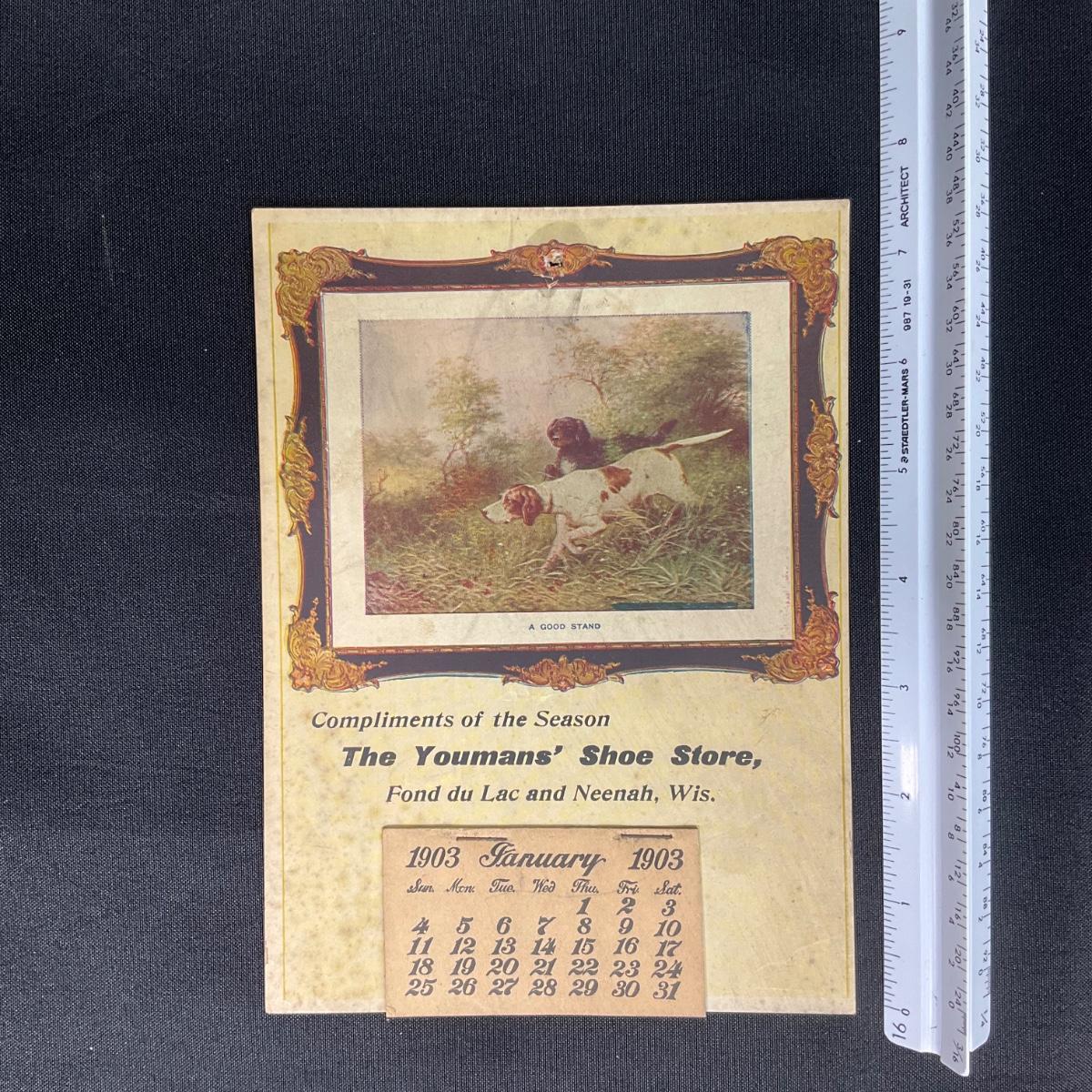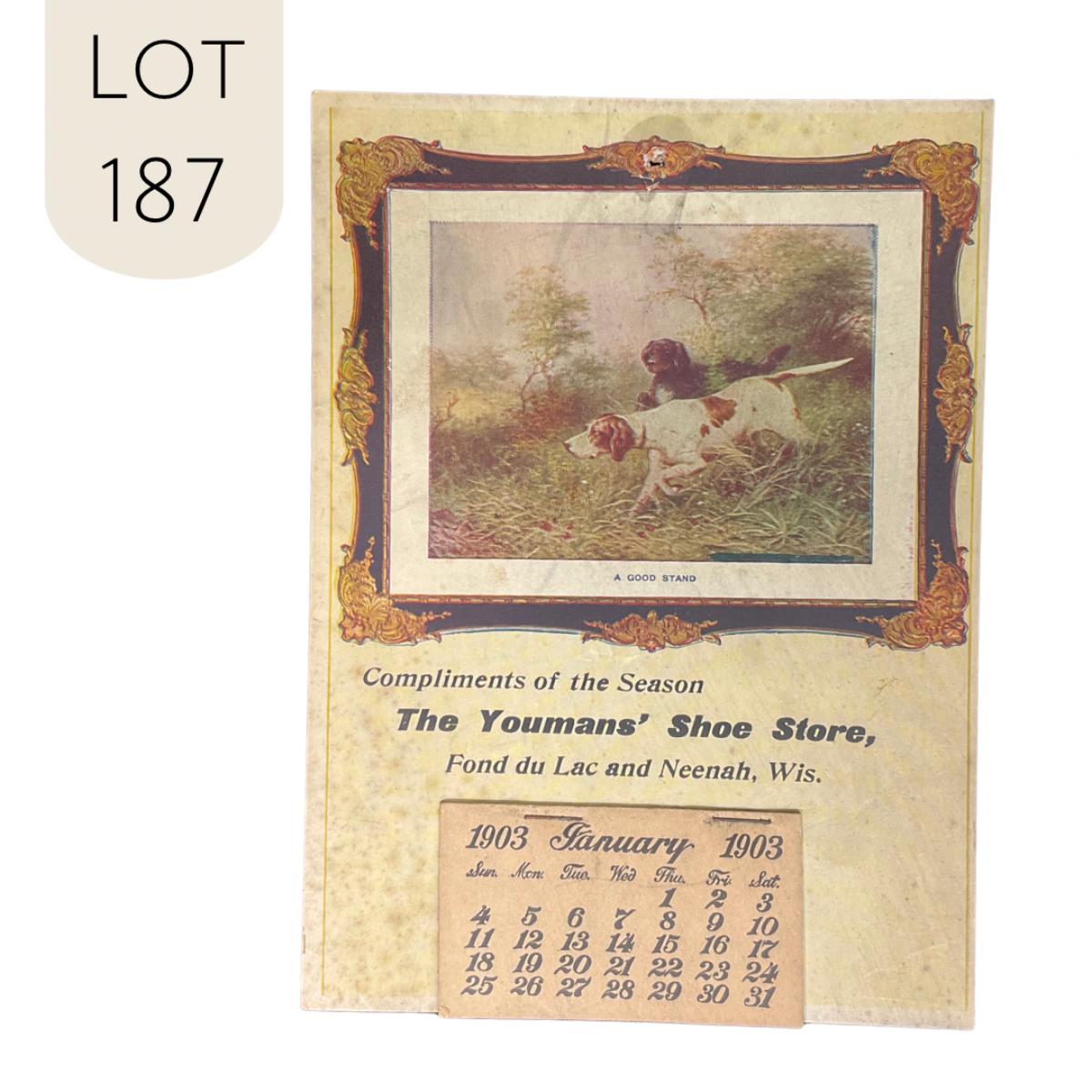 This calendar was produced for the Youman's Shoe Store, with locations in Fond du Lac and Neenah, WI. This calendar features a picture of two hunting dogs, titled "A Good Stand". This calendar is complete, showing January 1903. This calendar measures 5 1/2" x 7 1/2". **|** Please see photos for details and condition. ::: Shipping is available on this lot. If you require shipping you must let us know at the close of the auction. We will coordinate with you after the item has been won. Shipping fees will include insurance up to or exceeding the value of all items being mailed. If you have any questions regarding this lot please contact the auctioneer either via this website, by direct email or by phone. PICK UP TIMES and other important information can be found in the TERMS and DESCRIPTION of the auction. Please take a look for pertinent information. Thanks!