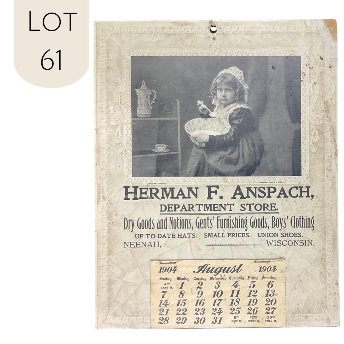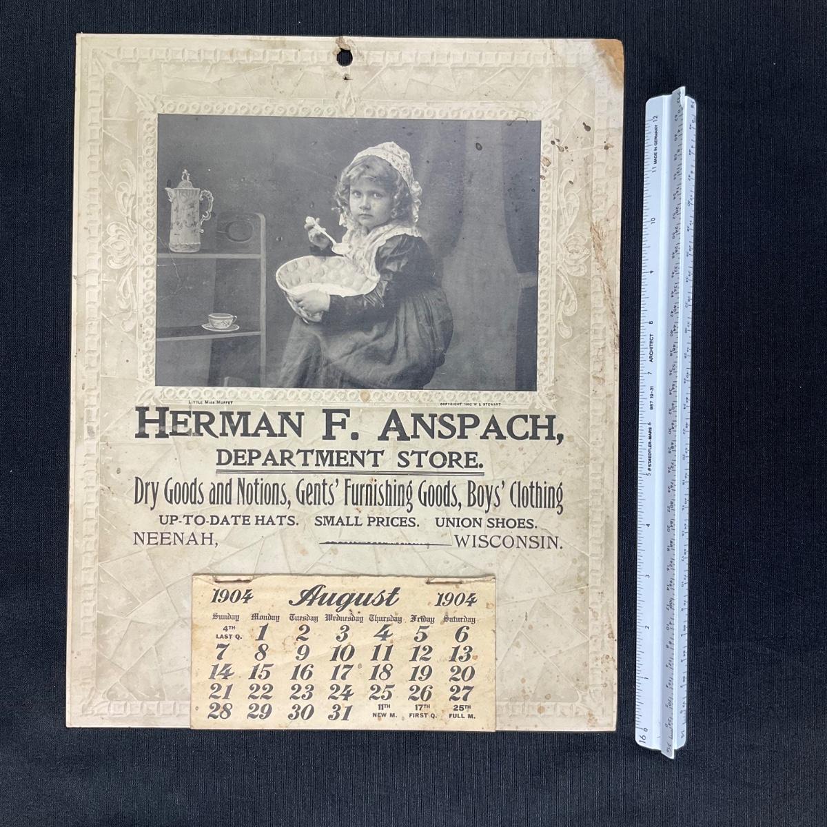This calendar from Herman F Anspach's Department Store in Neenah, Wisconsin. This calendar is incomplete, showing August 1904. The calendar features a picture of Little Miss Muffet eating her curds and whey. Also noted on the calendar is that the department store sells "Dry goods and notions, Gents' Furnishing goods, boys clothing. Up-to-date hats, Small prices and Union shoes." This calendar measures 10 3/4" x 13 1/2". **|** Please see photos for details and condition. ::: Shipping is available on this lot. If you require shipping you must let us know at the close of the auction. We will coordinate with you after the item has been won. Shipping fees will include insurance up to or exceeding the value of all items being mailed. If you have any questions regarding this lot please contact the auctioneer either via this website, by direct email or by phone. PICK UP TIMES and other important information can be found in the TERMS and DESCRIPTION of the auction. Please take a look for pertinent information. Thanks!