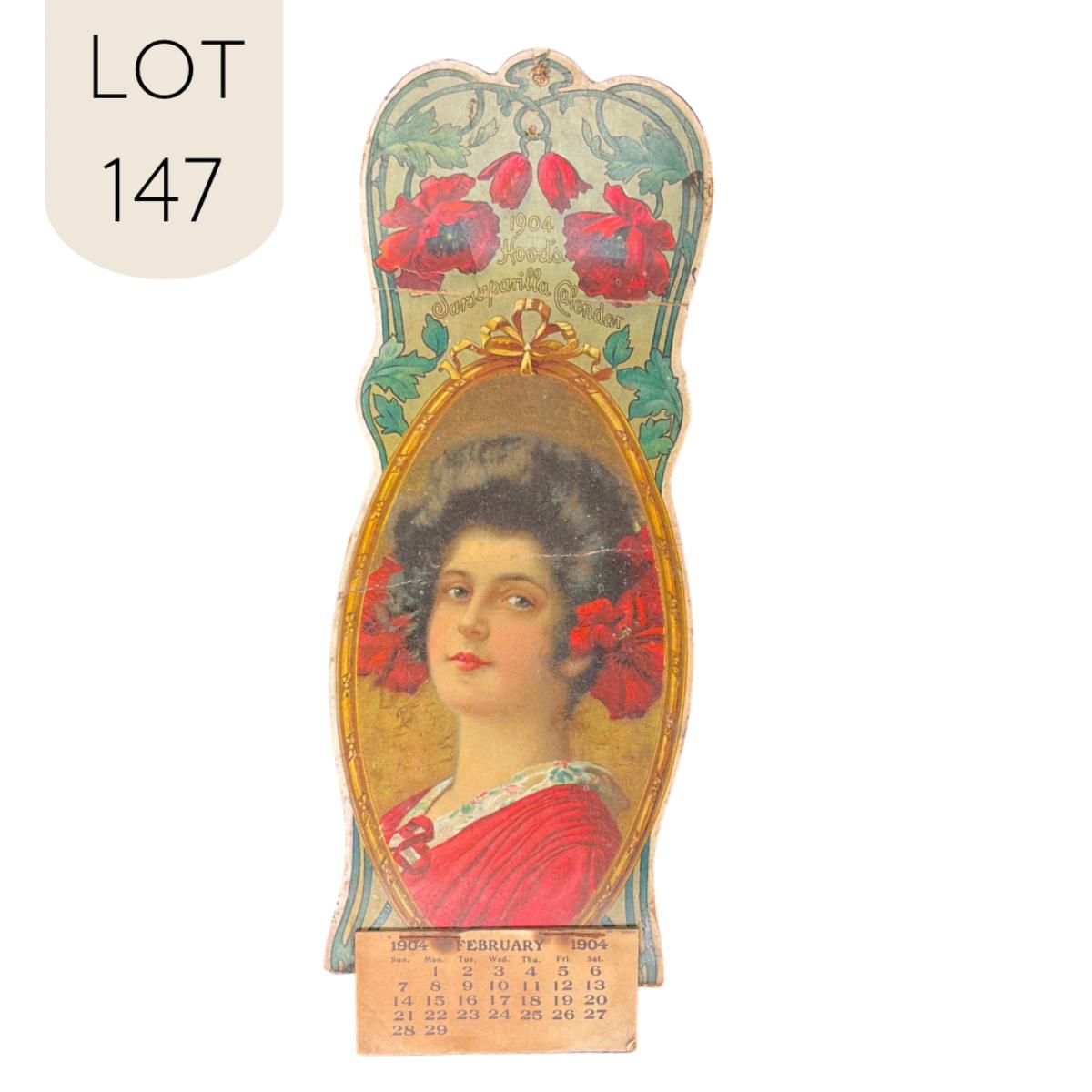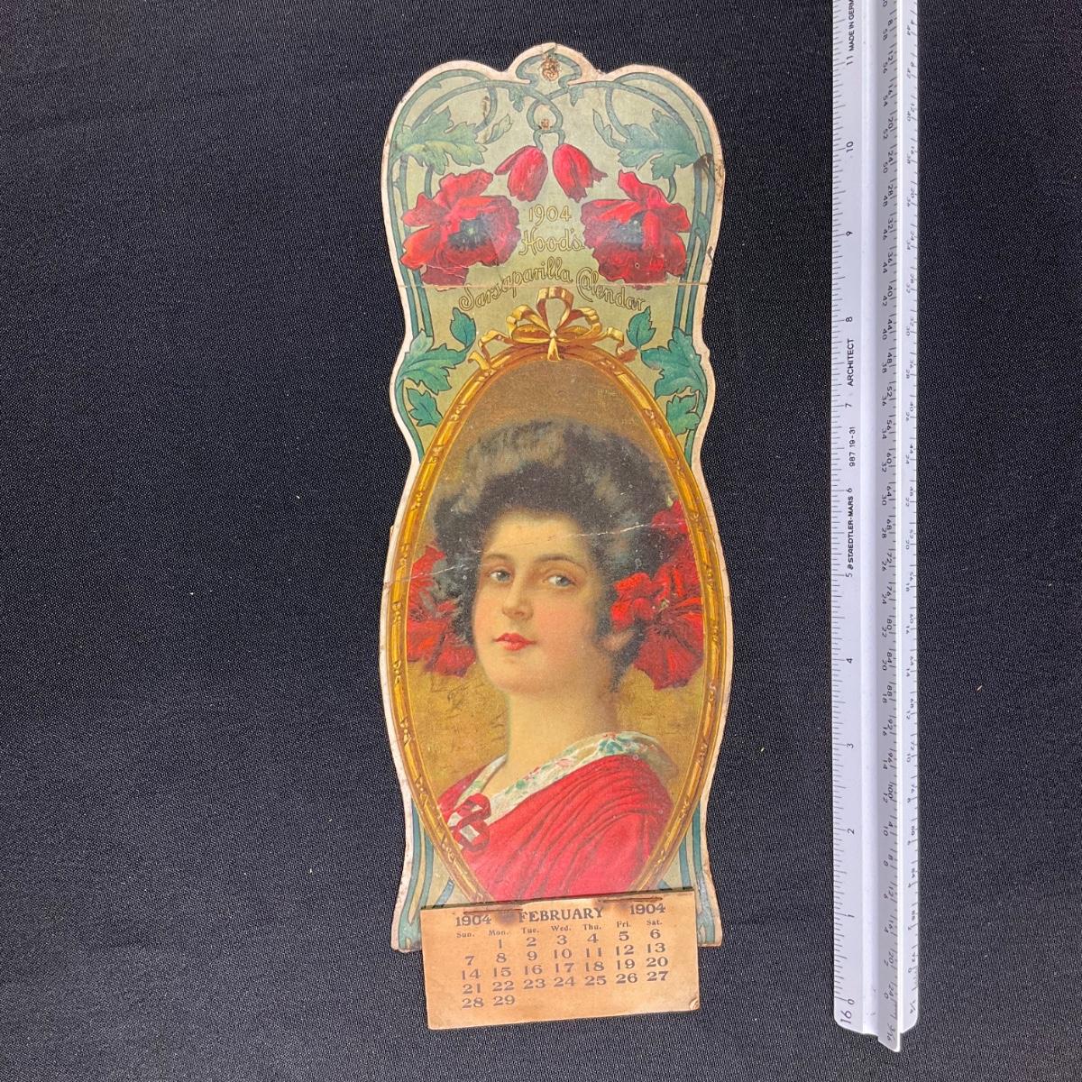 This calendar was compliments of Hood's Sarsaparilla. This calendar is incomplete, showing February 1904. The calendar features a dark haired woman with poppies in her hair. This calendar measures 4 1/4" x 11 1/2". **|** Please see photos for details and condition. ::: Shipping is available on this lot. If you require shipping you must let us know at the close of the auction. We will coordinate with you after the item has been won. Shipping fees will include insurance up to or exceeding the value of all items being mailed. If you have any questions regarding this lot please contact the auctioneer either via this website, by direct email or by phone. PICK UP TIMES and other important information can be found in the TERMS and DESCRIPTION of the auction. Please take a look for pertinent information. Thanks!
