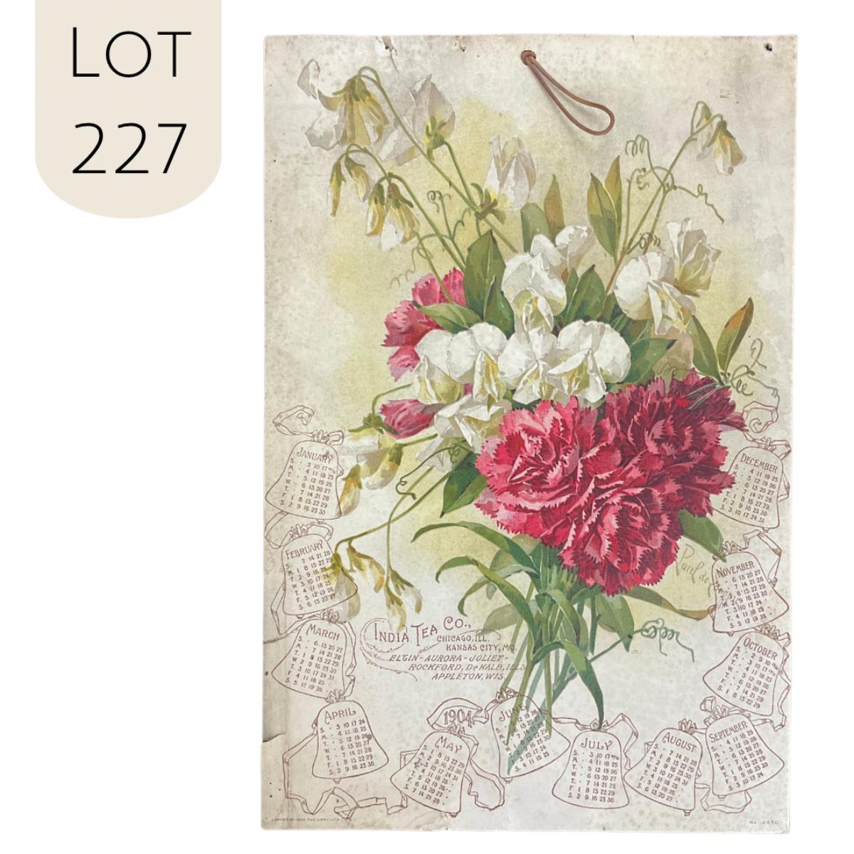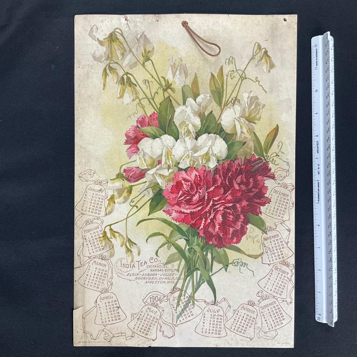 This calendar was compliments of the India Tea Company, produced by the Gray Litho Company of New York. This calendar features Carnations and Sweet Peas in a beautiful bouquet. The artwork is attributed to Paul DeLonpre. The calendar calls out the locations of their business, Chicago IL, Kansas City MO, Elgin, Aurora, Joliet, Rockford, De Kalb Illinois and Appleton Wisconsin! This calendar is one sheet and is complete. The calendar measures 10" x 15". **|** Please see photos for details and condition. ::: Shipping is available on this lot. If you require shipping you must let us know at the close of the auction. We will coordinate with you after the item has been won. Shipping fees will include insurance up to or exceeding the value of all items being mailed. If you have any questions regarding this lot please contact the auctioneer either via this website, by direct email or by phone. PICK UP TIMES and other important information can be found in the TERMS and DESCRIPTION of the auction. Please take a look for pertinent information. Thanks!