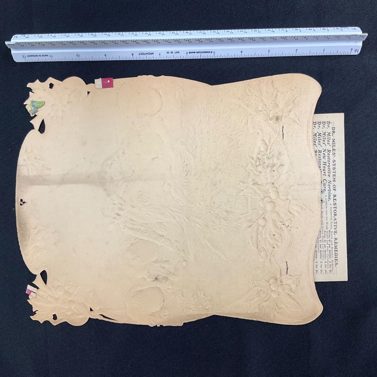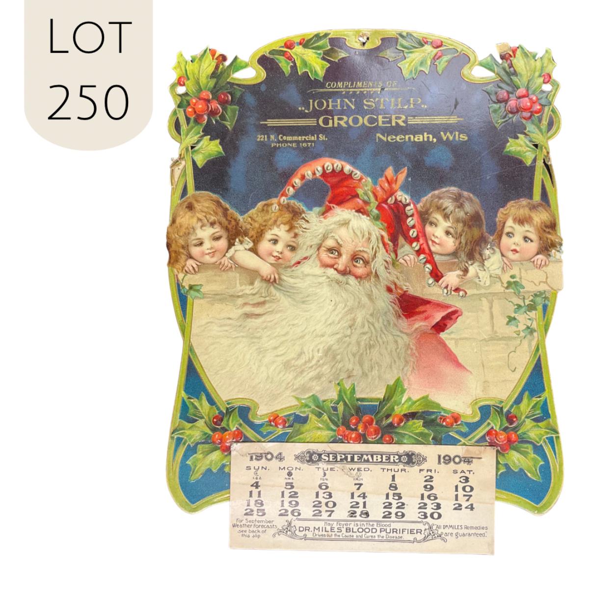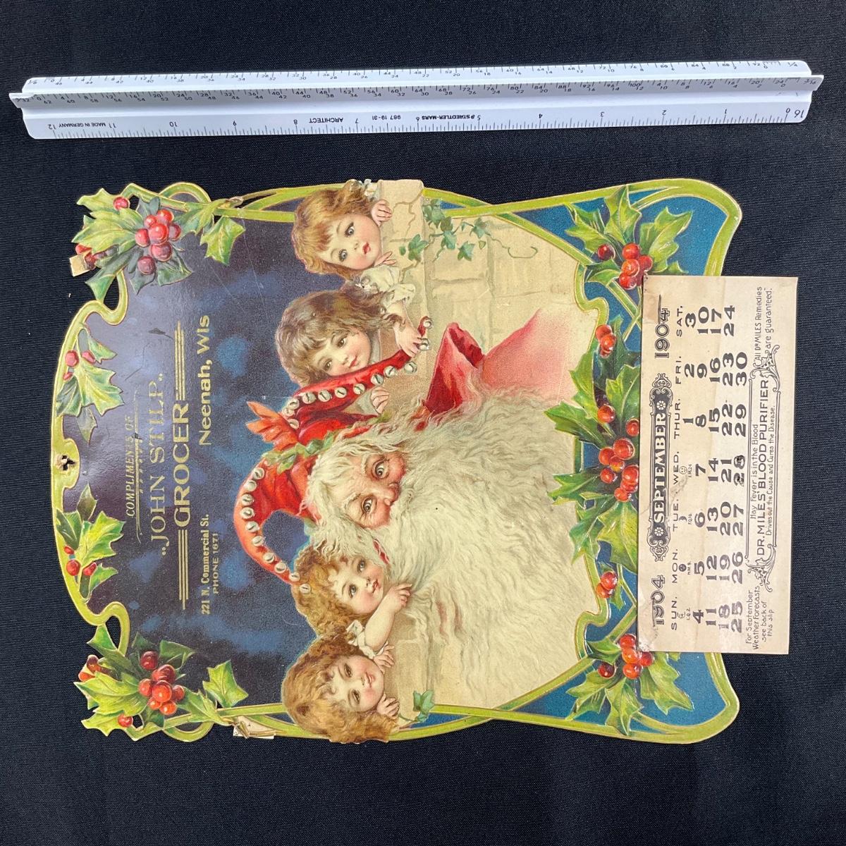 This calendar was compliments of John Stilp, Grocer in Neenah, WI. This calendar is speaking of the good that Dr. Miles' Blood Purifier is for you. This was the precursor to Alka-Seltzer. This Die-Cut Calendar features Santa with four little girls with a holly border. This calendar is incomplete, showing September 1904. This calendar measures 11 1/2" x 9 1/4". **|**