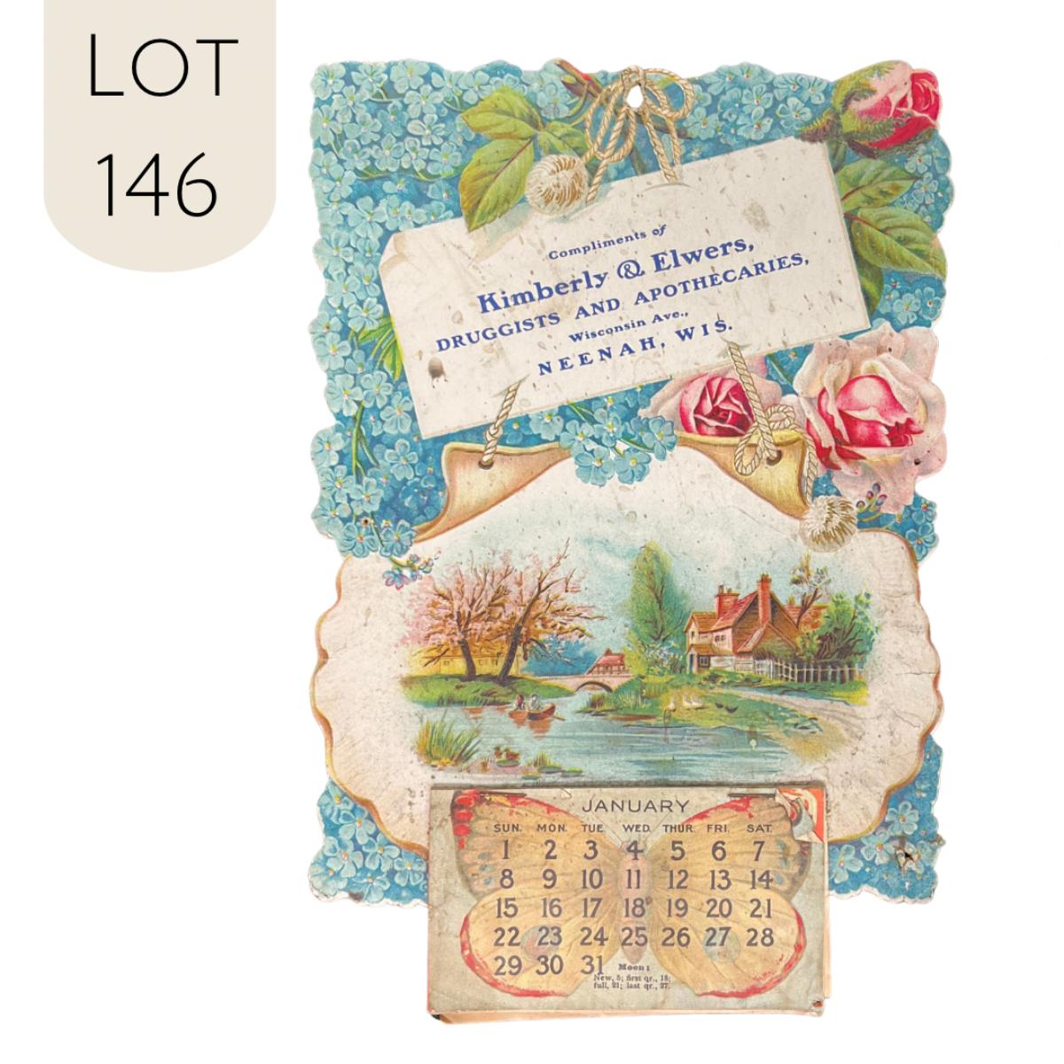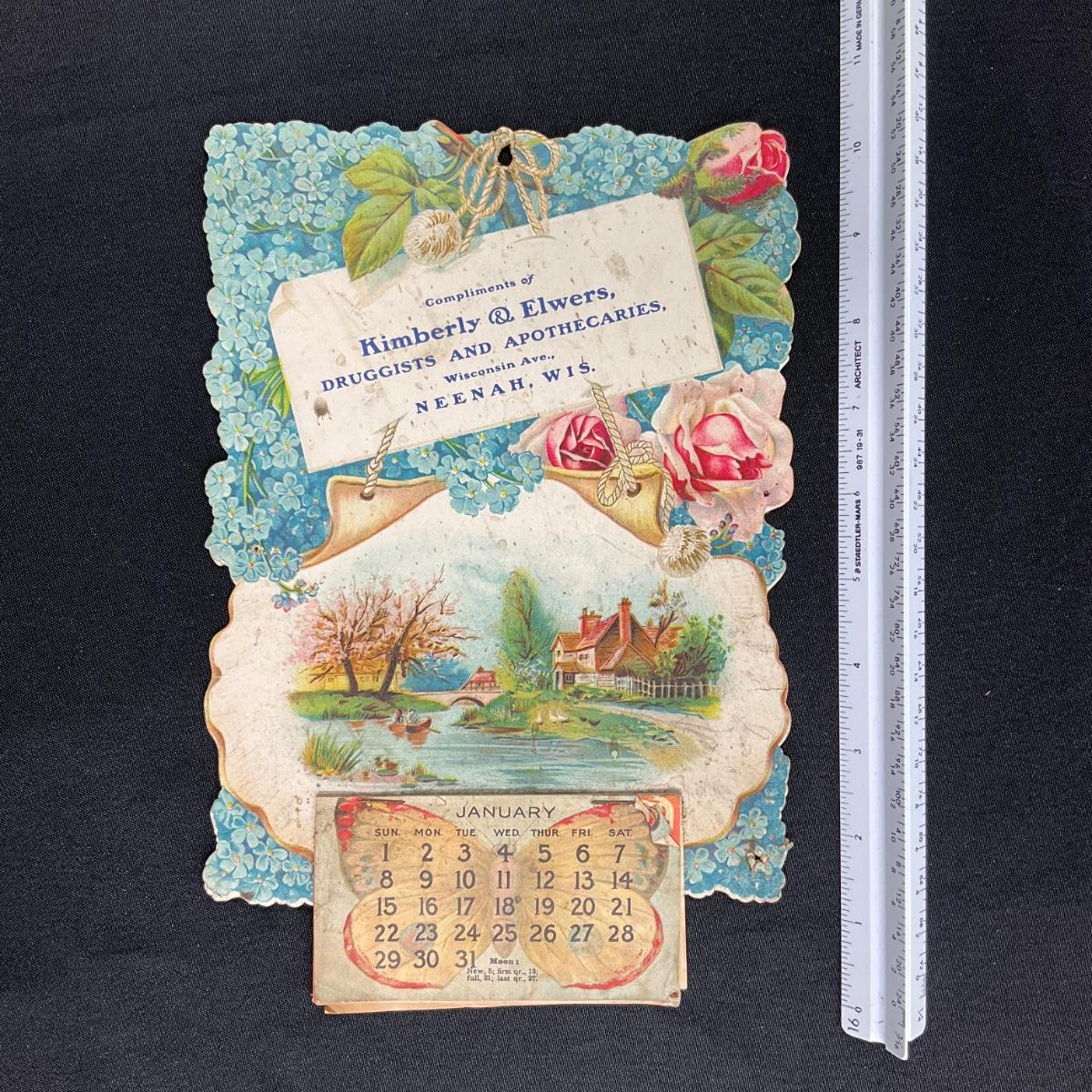 This calendar was compliments of Kimberly & Elwers, Druggists and Apothecaries of Neenah, WI. This calendar is complete, showing January 1904. The calendar features a picture of a homestead by a waterway, with a couple in a rowboat. This calendar measures 6 7/8" x 10 1/2". **|** Please see photos for details and condition. ::: Shipping is available on this lot. If you require shipping you must let us know at the close of the auction. We will coordinate with you after the item has been won. Shipping fees will include insurance up to or exceeding the value of all items being mailed. If you have any questions regarding this lot please contact the auctioneer either via this website, by direct email or by phone. PICK UP TIMES and other important information can be found in the TERMS and DESCRIPTION of the auction. Please take a look for pertinent information. Thanks!