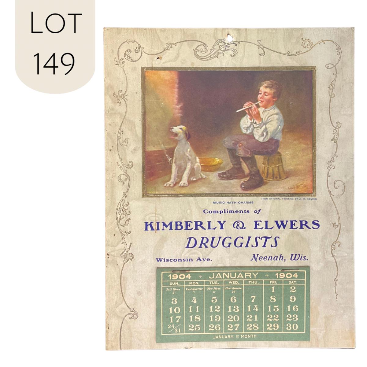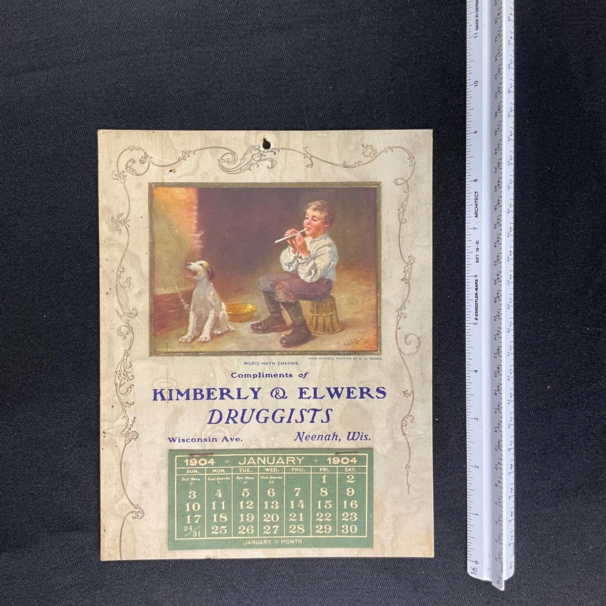This calendar was compliments of Kimberly & Elwers, Druggists on Wisconsin Ave in Neenah Wisconsin. The calendar features a picture titled "Music Hath Charms", original by J H Henrici, copyright 1902, Charles Williams. The picture depicts a young boy playing a flute training a dog to howl along. This calendar measures 7" x 9". This calendar is complete, showing January 1904. **|** Please see photos for details and condition. ::: Shipping is available on this lot. If you require shipping you must let us know at the close of the auction. We will coordinate with you after the item has been won. Shipping fees will include insurance up to or exceeding the value of all items being mailed. If you have any questions regarding this lot please contact the auctioneer either via this website, by direct email or by phone. PICK UP TIMES and other important information can be found in the TERMS and DESCRIPTION of the auction. Please take a look for pertinent information. Thanks!