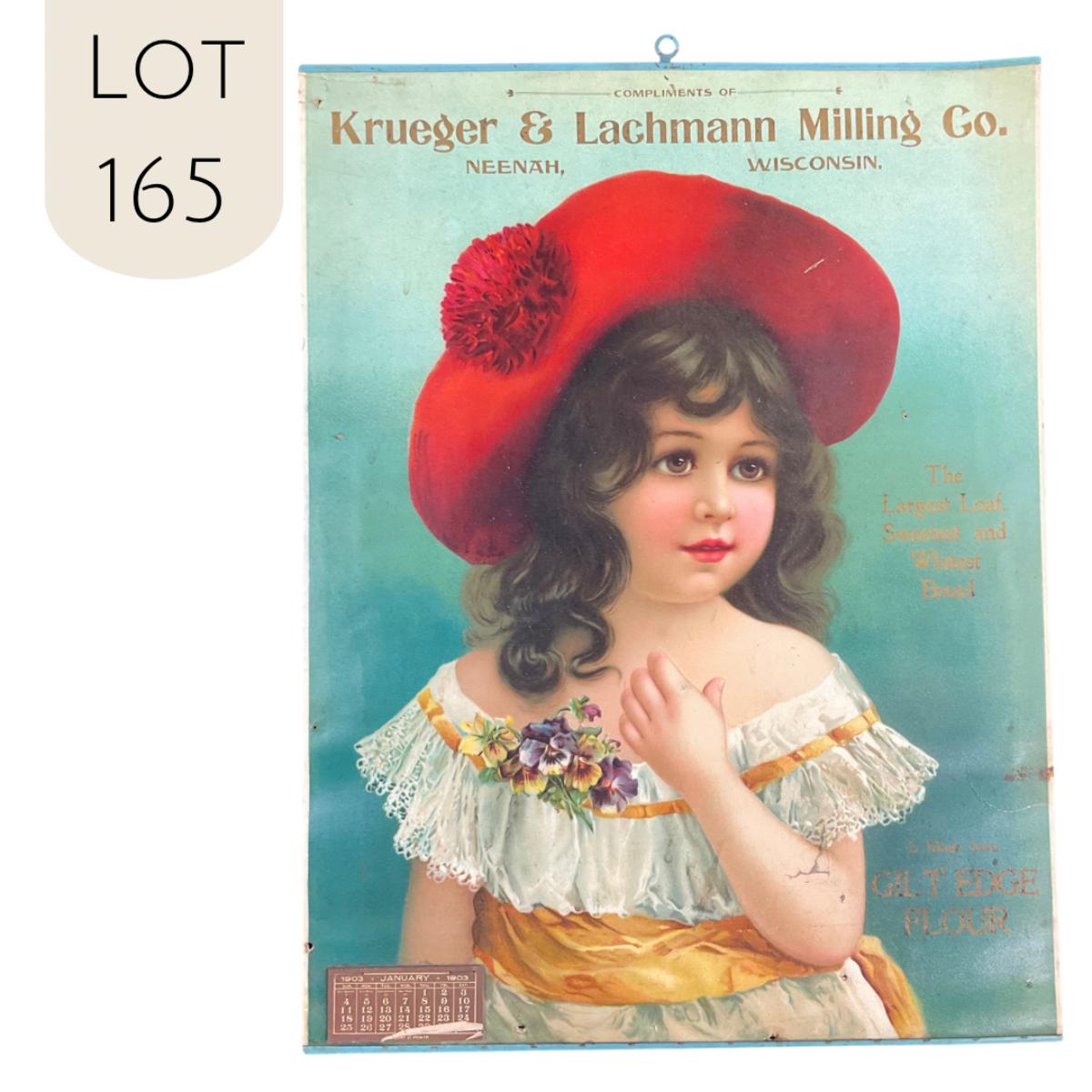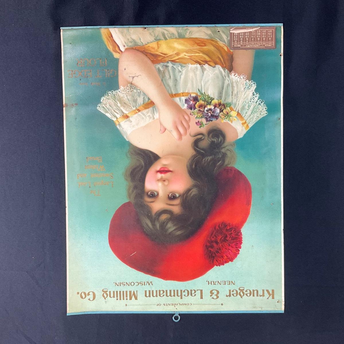 This GORGEOUS Calendar was produced to promote the Krueger & Lachmann Milling company, located in Neenah Wisconsin. The "Gilt Edge Flour" - again, being a HUGE draw. The calendar features a portrait of a young brunette woman holding pansies. The calendar is complete, showing January 1904. The calendar measures 15" x 19 3/4". **|** Please see photos for details and condition. ::: Shipping is available on this lot. If you require shipping you must let us know at the close of the auction. We will coordinate with you after the item has been won. Shipping fees will include insurance up to or exceeding the value of all items being mailed. If you have any questions regarding this lot please contact the auctioneer either via this website, by direct email or by phone. PICK UP TIMES and other important information can be found in the TERMS and DESCRIPTION of the auction. Please take a look for pertinent information. Thanks!