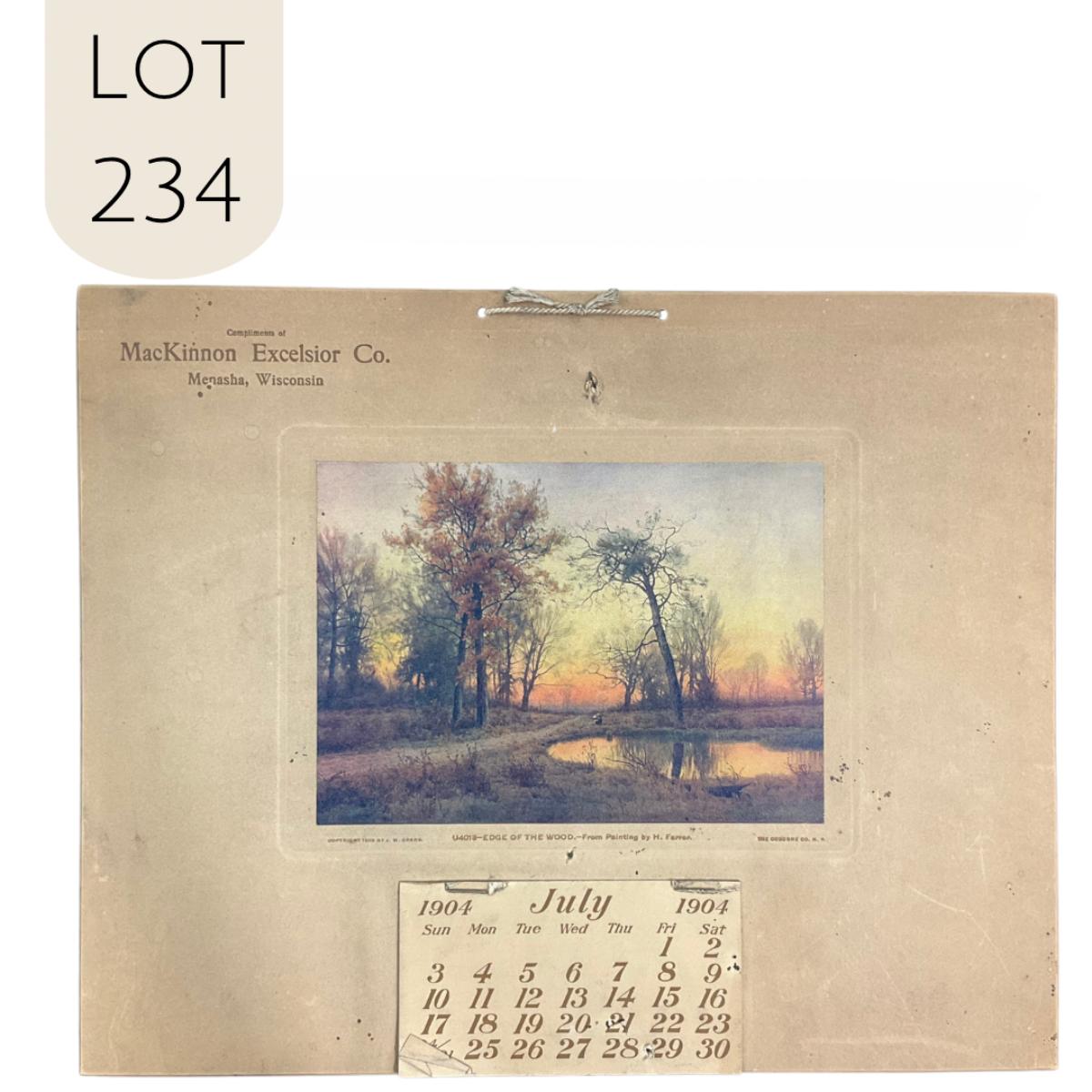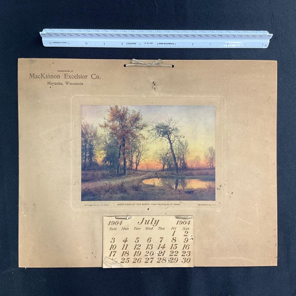This calendar was compliments of the MacKinnon Excelsior Company of Menasha Wisconsin. The calendar features a picture of a landscape titled "Edge of the Wood", original painting by H Farrer, copyright 1903, J W Crane. This calendar was published by The Osbourne Company of New York. This calendar is incomplete, showing July 1904. This calendar measures 14 5/8" x 11 3/4". **|** Please see photos for details and condition. ::: Shipping is available on this lot. If you require shipping you must let us know at the close of the auction. We will coordinate with you after the item has been won. Shipping fees will include insurance up to or exceeding the value of all items being mailed. If you have any questions regarding this lot please contact the auctioneer either via this website, by direct email or by phone. PICK UP TIMES and other important information can be found in the TERMS and DESCRIPTION of the auction. Please take a look for pertinent information. Thanks!