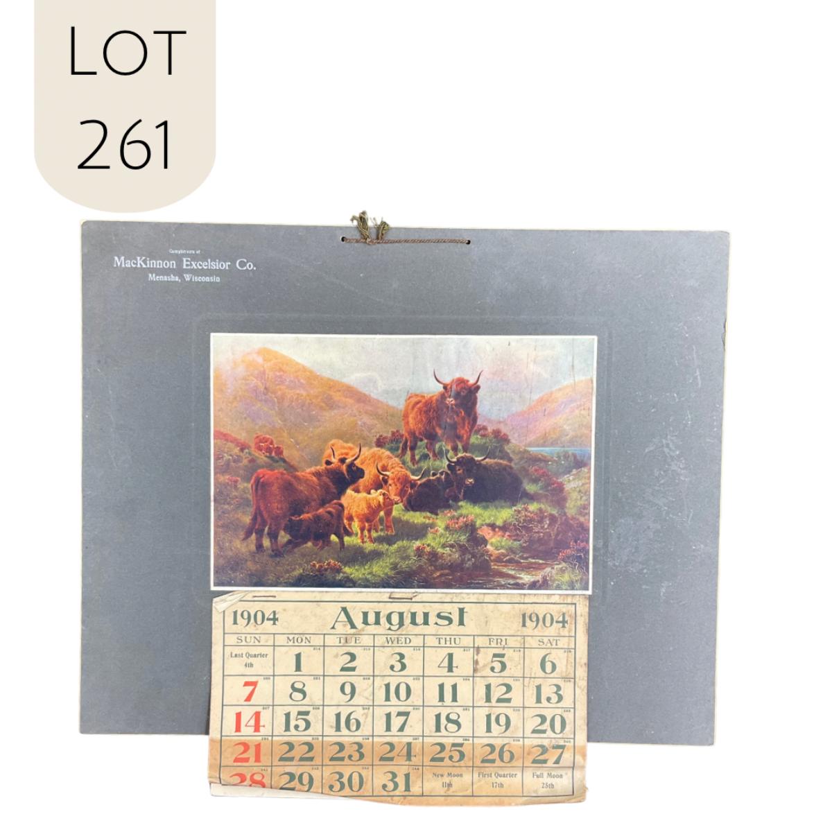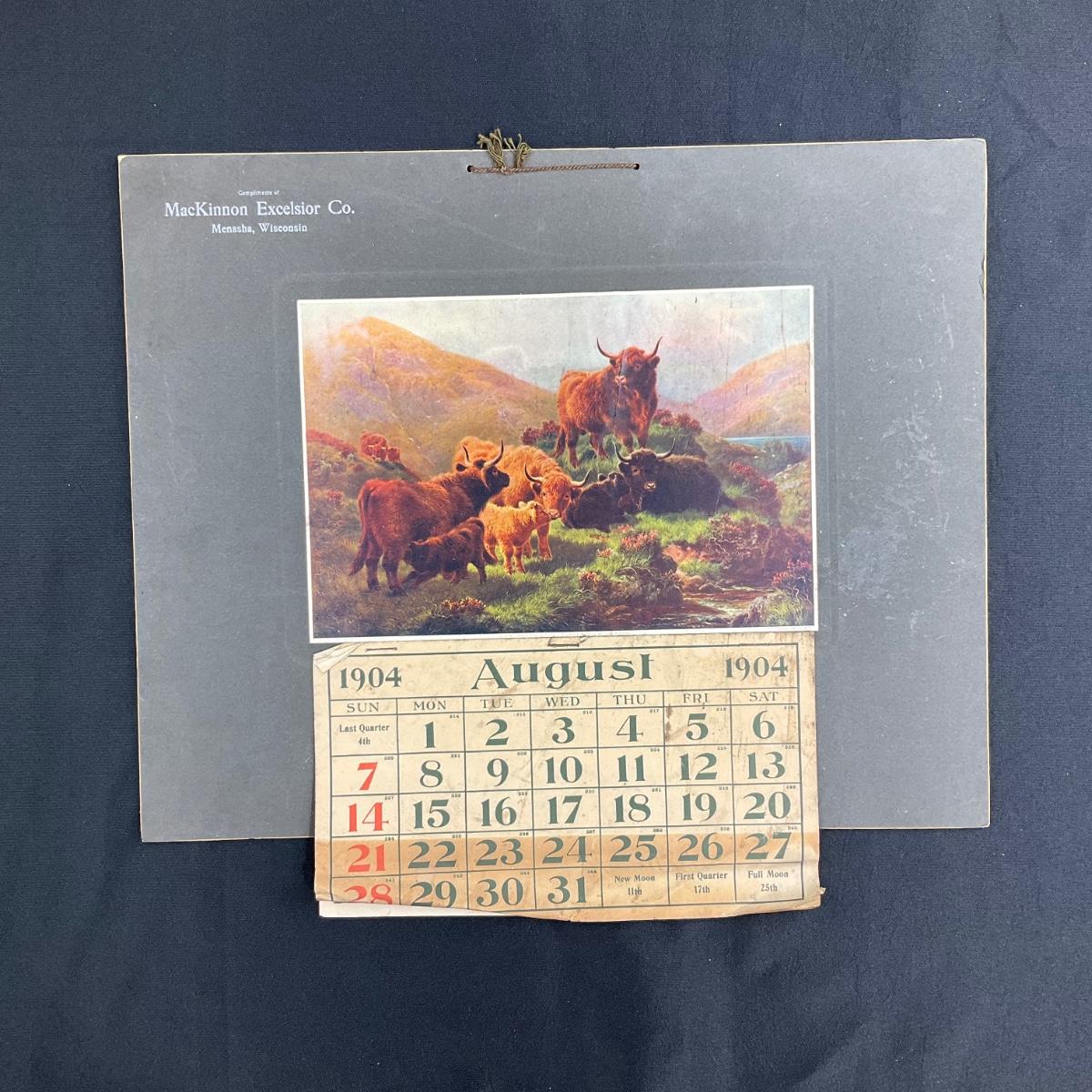 This calendar was compliments of the MacKinnon Excelsior Company of Menasha, Wisconsin. This calendar features a cattle landscape picture titled "Highland Cattle" original painting by William R C Watson, 1899. This calendar is copyright 1902, the American Colortype Company. This calendar measures 20 5/8" x 9". **|** Please see photos for details and condition. ::: Shipping is available on this lot. If you require shipping you must let us know at the close of the auction. We will coordinate with you after the item has been won. Shipping fees will include insurance up to or exceeding the value of all items being mailed. If you have any questions regarding this lot please contact the auctioneer either via this website, by direct email or by phone. PICK UP TIMES and other important information can be found in the TERMS and DESCRIPTION of the auction. Please take a look for pertinent information. Thanks!