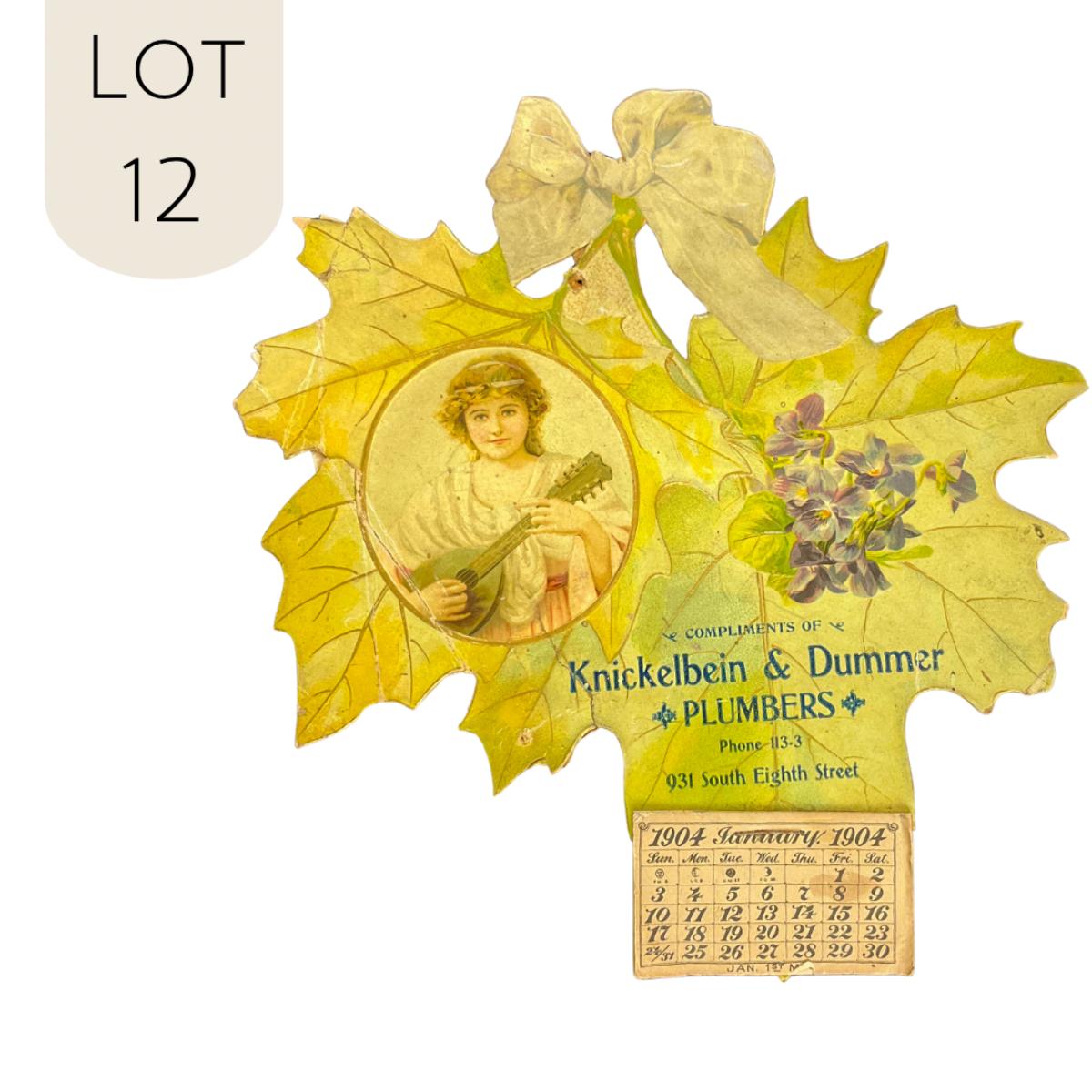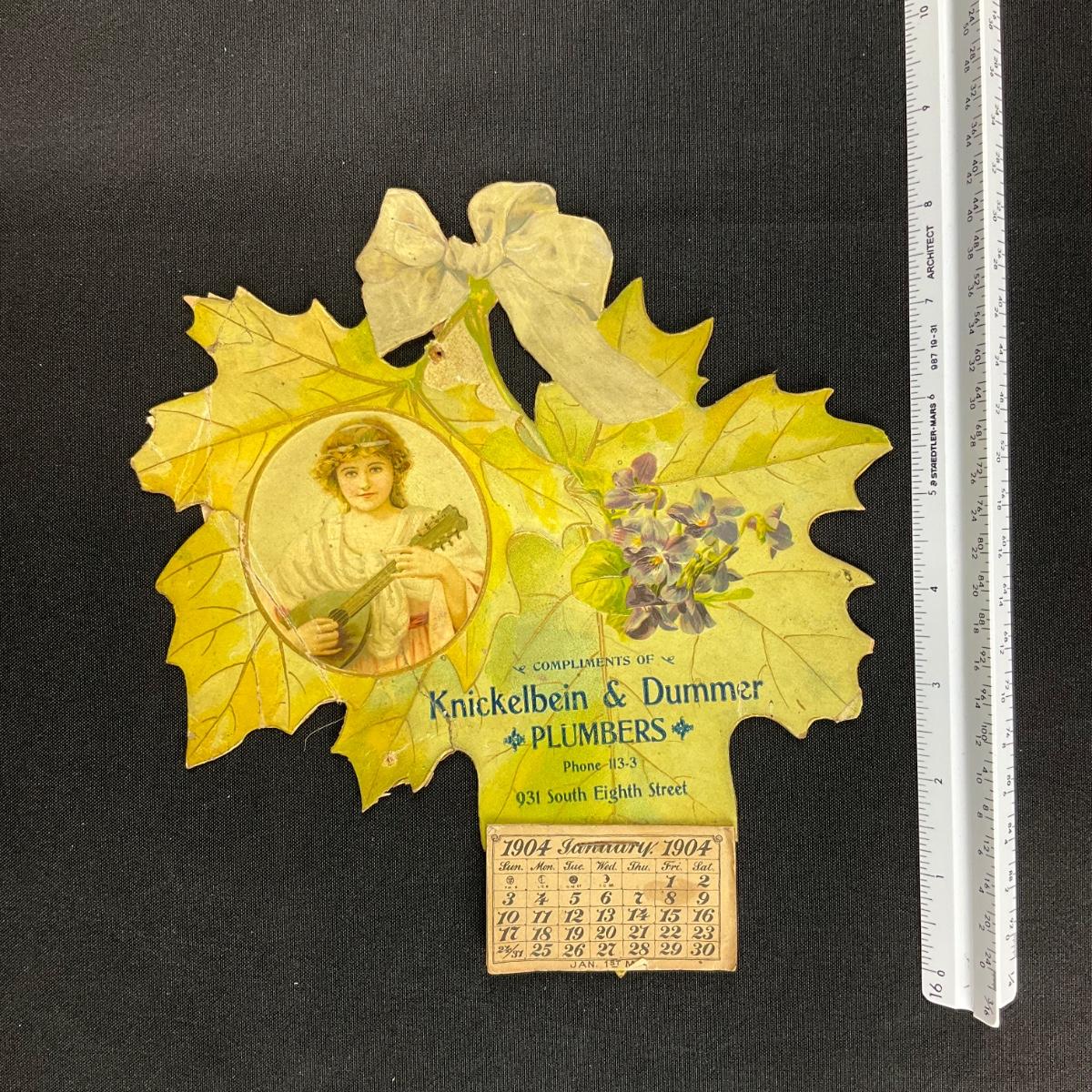 Knickelbein & Dummer were the plumbers to call in 1904! Located at 931 South Eighth Street in an unnamed city. This Die Cut Calendar features a Grecian woman playing a lute. The Leaves? Grape Leaves? You tell me! Calendar is complete, showing January. Calendar measures Approximately 8" x 8 1/2". **|** Please see photos for details and condition. ::: Shipping is available on this lot. If you require shipping you must let us know at the close of the auction. We will coordinate with you after the item has been won. Shipping fees will include insurance up to or exceeding the value of all items being mailed. If you have any questions regarding this lot please contact the auctioneer either via this website, by direct email or by phone. PICK UP TIMES and other important information can be found in the TERMS and DESCRIPTION of the auction. Please take a look for pertinent information. Thanks!