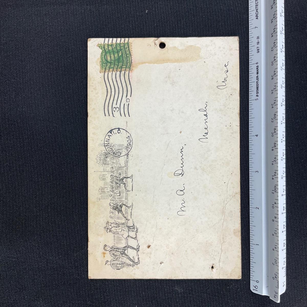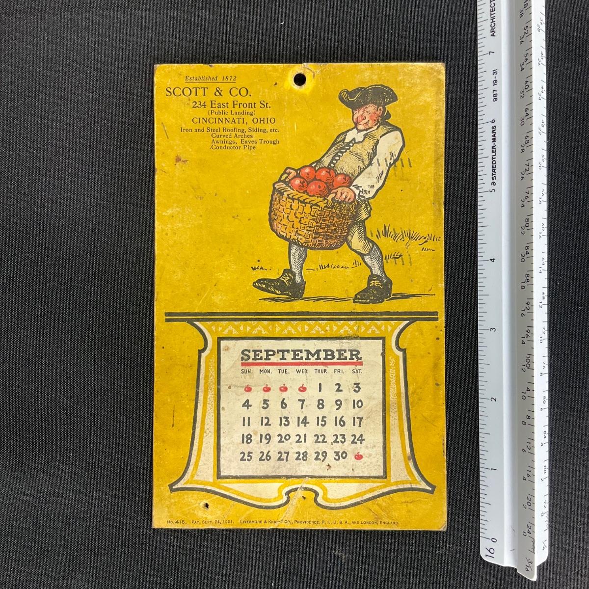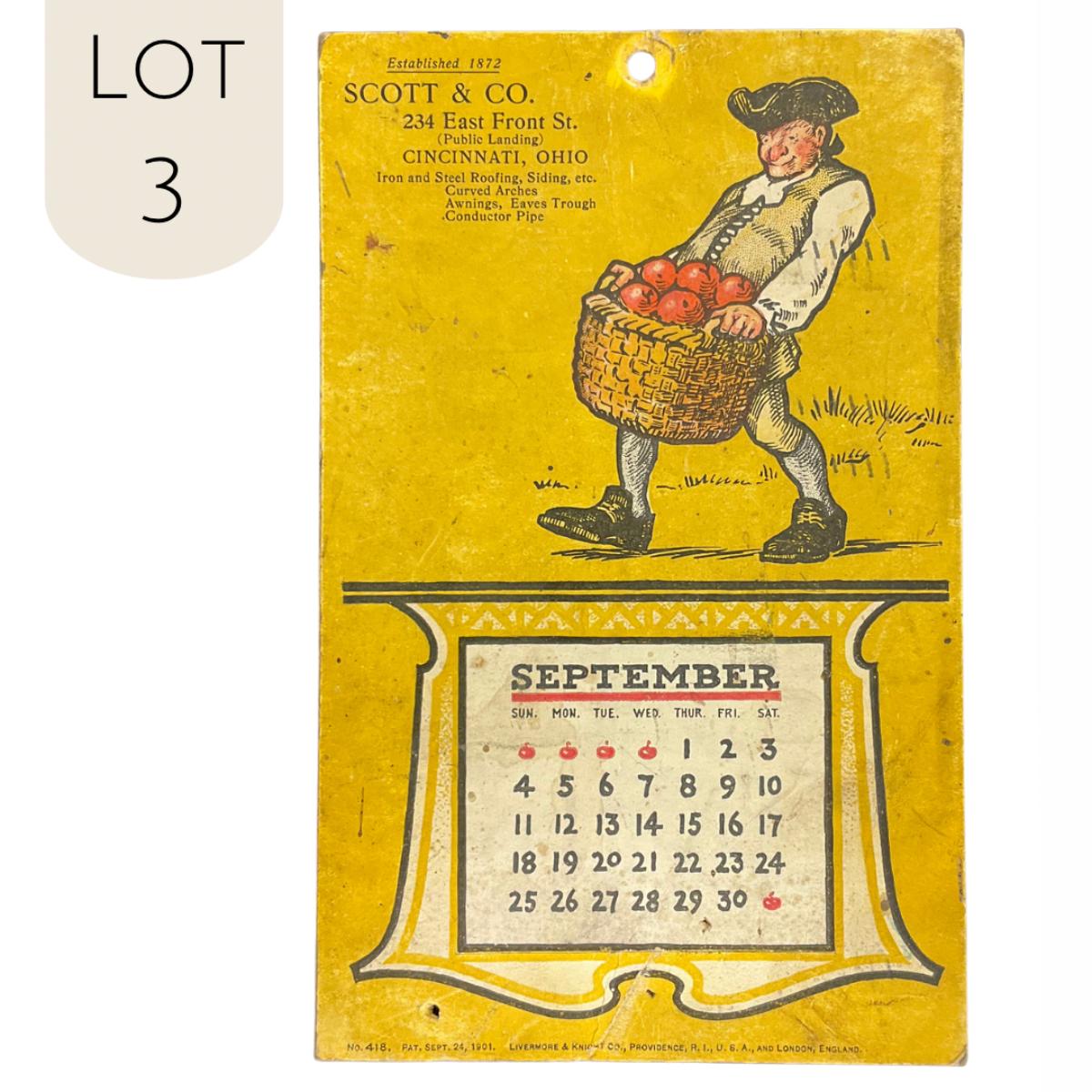 Adorable Colonial man carrying a bushel of apples on this 1904 Calendar compliments of Scott & Co a roofing and siding company. Calendar is incomplete and shows September. Calendar measures 4 1/4" x 6 3/4" Was mailed, and has a cancelled stamp on the reverse. Calendar is model number 418 from Livermore and Knight CO. **|** Please see photos for details and condition. ::: Shipping is available on this lot. If you require shipping you must let us know at the close of the auction. We will coordinate with you after the item has been won. Shipping fees will include insurance up to or exceeding the value of all items being mailed. If you have any questions regarding this lot please contact the auctioneer either via this website, by direct email or by phone. PICK UP TIMES and other important information can be found in the TERMS and DESCRIPTION of the auction. Please take a look for pertinent information. Thanks!