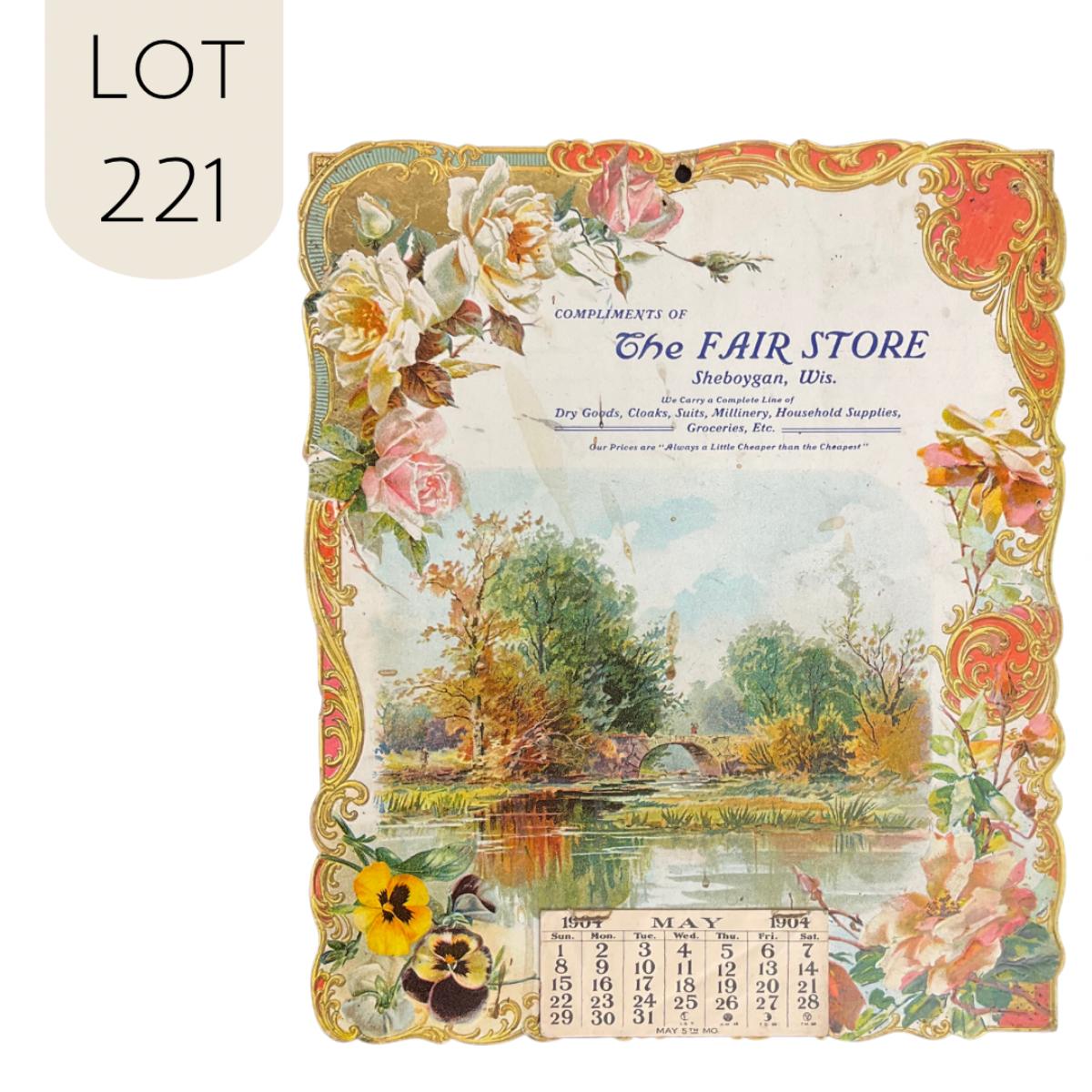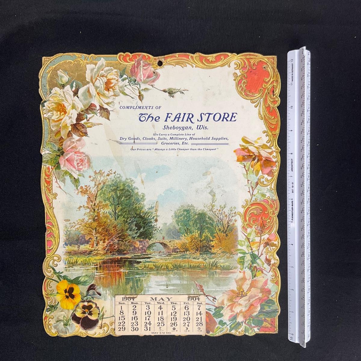 This calendar was compliments of The Fair Store of Sheboygan Wisconsin. The calendar features a Bridge Landscape with a rose and pansy border. Their prices were always "a little cheaper than the cheapest". This calendar is incomplete, showing May 1904. The calendar measures 10 1/2" x 12 1/2". **|** Please see photos for details and condition. ::: Shipping is available on this lot. If you require shipping you must let us know at the close of the auction. We will coordinate with you after the item has been won. Shipping fees will include insurance up to or exceeding the value of all items being mailed. If you have any questions regarding this lot please contact the auctioneer either via this website, by direct email or by phone. PICK UP TIMES and other important information can be found in the TERMS and DESCRIPTION of the auction. Please take a look for pertinent information. Thanks!
