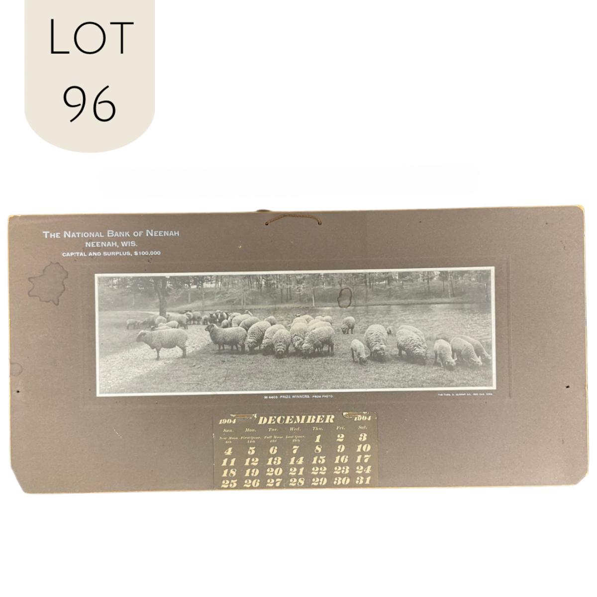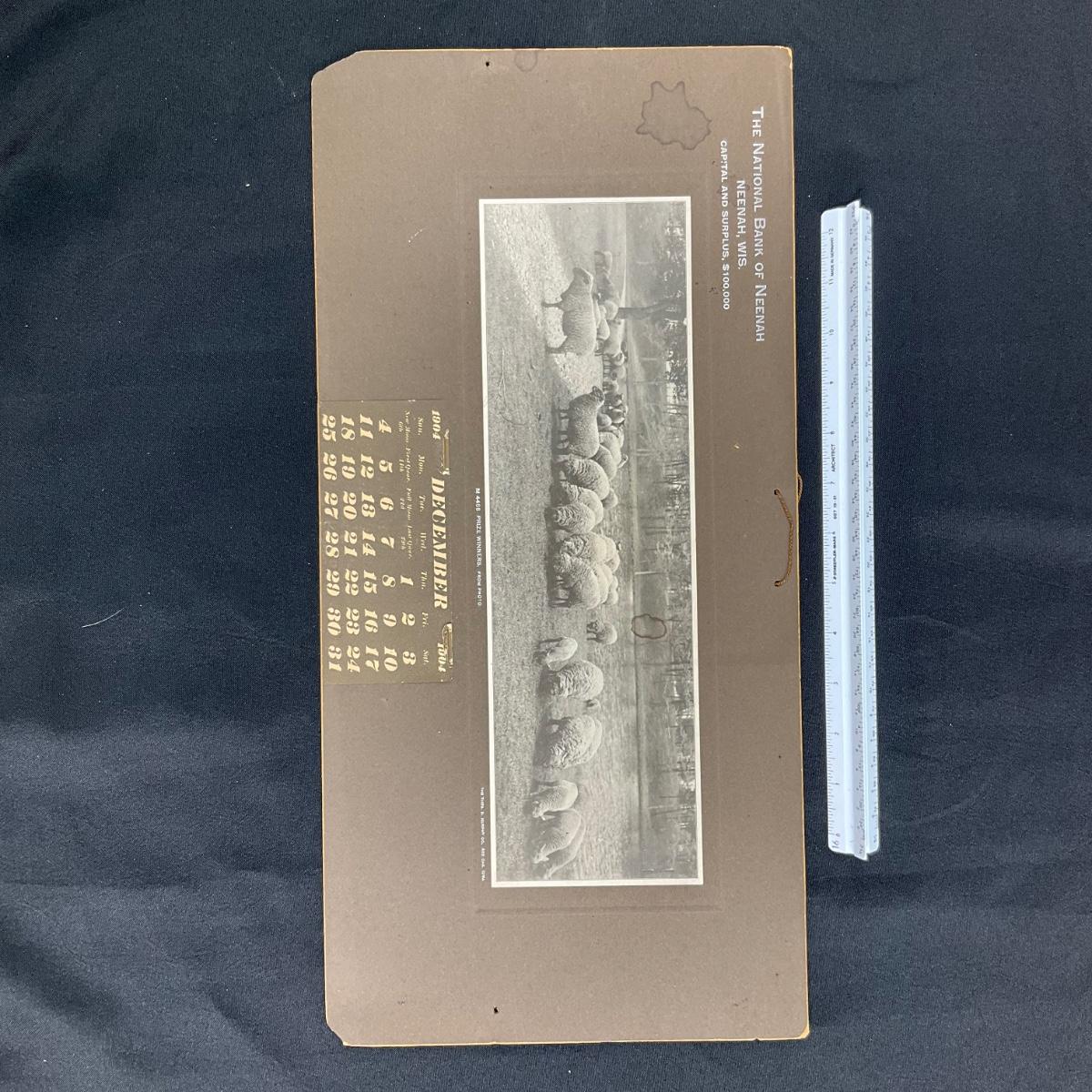 This calendar was compliments of The National Bank of Neenah, Wisconsin. The calendar features a photo of sheep grazing by a waterway. There is no accreditation for the photo. This calendar is incomplete, showing December 1904. This calendar measures 19 3/4" x 9 1/2". **|** Please see photos for details and condition. ::: Shipping is available on this lot. If you require shipping you must let us know at the close of the auction. We will coordinate with you after the item has been won. Shipping fees will include insurance up to or exceeding the value of all items being mailed. If you have any questions regarding this lot please contact the auctioneer either via this website, by direct email or by phone. PICK UP TIMES and other important information can be found in the TERMS and DESCRIPTION of the auction. Please take a look for pertinent information. Thanks!