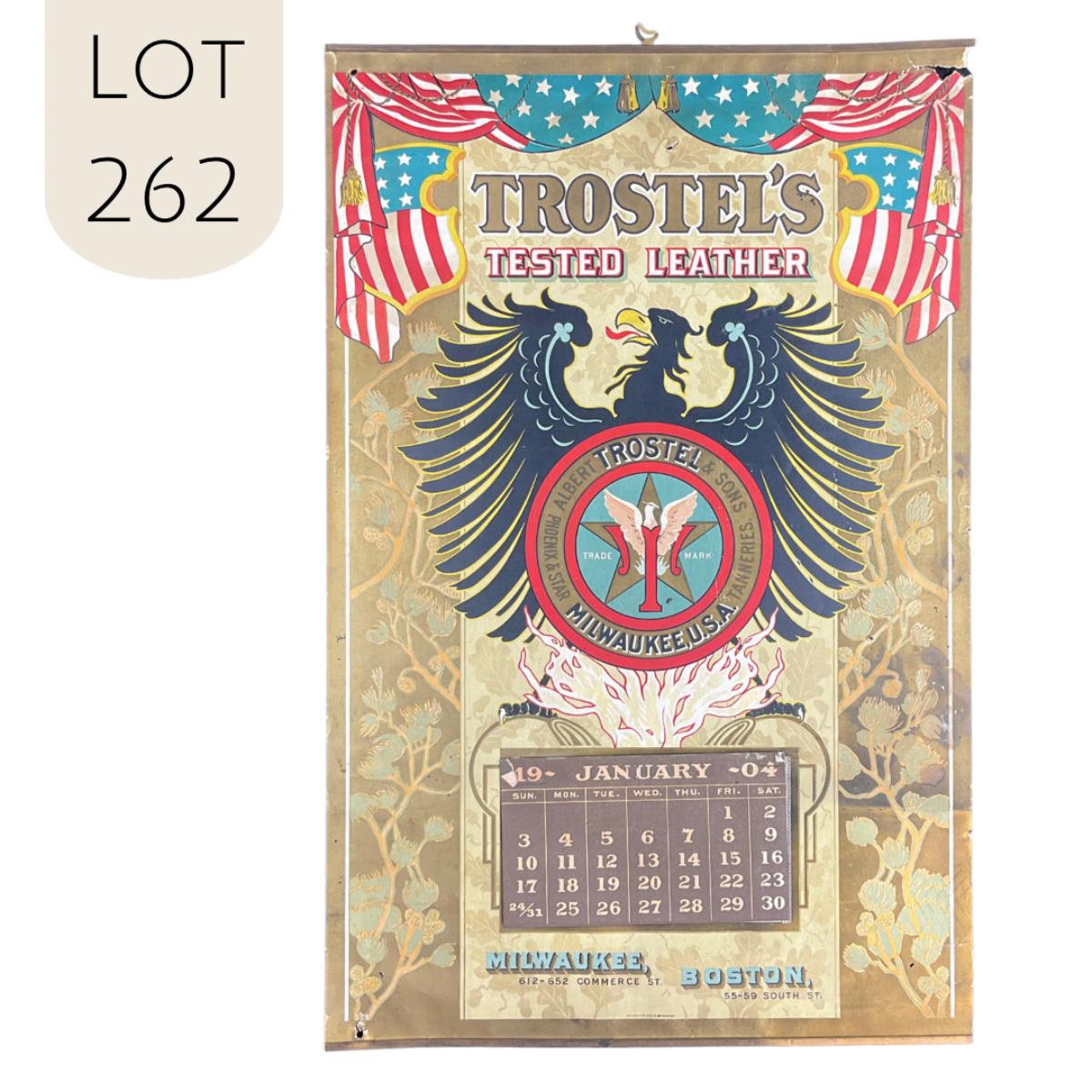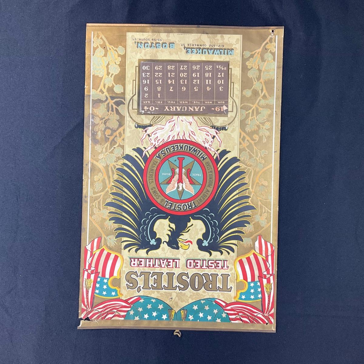 This calendar was compliments of Trestle's Tested Leather of Milwaukee, Wisconsin. This calendar features the Trestle's Trademark Phoenix Bird. The Phoenix & Star Tanneries of Milwaukee Wisconsin, also affiliated with this calendar. The calendar is complete, showing January 1904. This calendar measures 12 3/8" x 19". **|** Please see photos for details and condition. ::: Shipping is available on this lot. If you require shipping you must let us know at the close of the auction. We will coordinate with you after the item has been won. Shipping fees will include insurance up to or exceeding the value of all items being mailed. If you have any questions regarding this lot please contact the auctioneer either via this website, by direct email or by phone. PICK UP TIMES and other important information can be found in the TERMS and DESCRIPTION of the auction. Please take a look for pertinent information. Thanks!