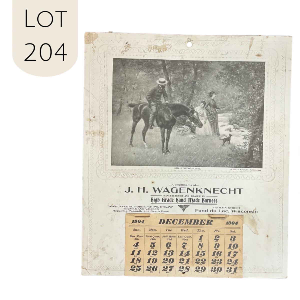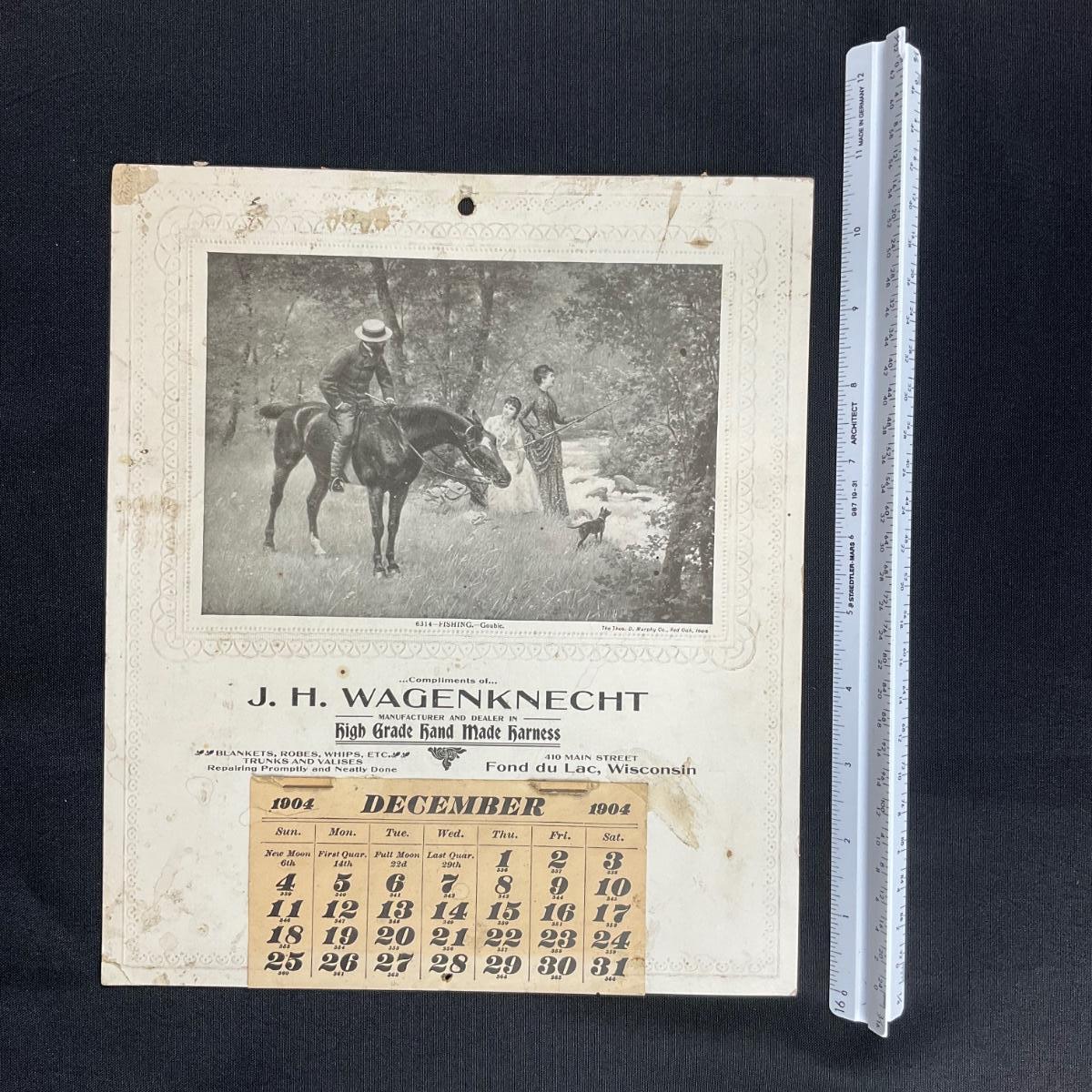 This calendar was produced by the Thos. D. Murphy Company of Red Oak Iowa. This calendar promotes J H Wagenknecht, a harness manufacturer in Fond du Lac Wisconsin. This calendar features a fishing scene with a dog, two women and a man on a horse titled "Fishing", original by Jean Richard Double. This calendar is incomplete, showing December 1904. This calendar weighs 9 1/4" x 10 3/4". **|** Please see photos for details and condition. ::: Shipping is available on this lot. If you require shipping you must let us know at the close of the auction. We will coordinate with you after the item has been won. Shipping fees will include insurance up to or exceeding the value of all items being mailed. If you have any questions regarding this lot please contact the auctioneer either via this website, by direct email or by phone. PICK UP TIMES and other important information can be found in the TERMS and DESCRIPTION of the auction. Please take a look for pertinent information. Thanks!