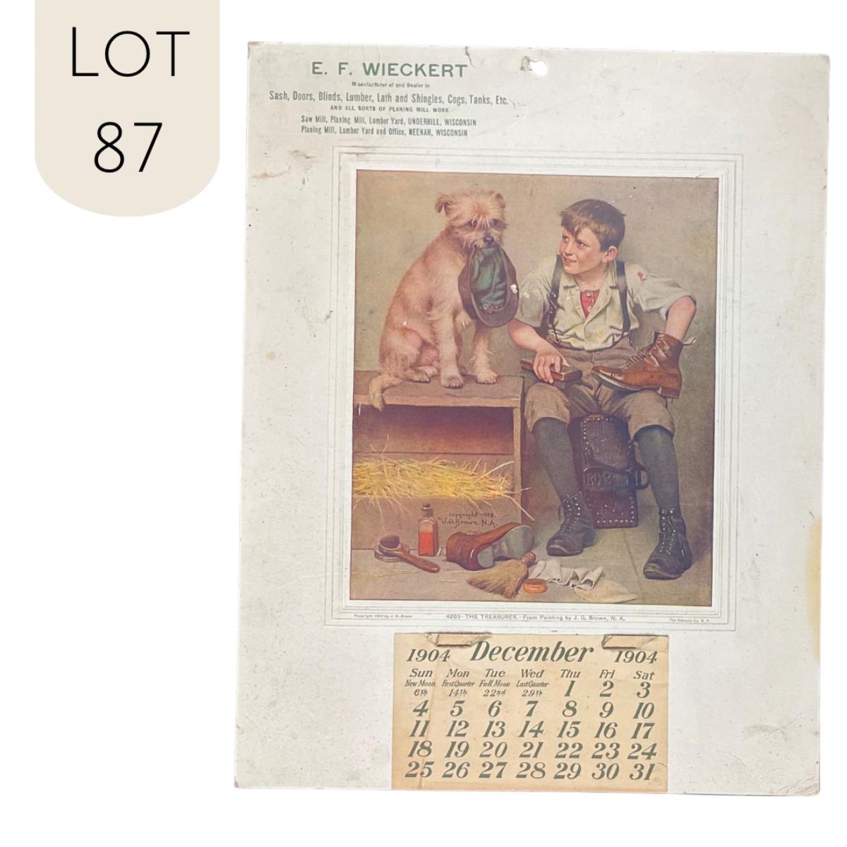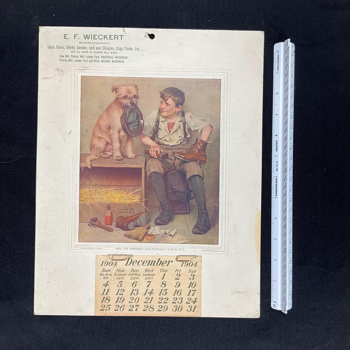 This calendar was courtesy of E F Wieckert, dealers of Sash, Doors, Blinds. Lumber Lath and Shingles, Cogs, Tanks Etc. (and all sorts of planing mill work). They had two locations, one in Underhill and one in Neenah. This calendar features a picture titled " The Treasurer" original painting by JG Brown, copyright 1902; calendar printed by the Osbourne Company of New York. The picture depicts a young boy with a dog polishing his shoes. The calendar is incomplete, showing December 1904. The calendar measures 10 3/4" x 13 3/4". **|** Please see photos for details and condition. ::: Shipping is available on this lot. If you require shipping you must let us know at the close of the auction. We will coordinate with you after the item has been won. Shipping fees will include insurance up to or exceeding the value of all items being mailed. If you have any questions regarding this lot please contact the auctioneer either via this website, by direct email or by phone. PICK UP TIMES and other important information can be found in the TERMS and DESCRIPTION of the auction. Please take a look for pertinent information. Thanks!