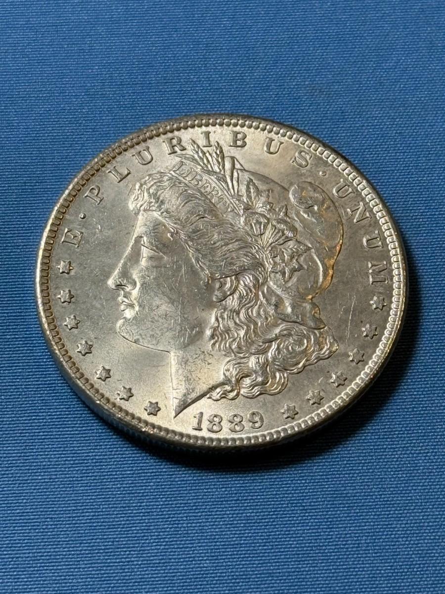 1889 AU/UNCIRCULATED CONDITION MORGAN SILVER DOLLAR AS PICTURED. (COIN-7RS). $5 DOMESTIC SHIPPING.