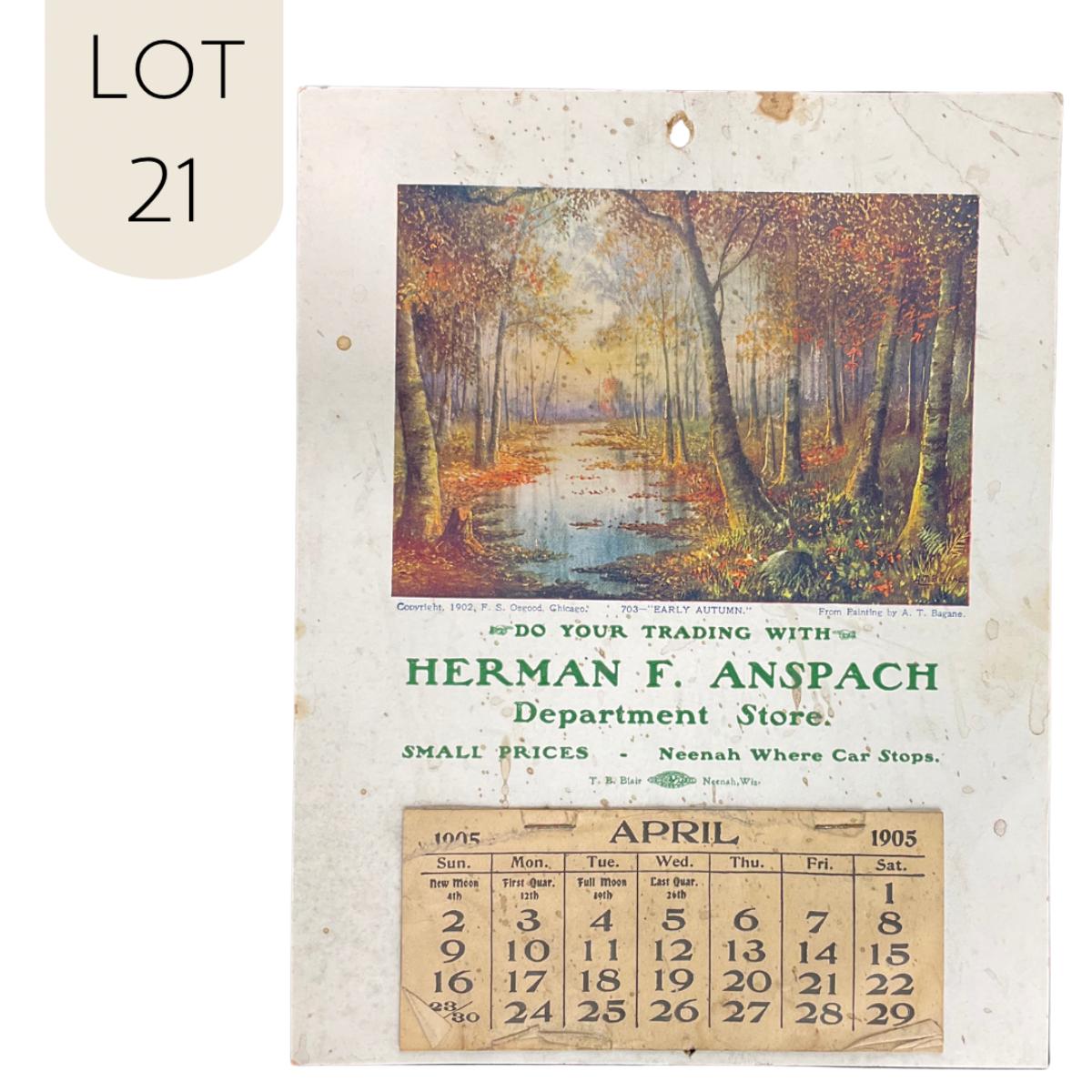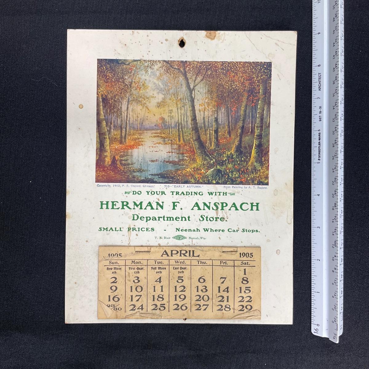 The beauty of this Early Autumn landscape painting, originally by A T Bagane, is still vibrant as it was in 1905, albeit a little stained. Herman F Anspach was begging you to do your trading at his Department Store in Neenah. This Calendar style is Copyright 1902, F S Osgood, Chicago IL. This calendar bears a UNION stamp, from T B Blair Printing in Neenah Wisconsin. This calendar is incomplete and shows April. This Calendar measures 7" x 9". **|** Please see photos for details and condition. ::: Shipping is available on this lot. If you require shipping you must let us know at the close of the auction. We will coordinate with you after the item has been won. Shipping fees will include insurance up to or exceeding the value of all items being mailed. If you have any questions regarding this lot please contact the auctioneer either via this website, by direct email or by phone. PICK UP TIMES and other important information can be found in the TERMS and DESCRIPTION of the auction. Please take a look for pertinent information. Thanks!