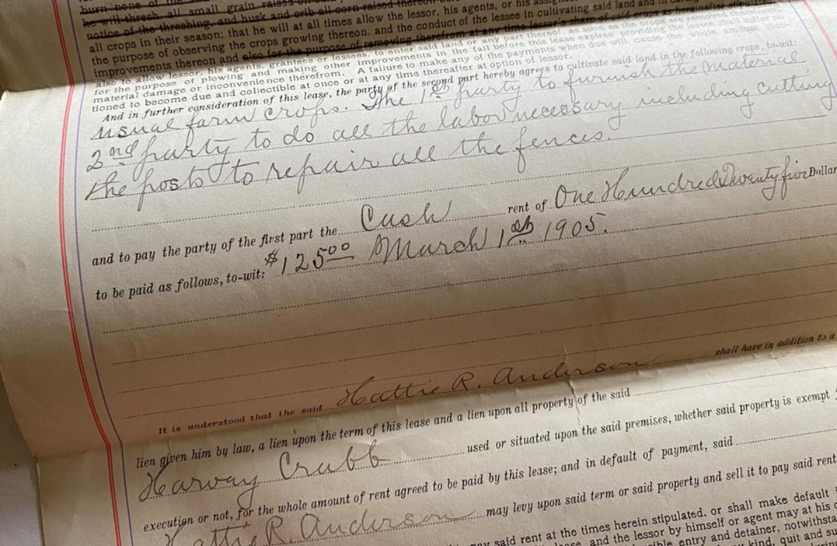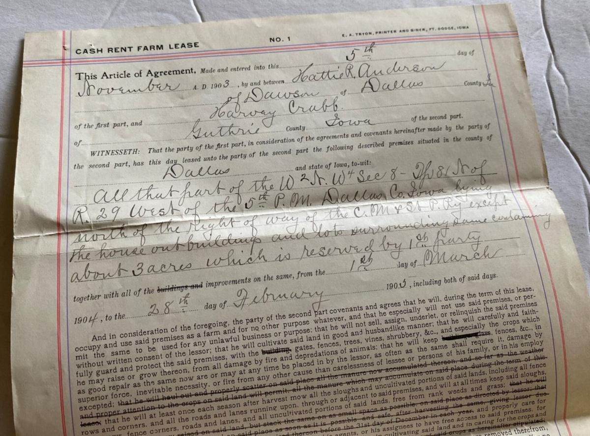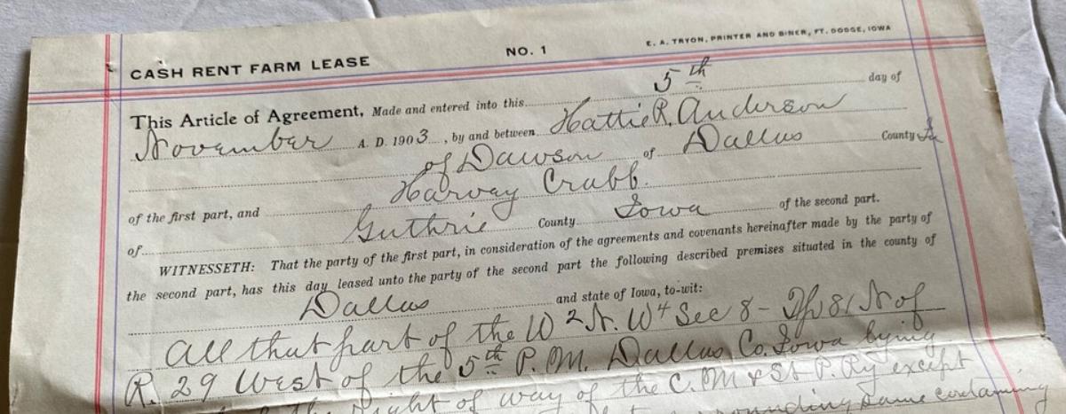 Here is an original CASH RENT FARM LEASE from Dawson in Dallas County, Iowa back in 1905...between Hattie R. Anderson of Dawson and Harvey Crubb of Guthrie County...The property was north of the right of way of the Chicago, Milwaukee & St. Paul Railway..