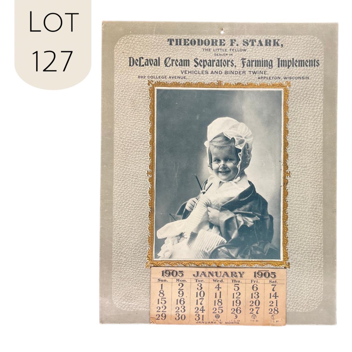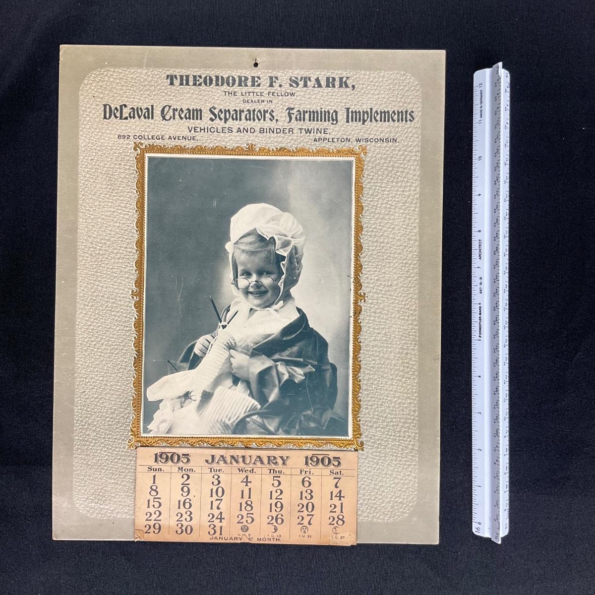 This calendar was courtesy of Theodore F Stark "The Little Fellow", dealer in DeLaval Cream Separators, Farming Implements, Vehicles and Binder twine. The Little Fellow was located in Appleton, WI. This calendar is complete, showing January 1905. The calendar features a picture of a child dressed in Grandma's clothing, knitting. This calendar measures 10 5/8" x 13 5/8". **|** Please see photos for details and condition. ::: Shipping is available on this lot. If you require shipping you must let us know at the close of the auction. We will coordinate with you after the item has been won. Shipping fees will include insurance up to or exceeding the value of all items being mailed. If you have any questions regarding this lot please contact the auctioneer either via this website, by direct email or by phone. PICK UP TIMES and other important information can be found in the TERMS and DESCRIPTION of the auction. Please take a look for pertinent information. Thanks!