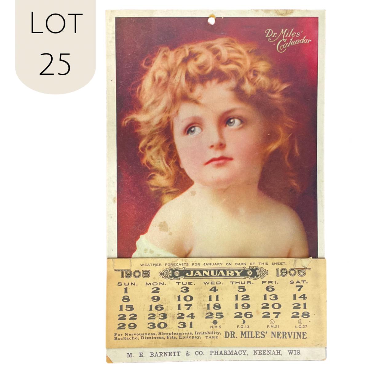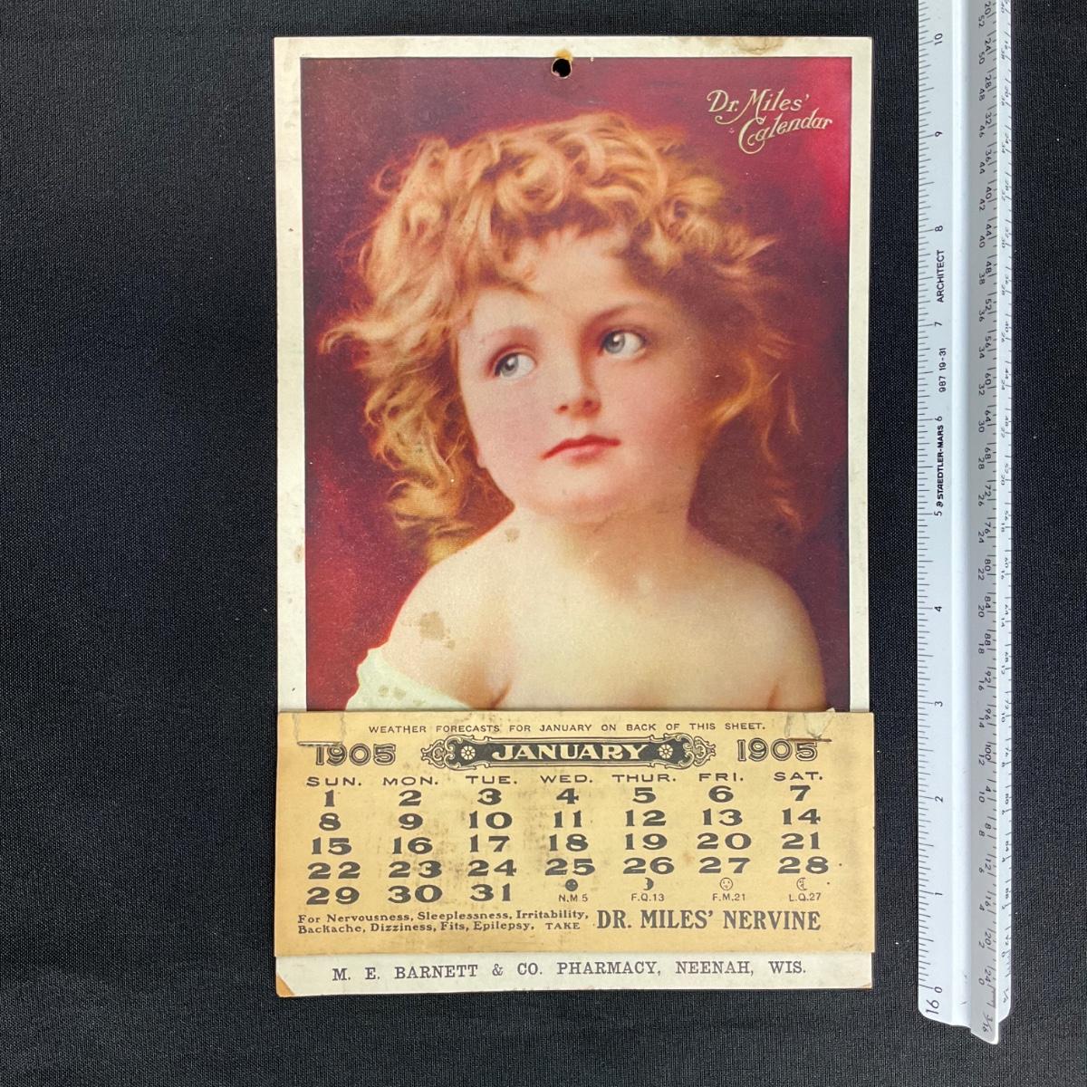 This beautiful calendar from 1905 promotes Dr Miles' Nervine drug that treats Nervousness, Sleeplessness, Irritability, Bachache, Dizziness, Fits, and Epilepsy too. This Calendar was used to promote M E Barnett & Co Pharmacy, located in Neenah, Wisconsin. Calendar is in exceptional condition for its age. Calendar measures 6 1/4" x 10". **|** Please see photos for details and condition. ::: Shipping is available on this lot. If you require shipping you must let us know at the close of the auction. We will coordinate with you after the item has been won. Shipping fees will include insurance up to or exceeding the value of all items being mailed. If you have any questions regarding this lot please contact the auctioneer either via this website, by direct email or by phone. PICK UP TIMES and other important information can be found in the TERMS and DESCRIPTION of the auction. Please take a look for pertinent information. Thanks!