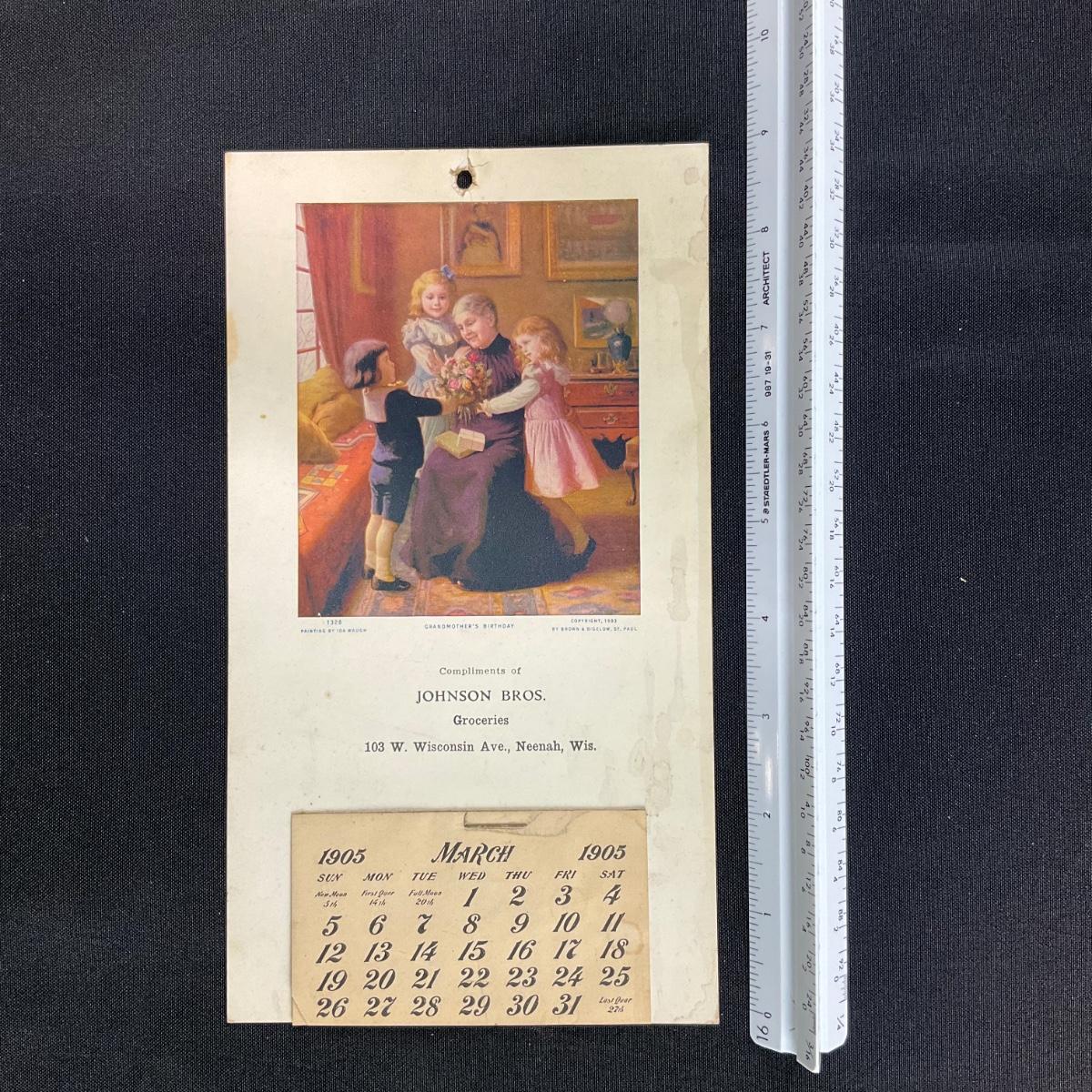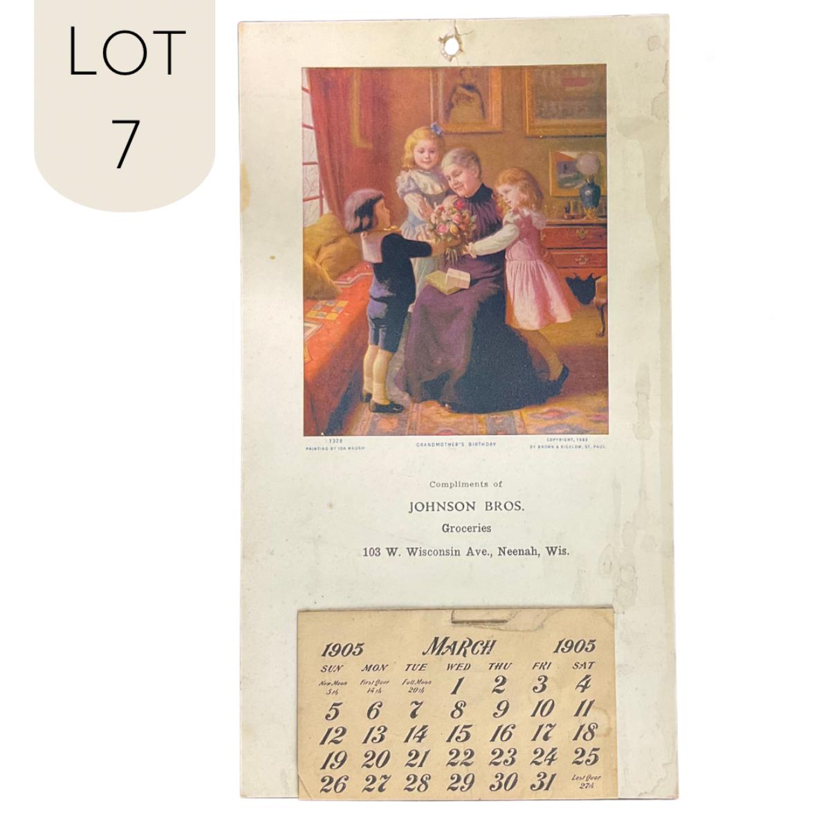 Nice 1905 Calendar "Grandmother's Birthday" original by Ida Waugh. Calendar Designed by Brown & Bigelow in 1902. Calendar is incomplete and shows March, currently. Calendar measures 5" x 9". **|** Please see photos for details and condition. ::: Shipping is available on this lot. If you require shipping you must let us know at the close of the auction. We will coordinate with you after the item has been won. Shipping fees will include insurance up to or exceeding the value of all items being mailed. If you have any questions regarding this lot please contact the auctioneer either via this website, by direct email or by phone. PICK UP TIMES and other important information can be found in the TERMS and DESCRIPTION of the auction. Please take a look for pertinent information. Thanks!