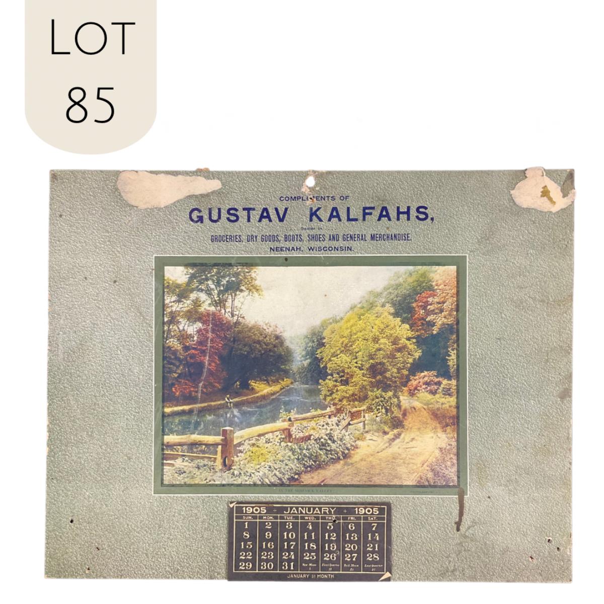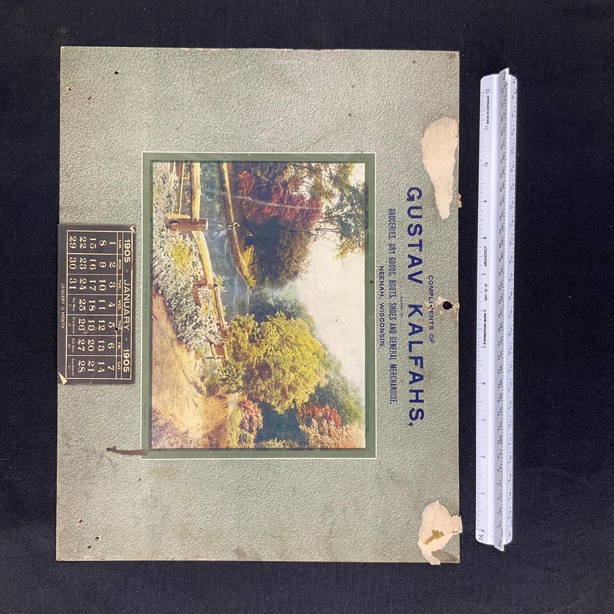 This calendar was courtesy of Kalfahs Grocery located in Neenah Wisconsin. The store specialized in Groceries, Dry Goods, Boots, Shoes and General Merchandise. The calendar features a picture titled "In The Mohawk Valley, which features a river landscape with fishermen. The calendar is complete, showing January 1905. The calendar Measures 14" x 11". **|** Please see photos for details and condition. ::: Shipping is available on this lot. If you require shipping you must let us know at the close of the auction. We will coordinate with you after the item has been won. Shipping fees will include insurance up to or exceeding the value of all items being mailed. If you have any questions regarding this lot please contact the auctioneer either via this website, by direct email or by phone. PICK UP TIMES and other important information can be found in the TERMS and DESCRIPTION of the auction. Please take a look for pertinent information. Thanks!