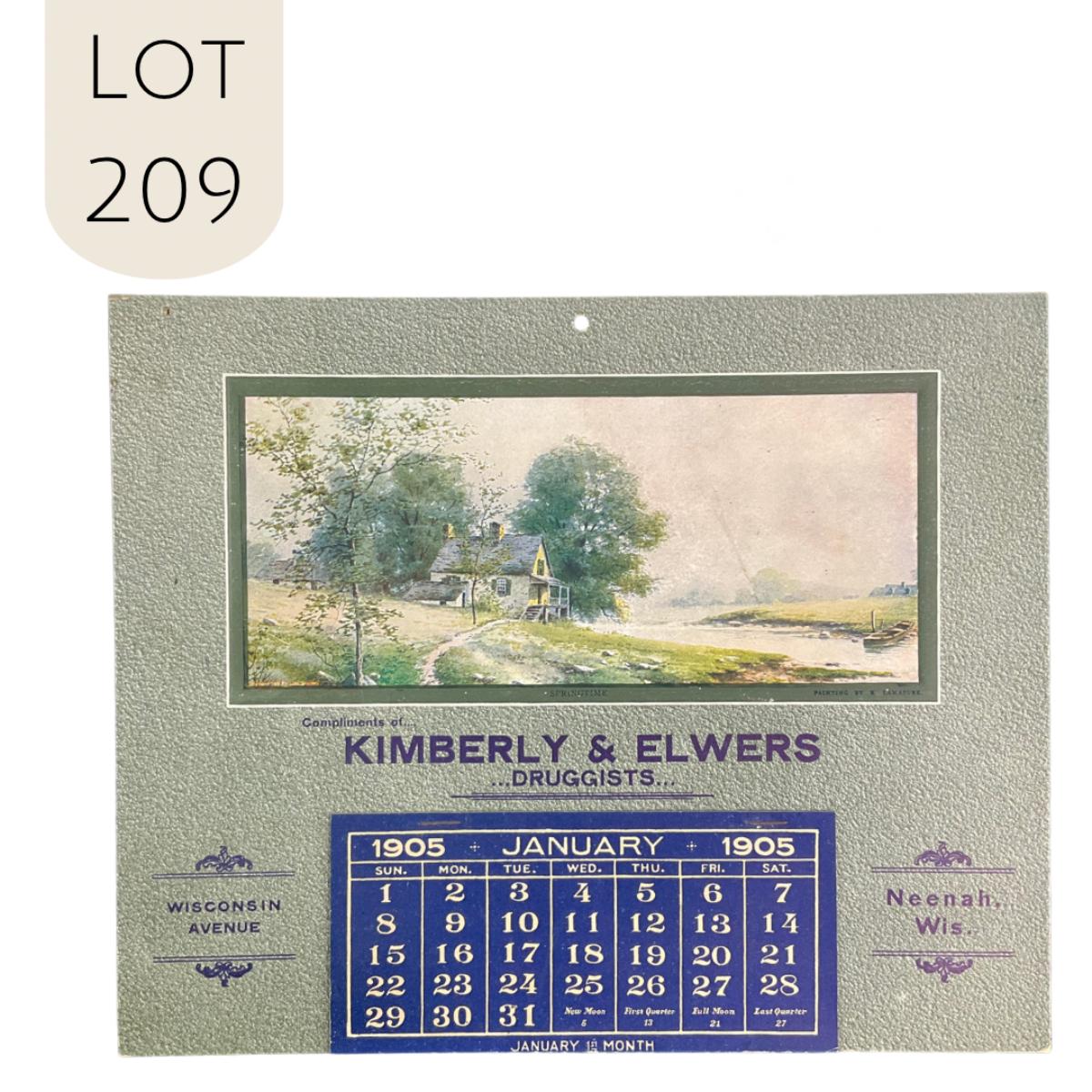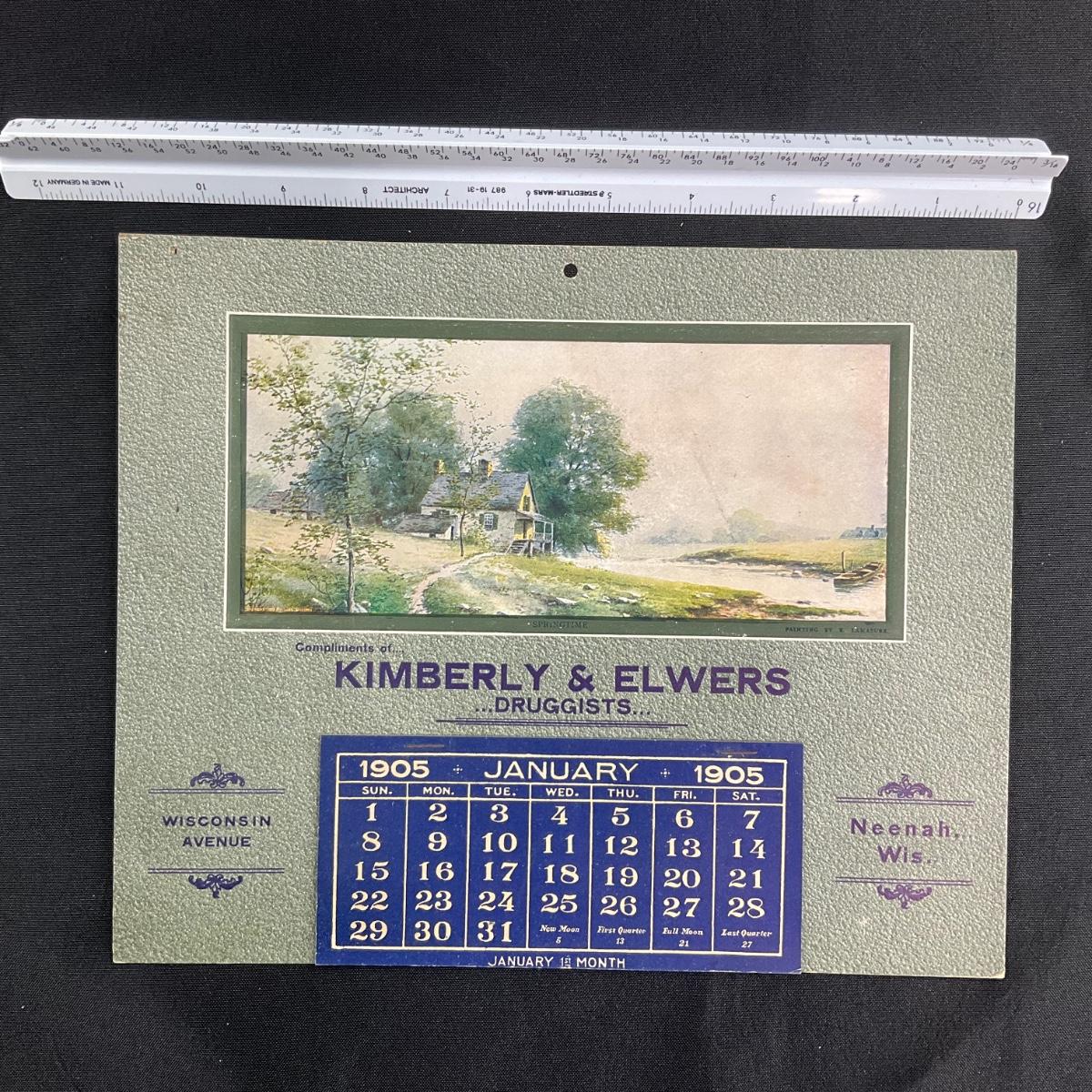 This 1905 Calendar was compliments of Kimberly & Elwers, Druggists and Apothecaries, located on Wisconsin Avenue in Neenah Wisconsin. This calendar is complete, showing January 1905. The calendar features a Landcape with a house and a pond, titled "Springtime" by Edwin LaMasure, copyright 1903 by Chas Williams. This calendar measures 11" x 8 7/8". **|** Please see photos for details and condition. ::: Shipping is available on this lot. If you require shipping you must let us know at the close of the auction. We will coordinate with you after the item has been won. Shipping fees will include insurance up to or exceeding the value of all items being mailed. If you have any questions regarding this lot please contact the auctioneer either via this website, by direct email or by phone. PICK UP TIMES and other important information can be found in the TERMS and DESCRIPTION of the auction. Please take a look for pertinent information. Thanks!