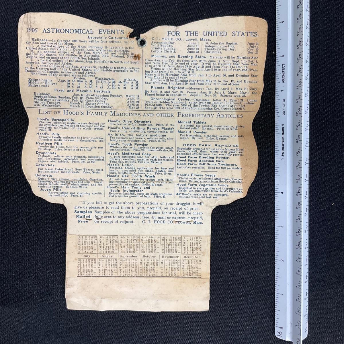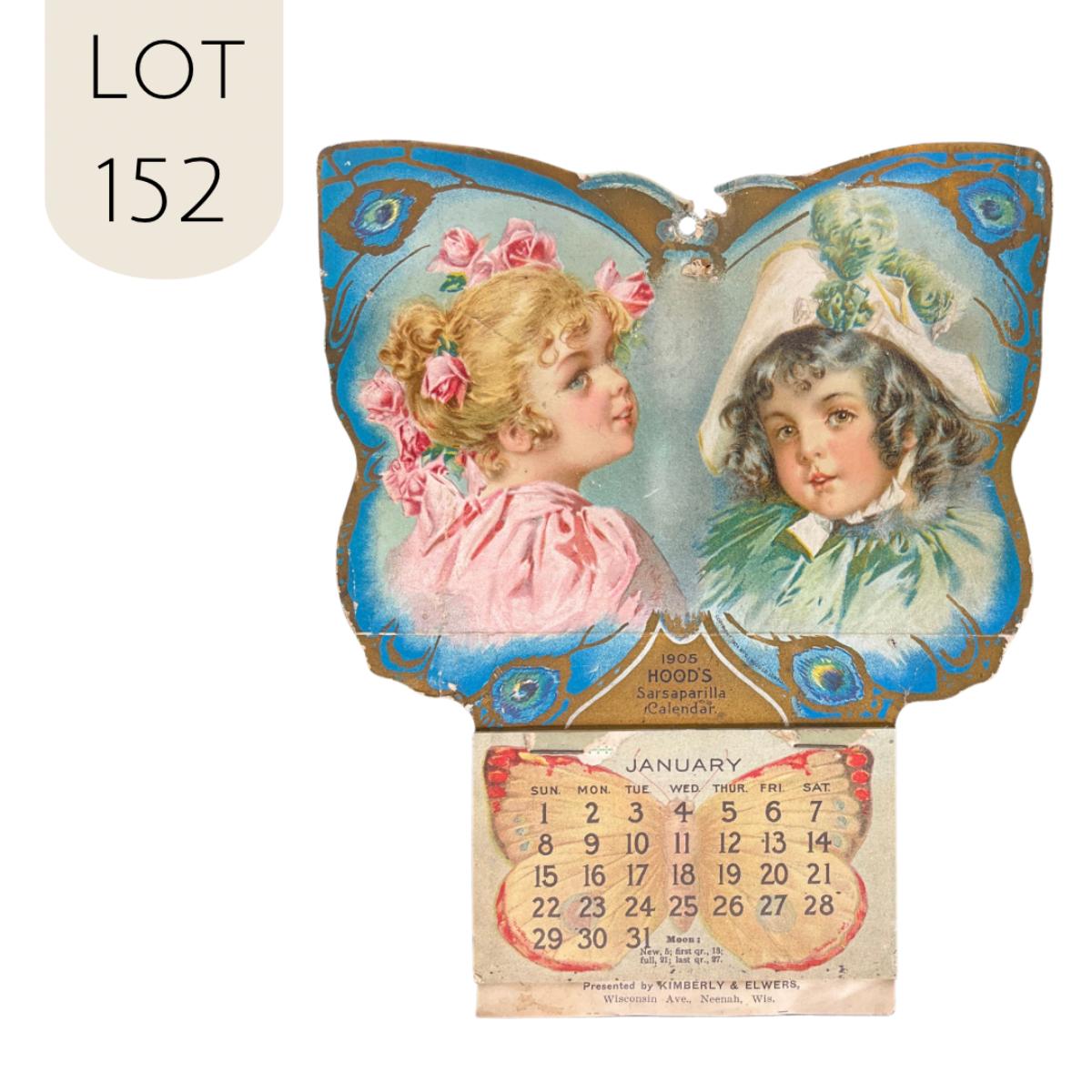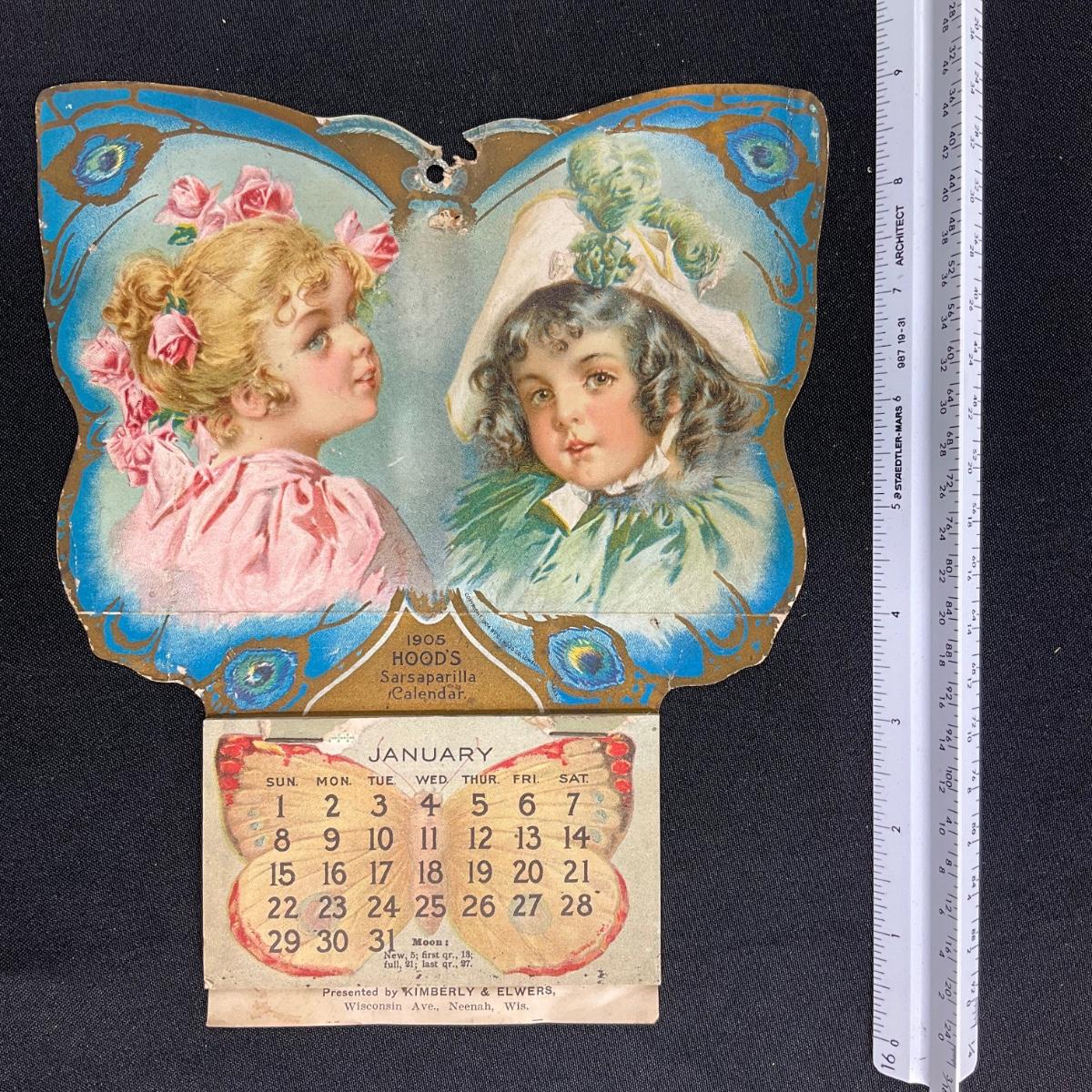 This calendar was compliments Hood's Sarsaparilla, specifically for Kimberly & Elwers, Druggists of Neenah Wisconsin. The calendar features a portrait of two girls, one blond with roses one brunette with a hat. All of that is placed inside a Die-Cut butterfly. The calendar is copyright 1904, C I Hood Co, Lowell Massachusetts. The calendar measures approximately 7 1/4" x 8 7/8". **|** Please see photos for details and condition. ::: Shipping is available on this lot. If you require shipping you must let us know at the close of the auction. We will coordinate with you after the item has been won. Shipping fees will include insurance up to or exceeding the value of all items being mailed. If you have any questions regarding this lot please contact the auctioneer either via this website, by direct email or by phone. PICK UP TIMES and other important information can be found in the TERMS and DESCRIPTION of the auction. Please take a look for pertinent information. Thanks!