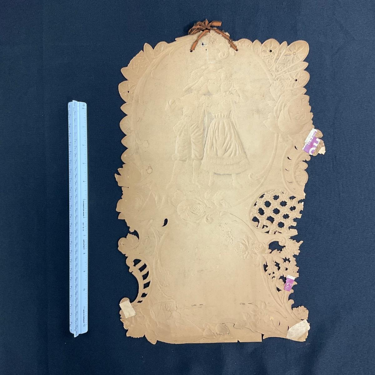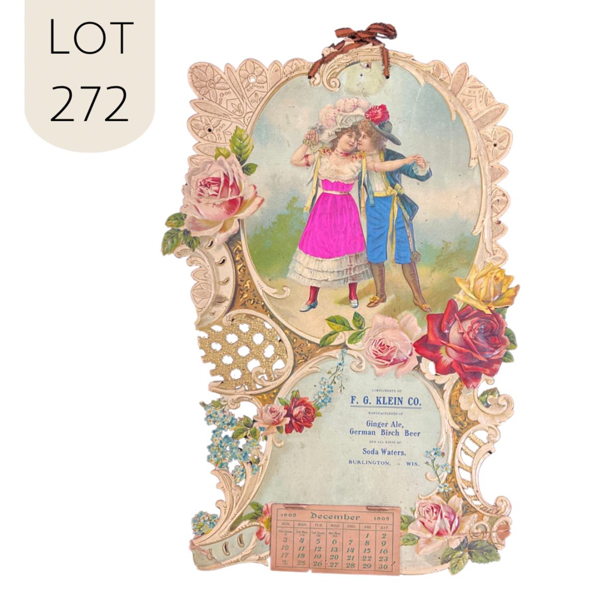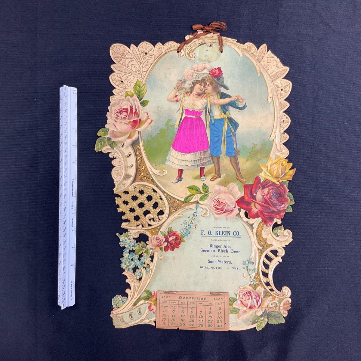 This calendar was compliments of the F G Klein Company, manufacturers of Ginger Ale, German Birch Beer and all kinds of Soda Waters, located in Burlington Wisconsin. This calendar features a young couple dancing - her in a very vibrant pink dress. This calendar is incomplete, showing December 1905 only. This Die-Cut Calendar measures 10 1/2" x 17 1/4". **|** Please see photos for details and condition. ::: Shipping is available on this lot. If you require shipping you must let us know at the close of the auction. We will coordinate with you after the item has been won. Shipping fees will include insurance up to or exceeding the value of all items being mailed. If you have any questions regarding this lot please contact the auctioneer either via this website, by direct email or by phone. PICK UP TIMES and other important information can be found in the TERMS and DESCRIPTION of the auction. Please take a look for pertinent information. Thanks!