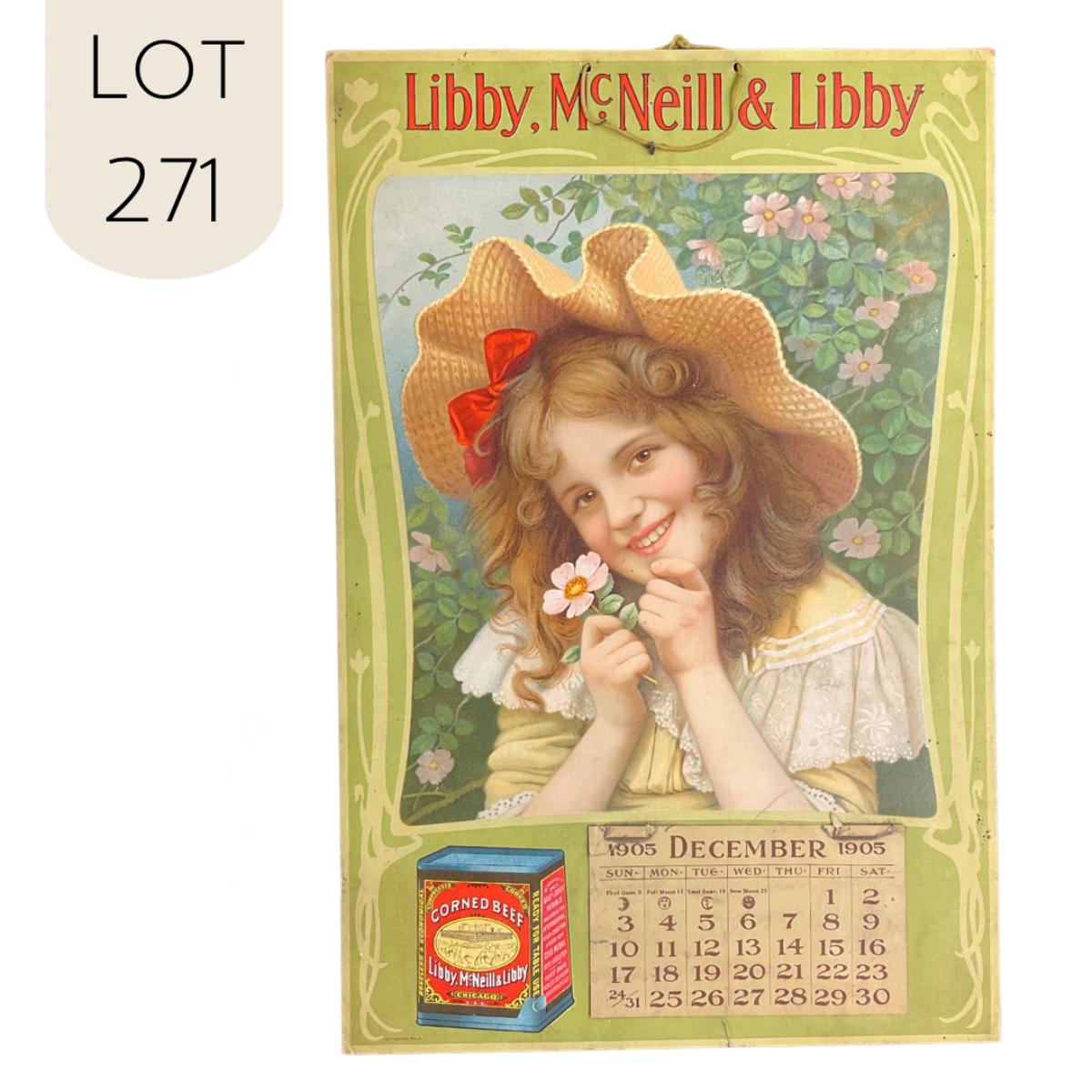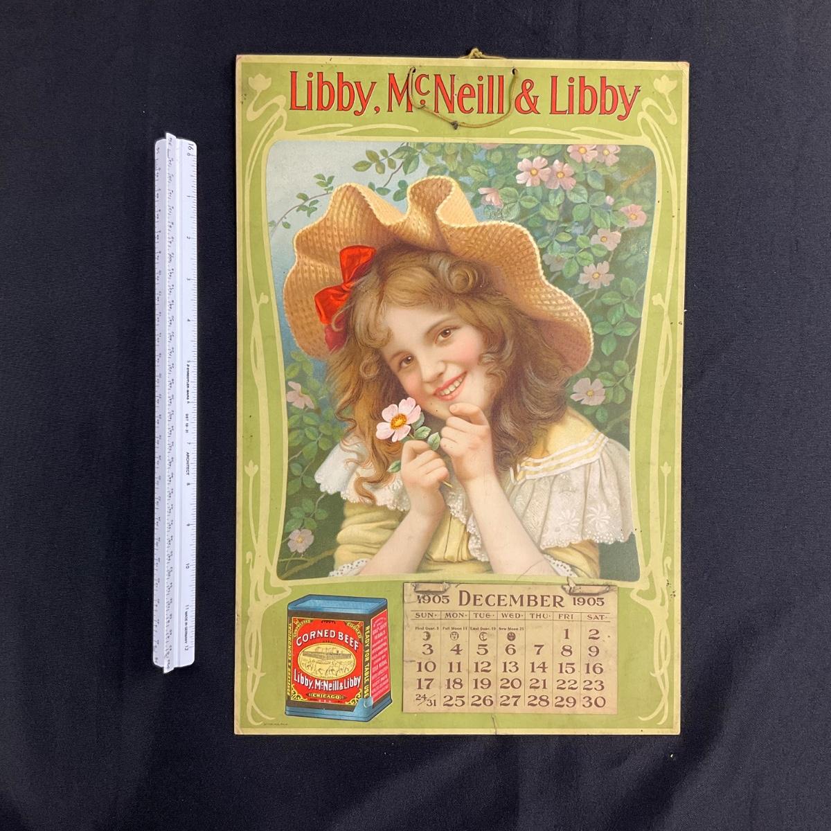 This calendar was made to promote Libby, McNeill & Libby Corned Beef, based in Chicago Illinois. This calendar is incomplete, showing December 1905. This calendar features a portrait of a girl in a straw hat with a single wild flower in her hands. This calendar measures 11" x 16 1/2". **|** Please see photos for details and condition. ::: Shipping is available on this lot. If you require shipping you must let us know at the close of the auction. We will coordinate with you after the item has been won. Shipping fees will include insurance up to or exceeding the value of all items being mailed. If you have any questions regarding this lot please contact the auctioneer either via this website, by direct email or by phone. PICK UP TIMES and other important information can be found in the TERMS and DESCRIPTION of the auction. Please take a look for pertinent information. Thanks!